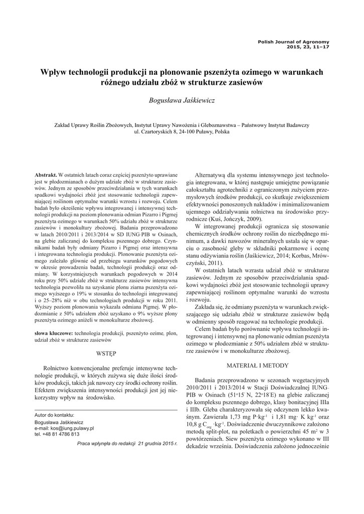 11 Polish Journal of Agronomy 2015, 23, 11–17 Wpływ technologii produkcji na plonowanie pszenżyta ozimego w warunkach różnego udziału zbóż w strukturze zasiewów Bogusława Jaśkiewicz Zakład Uprawy Roślin Zbożowych, Instytut Uprawy Nawożenia i Gleboznawstwa – Państwowy Instytut Badawczy ul. Czartoryskich 8, 24-100 Puławy, Polska Abstrakt. W ostatnich latach coraz częściej pszenżyto uprawiane jest w płodozmianach o dużym udziale zbóż w strukturze zasiewów. Jednym ze sposobów przeciwdziałania w tych warunkach spadkowi wydajności zbóż jest stosowanie technologii zapewniającej roślinom optymalne warunki wzrostu i rozwoju. Celem badań było określenie wpływu integrowanej i intensywnej technologii produkcji na poziom plonowania odmian Pizarro i Pigmej pszenżyta ozimego w warunkach 50% udziału zbóż w strukturze zasiewów i monokultury zbożowej. Badania przeprowadzono w latach 2010/2011 i 2013/2014 w SD IUNG_PIB w Osinach, na glebie zaliczanej do kompleksu pszennego dobrego. Czynnikami badań były odmiany Pizarro i Pigmej oraz intensywna i integrowana technologia produkcji. Plonowanie pszenżyta ozimego zależało głównie od przebiegu warunków pogodowych w okresie prowadzenia badań, technologii produkcji oraz odmiany. W korzystniejszych warunkach pogodowych w 2014 roku przy 50% udziale zbóż w strukturze zasiewów intensywna technologia pozwoliła na uzyskanie plonu ziarna pszenżyta ozimego wyższego o 19% w stosunku do technologii integrowanej i o 25–28% niż w obu technologiach produkcji w roku 2011. Wyższy poziom plonowania wykazała odmiana Pigmej. W płodozmianie z 50% udziałem zbóż uzyskano o 9% wyższe plony pszenżyta ozimego aniżeli w monokulturze zbożowej. słowa kluczowe: technologia produkcji, pszenżyto ozime, plon, udział zbóż w strukturze zasiewów WSTĘP Rolnictwo konwencjonalne preferuje intensywne technologie produkcji, w których zużywa się duże ilości środków produkcji, takich jak nawozy czy środki ochrony roślin. Efektem zwiększenia intensywności produkcji jest jej niekorzystny wpływ na środowisko. Autor do kontaktu: Bogusława Jaśkiewicz e-mail: [email protected] tel. +48 81 4786 813 Praca wpłynęła do redakcji 21 grudnia 2015 r. Alternatywą dla systemu intensywnego jest technologia integrowana, w której następuje umiejętne powiązanie całokształtu agrotechniki z ograniczonym zużyciem przemysłowych środków produkcji, co skutkuje zwiększeniem efektywności ponoszonych nakładów i minimalizowaniem ujemnego oddziaływania rolnictwa na środowisko przyrodnicze (Kuś, Jończyk, 2009). W integrowanej produkcji ogranicza się stosowanie chemicznych środków ochrony roślin do niezbędnego minimum, a dawki nawozów mineralnych ustala się w oparciu o zasobność gleby w składniki pokarmowe i ocenę stanu odżywiania roślin (Jaśkiewicz, 2014; Korbas, Mrówczyński, 2011). W ostatnich latach wzrasta udział zbóż w strukturze zasiewów. Jednym ze sposobów przeciwdziałania spadkowi wydajności zbóż jest stosowanie technologii uprawy zapewniającej roślinom optymalne warunki do wzrostu i rozwoju. Zakłada się, że odmiany pszenżyta w warunkach zwiększającego się udziału zbóż w strukturze zasiewów będą w odmienny sposób reagować na technologie produkcji. Celem badań było porównanie wpływu technologii integrowanej i intensywnej na plonowanie odmian pszenżyta ozimego w płodozmianie z 50% udziałem zbóż w strukturze zasiewów i w monokulturze zbożowej. MATERIAŁ I METODY Badania przeprowadzono w sezonach wegetacyjnych 2010/2011 i 2013/2014 w Stacji Doświadczalnej IUNG_ PIB w Osinach (51o15’ N, 22o18’E) na glebie zaliczanej do kompleksu pszennego dobrego, klasy bonitacyjnej IIIa i IIIb. Gleba charakteryzowała się odczynem lekko kwaśnym. Zawierała 1,73 mg P·kg-1 i 1,81 mg· K kg-1 oraz 10,8 g Corg ·kg-1. Doświadczenie dwuczynnikowe założono metodą split-plot, na poletkach o powierzchni 45 m2 w 3 powtórzeniach. Siew pszenżyta ozimego wykonano w III dekadzie września. Doświadczenia założono jednocześnie 12 Polish Journal of Agronomy, No. 23, 2015 Tabela 1. Zużycie materiału siewnego, nawozów i środków ochrony roślin w poszczególnych technologiach produkcji pszenżyta ozimego Table 1. Consumption of seeds, fertilizers, and pesticides in the winter triticale production technologies. Ilość wysiewu [mln ziarn·ha-1] Seeding rate Technologia mln of grains Technology per ha Pizaro Pigmej Integrowana Integrated Intensywna Intensive 4,5 4,0 Dawki Doses [kg·ha-1] N 131 165 P2O5 66 80 Herbicydy Herbicides K2O 71 92 Insektycy Insecticides Alister Grande 190 OD (0,8 l·ha-1) Aminopielik D 450 SL (3,0 l·ha-1) Lontrel 300 SL (0,5 l·ha-1) Decis 2,5 EC Alister Grande 190 (0,25 l·ha-1) -1 OD (0,8 l·ha ) Aminopielik D 450 SL (3,0 l·ha-1) na dwóch polach w istniejących wieloletnich doświadczeniach polowych w monokulturze zbożowej (pszenica ozima, pszenżyto ozime, jęczmień jary) i w płodozmianie z 50% udziałem zbóż (rzepak ozimy, pszenica ozima, bobik, pszenżyto ozime). Pierwszym czynnikiem doświadczenia była technologia produkcji – integrowana i intensywna. Czynnikiem drugiego rzędu była odmiana pszenżyta ozimego: Pigmej (forma krótkosłoma), Pizarro (o tradycyjnej długości słomy). Odmiany te pochodziły z różnych ośrodków hodowlanych, z Hodowli Roślin Strzelce odmiana Pigmej i z Hodowli Roślin DANKO w Choryni odmiana Pizarro. Zastosowane technologie różniły się między innymi poziomem nawożenia mineralnego i chemicznej ochrony roślin przed chwastami, chorobami i szkodnikami (tab. 1). W integrowanej technologii produkcji dawki nawozów potasowych i fosforowych były wyznaczone w oparciu o zawartość tych składników w glebie. Całkowitą dawkę azotu wyznaczono na podstawie przewidywanego plonu i warunków glebowych, uwzględniając rodzaj przedplonu i jego nawożenie. Wielkość pierwszej dawki (ruszenie wegetacji) uściś