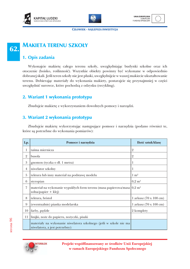 CZ£OWIEK – NAJLEPSZA INWESTYCJA 62. MAKIETA TERENU SZKO£Y 1. Opis zadania Wykonajcie makietê ca³ego terenu szko³y, uwzglêdniaj¹c budynki szkolne oraz ich otoczenie (boisko, roœlinnoœæ). Wszystkie obiekty powinny byæ wykonane w odpowiednio dobranej skali. Jeœli teren szko³y nie jest p³aski, uwzglêdnijcie w waszej makiecie ukszta³towanie terenu. Dobieraj¹c materia³y do wykonania makiety, postarajcie siê przynajmniej w czêœci uwzglêdniæ surowce, które pochodz¹ z odzysku (recykling). 2. Wariant 1 wykonania prototypu Zbudujcie makietê z wykorzystaniem dowolnych pomocy i narz¹dzi. 3. Wariant 2 wykonania prototypu Zbudujcie makietê wykorzystuj¹c nastêpuj¹ce pomoce i narzêdzia (podano równie¿ te, które s¹ potrzebne do wykonania pomiarów): Lp. Pomoce i narzêdzia 1 taœma miernicza 2 2 busola 2 3 gnomon (tyczka o d³. 1 metra) 1 4 niwelator szkolny 1 5 tektura lub inny materia³ na podstawê modelu 1 m2 6 styropian 0,2 m3 7 materia³ na wykonanie wypuk³ych form terenu (masa papierowa/masa 0,2 m3 solna/papier + klej) 8 tektura, bristol 1 arkusz (70 x 100 cm) 9 (ewentualnie) pianka modelarska 1 arkusz (70 x 100 cm) 10 farby, pêdzle strona 96 Iloœæ sztuk/klasê 2 komplety 11 linijki, no¿e do papieru, no¿yczki, pisaki materia³y na wykonanie niwelatora szkolnego (jeœli w szkole nie ma niwelatora, a jest potrzebny): Projekt wspó³finansowany ze œrodków Unii Europejskiej w ramach Europejskiego Funduszu Spo³ecznego CZ£OWIEK – NAJLEPSZA INWESTYCJA 12 listwa drewniana o przekroju 4 cm x 4 cm i d³ugoœci 96 cm 1 sztuka 13 listwa drewniana o przekroju 4 cm x 4 cm i d³ugoœci 50 cm 1 sztuka 14 pion 1 sztuka 15 gwoŸdzie 4–6 sztuk 16 k¹towniki metalowe 2 sztuki 4. Iloœæ bloków potrzebna do realizacji prototypu u Trzy bloki 1,5 h ka¿dy 5. Realizowane treœci podstawy programowej Matematyka Realizowana treœæ podstawy programowej 1. Liczby wymierne dodatnie. Uczeñ: 2. dodaje, odejmuje, mno¿y i dzieli liczby wymierne zapisane w postaci u³amków zwyk³ych lub rozwiniêæ dziesiêtnych skoñczonych zgodnie z w³asn¹ strategi¹ obliczeñ (tak¿e z wykorzystaniem kalkulatora); 6. oblicza wartoœci nieskomplikowanych wyra¿eñ arytmetycznych zawieraj¹cych u³amki zwyk³e i dziesiêtne 7. stosuje obliczenia na liczbach wymiernych do rozwi¹zywania problemów w kontekœcie praktycznym, w tym do zamiany jednostek (jednostek prêdkoœci, gêstoœci itp.) 2. Liczby wymierne (dodatnie i niedodatnie). Uczeñ: 4. dodaje, odejmuje, mno¿y i dzieli liczby wymierne 3. oblicza wartoœci nieskomplikowanych wyra¿eñ arytmetycznych zawieraj¹cych liczby wymierne 10. Figury p³askie. Uczeñ: 9. oblicza pola i obwody trójk¹tów i czworok¹tów 10. zamienia jednostki pola 11. oblicza wymiary wielok¹ta powiêkszonego lub pomniejszonego w danej skali strona 97 Przedmiot Projekt wspó³finansowany ze œrodków Unii Europejskiej w ramach Europejskiego Funduszu Spo³ecznego CZ£OWIEK – NAJLEPSZA INWESTYCJA Geografia 1. Mapa - umiejêtnoœci czytania, interpretacji i pos³ugiwania siê map¹. Uczeñ: 1. wykazuje znaczenie skali mapy w przedstawianiu ró¿nych informacji geograficznych na mapie; pos³uguje siê skal¹ mapy do obliczenia odleg³oœci w terenie 3. pos³uguje siê w terenie planem, map¹ topograficzn¹, turystyczn¹, samochodow¹ (m.in. orientuje mapê oraz identyfikuje obiekty geograficzne na mapie i w terenie) Informatyka 2. Wyszukiwanie i wykorzystywanie (gromadzenie, selekcjonowanie, przetwarzanie) informacji z ró¿nych Ÿróde³; wspó³tworzenie zasobów w sieci. Uczeñ: 1. pobiera informacje i dokumenty z ró¿nych Ÿróde³, w tym internetowych, ocenia pod wzglêdem treœci i formy ich przydatnoœæ do wykorzystania w realizowanych zadaniach i projektach Fizyka 8. Wymagania przekrojowe. Uczeñ: 12. Planuje doœwiadczenie lub pomiar, wybiera w³aœciwe narzêdzia pomiaru; mierzy: czas, d³ugoœæ… 6. Kszta³cone kompetencje u kompetencje matematyczne i podstawowe kompetencje naukowo-techniczne, u umiejêtnoœæ uczenia siê, u kompetencje informatyczne. 7. Cele zajêæ blokowych u zaplanowanie koniecznych do realizacji zadania dzia³añ, u zgromadzenie niezbêdnych przyrz¹dów, u samodzielne wykonanie niwelatora (jeœli szko³a nie posiada instrumentu, a jest potrzeba u u u strona 98 u wykonania pomiarów wysokoœci) wykonanie niezbêdnych pomiarów budynku i innych obiektów na terenie szko³y, wyznaczenie kierunku pó³nocnego przy pomocy busoli oraz okreœlenie azymutów obiektów, obliczenie wielkoœci elementów makiety w odpowiedniej skali, wykonanie makiety. Projekt wspó³finansowany ze œrodków Unii Europejskiej w ramach Europejskiego Funduszu Spo³ecznego CZ£OWIEK – NAJLEPSZA INWESTYCJA 8. Oczekiwane osi¹gniêcia ucznia Po ukoñczeniu lekcji uczeñ: u wyjaœni sposoby pomiaru wysokoœci wzglêdnej form terenu, wysokoœci budynków i drzew, u zmierzy wysokoœci w terenie, u zmierzy odleg³oœci w terenie, u wyznaczy kierunek pó³nocny, u wyznaczy azymuty obiektów na terenie nale¿¹cym do szko³y, u pos³u¿y siê skal¹ do obliczenia odleg³oœci na makiecie, u wykona makietê budynku szko³y i innych obiektów po³o¿onych na terenie nale¿¹cym do szko³y. 9. Przyk³adowe rozwi¹zanie wariantu 2 – opis dzia³añ 9.1 (Pierwsze zajêcia) Czas trwania w min Opis kolejnych dzia³añ 1 Zapoznanie siê uczniów z zadaniem, który maj¹ wykonaæ. 2 Zaplanowanie sposobu realizacji zadania, 1. Uczniowie wspólnie opracowuj¹ zakres 15 min opracowanie przez uczniów listy dzia³añ. tematyczny oraz sposób realizacji zadania („burza mózgów”). 2. Uczniowie porz¹dkuj¹ wypisane zadania w grupy tematyczne. 3. Uczniowie wybieraj¹ zadanie, które bêd¹ realizowaæ. W ten sposób powstan¹ w klasie grupy zadaniowe (np. pomiary wysokoœci). Poniewa¿ zadanie bêdzie realizowane w czasie 3 spotkañ, nale¿y tak ustaliæ zadania grup, aby ka¿dy uczeñ wykonywa³ okreœlone zadanie w czasie wszystkich spotkañ. Nale¿y równie¿ tak 