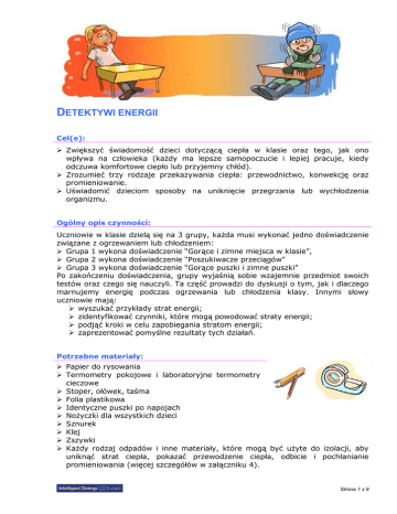 DETEKTYWI ENERGII Cel(e): Zwiększyć świadomość dzieci dotyczącą ciepła w klasie oraz tego, jak ono wpływa na człowieka (kaŜdy ma lepsze samopoczucie i lepiej pracuje, kiedy odczuwa komfortowe ciepło lub przyjemny chłód). Zrozumieć trzy rodzaje przekazywania ciepła: przewodnictwo, konwekcję oraz promieniowanie. Uświadomić dzieciom sposoby na uniknięcie przegrzania lub wychłodzenia organizmu. Ogólny opis czynności: Uczniowie w klasie dzielą się na 3 grupy, kaŜda musi wykonać jedno doświadczenie związane z ogrzewaniem lub chłodzeniem: Grupa 1 wykona doświadczenie “Gorące i zimne miejsca w klasie”, Grupa 2 wykona doświadczenie “Poszukiwacze przeciągów” Grupa 3 wykona doświadczenie “Gorące puszki i zimne puszki” Po zakończeniu doświadczenia, grupy wyjaśnią sobie wzajemnie przedmiot swoich testów oraz czego się nauczyli. Ta część prowadzi do dyskusji o tym, jak i dlaczego marnujemy energię podczas ogrzewania lub chłodzenia klasy. Innymi słowy uczniowie mają: wyszukać przykłady strat energii; zidentyfikować czynniki, które mogą powodować straty energii; podjąć kroki w celu zapobiegania stratom energii; zaprezentować pomyślne rezultaty tych działań. Potrzebne materiały: Papier do rysowania Termometry pokojowe i laboratoryjne termometry cieczowe Stoper, ołówek, taśma Folia plastikowa Identyczne puszki po napojach NoŜyczki dla wszystkich dzieci Sznurek Klej Zszywki KaŜdy rodzaj odpadów i inne materiały, które mogą być uŜyte do izolacji, aby uniknąć strat ciepła, pokazać przewodzenie ciepła, odbicie i pochłanianie promieniowania (więcej szczegółów w załączniku 4). Strona 1 z 9 Wymagane umiejętności uczniów: Liczenie, mierzenie temperatury, podstawowe zdolności do rysowania (w tym wykresów), umiejętność pracy w grupie. Dopasowanie zadania do programu nauczania: Doświadczenia i badania naukowe, plastyka (umiejętność pokazania swojego otoczenia), matematyka, fizyka (trzy rodzaje przekazywania ciepła). Bezpieczeństwo zajęć: Uczniowie powinni potrafić posługiwać się noŜyczkami, ołówkiem i linijką). NaleŜy zwrócić uwagę, aby nie wylali kleju, mydła itp. Poszczególne działania w ramach zajęć: Czas zajęć: 1. Przedstawienie pojęcia „ciepło” jako formy energii i sposobów ~ 30 minut jego przenikania z cieplejszych do zimniejszych materiałów. WaŜne, aby podkreślić róŜnice między pojęciami „ciepło” i “temperatura”. MoŜna przedyskutować rolę ciepła w Ŝyciu codziennym i jak człowiek zapewnia sobie komfort cieplny (np. ogrzewanie i chłodzenie pomieszczeń). ~1h 2. Podział uczniów na trzy grupy prowadzące badania: Grupa A – “Gorące i zimne miejsca w klasie” Grupa B – “Poszukiwacze przeciągów” Grupa C – “Gorące i zimne puszki”. 3. Oznaczenie kaŜdej grupy innym kolorem nalepek celem ich wyróŜnienia. 4. Przekazanie wskazówek i materiałów kaŜdej z grup: Wskazówki 1 dla Grupy A Wskazówki 2 i 3 dla Grupy B Wskazówki 4, 5 i 6 dla Grupy C. Udzielenie wyjaśnień, do czego słuŜą wskazówki i materiały. 5. Grupy prowadzą doświadczenia. NaleŜy się im pomagać, ~ 1,5 h w szczególności w określeniu czasu trwania kaŜdej czynności. Uwaga doświadczenie Grupy A najlepiej wykonać rano, zanim budynek szkolny się rozgrzeje, aby móc wykazać większe róŜnice temperatur. 6. Zwołać spotkanie trzech “Specjalnych grup dochodzeniowych ~ 2 h w sprawie energii” wyznaczonych wcześniej. KaŜda z grup ma wyjaśnić pozostałym, co i jak badała. Nauczyciel nakierowuje prezentacje na następujące obserwacje: Gdzie i kiedy następują straty ciepła? Jakie są wspólne punkty w ustaleniach trzech grup, co do czasu i miejsca strat ciepłą? Kto jest “winowajcą” i “podejrzanym”? Strona 2 z 9 Gdzie i kiedy są największe ruchy powietrza? Jak skutecznie izolować zimne i ciepłe przedmioty? 7. Wybrani uczniowie podają definicje pojęć: przewodnictwo, konwekcja i promieniowanie, zapisując je na tablicy dla lepszego przyswojenia. 8. Zajęcia pomogą teŜ odpowiedzieć na pytania ogólne, np.: Co moŜna zrobić, by oszczędnie wykorzystywać energię? Jak dzieci i dorośli mogą zapobiegać jej stratom? ~4h Sugestie innych zadań AL.: „Dom energii” Odmiany: Zajęcia mogą być podstawą do popularyzacji w szkole, np. poprawy warunków cieplnych w klasach, pomiarów strat ciepła we wszystkich pomieszczeniach szkolnych. Dostępne pomoce: Załącznik 1 – Wskazówki dla Grupy A - “Gorące i zimny miejsca w klasie” Załącznik 2 – Wskazówki dla Grupy B - “Poszukiwacze przeciągów” Załącznik 3 – Lista przeciągów w klasie Załącznik 4 – Pojemnik na uŜyteczne odpady Załącznik 5 – Tabela przewodnictwa cieplnego róŜnych materiałów Załącznik 6 – Wskazówki dla Grupy C - “Gorące puszki i zimne puszki” Strona 3 z 9 Detektywi energii – Załącznik 1 Wskazówki dla Grupy A - „Gorące i zimne miejsca w klasie” Wziąć kartkę papieru rysunkowego. Narysować plan klasy w rzucie z góry. Określić, które miejsca w klasie będą najbardziej gorące i najzimniejsze. Oznaczyć te miejsca literami G lub Z na planie, gdzie: ― G to gorące miejsce, ― Z to zimne miejsce. Umieścić termometry do mierzenia temperatury powietrza w następujących miejscach klasy: ― przy oknach ― przy grzejniku ― przy wentylatorze ― przy podłodze ― w szafie ― przy drzwiach. Mierzyć temperaturę w jednakowych odstępach czasu (np., co 5-10 minut) i zapisywać wyniki pomiarów. Określić zmiany temperatury w kaŜdym z wymienionych miejsc. Po zmierzeniu temperatury porównać, czy na początku dobrze określono gorące i zimne miejsca w sali. Omówić, jak moŜna wykorzystać gorące i zimne miejsca do ogrzania (ochłodzenia) się. Narysować nowy plan klasy i zaznaczyć gorące i zimne miejsca zgodnie z pomiarami. Strona 4 z 9 Detektywi energii – Załącznik 2 Wskazówki for Grupa B - “Pos