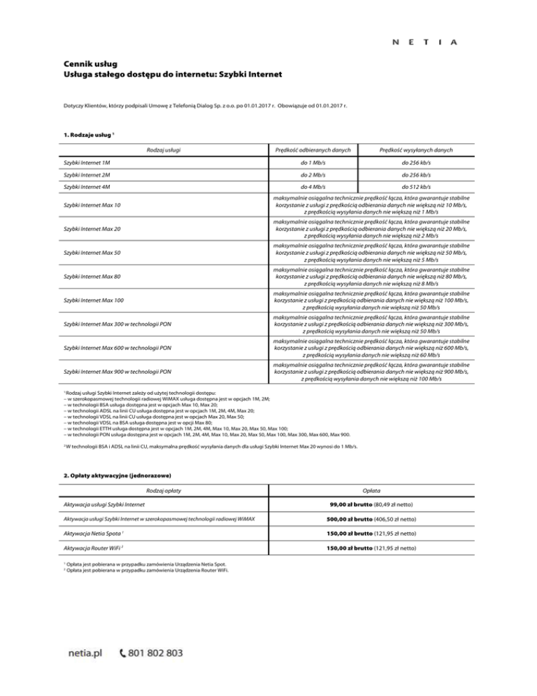 Cennik usług Usługa stałego dostępu do internetu: Szybki Internet Dotyczy Klientów, którzy podpisali Umowę z Telefonią Dialog Sp. z o.o. po 01.01.2017 r. Obowiązuje od 01.01.2017 r. 1. Rodzaje usług 1 Rodzaj usługi Prędkość odbieranych danych Prędkość wysyłanych danych Szybki Internet 1M do 1 Mb/s do 256 kb/s Szybki Internet 2M do 2 Mb/s do 256 kb/s do 4 Mb/s do 512 kb/s Szybki Internet 4M Szybki Internet Max 10 maksymalnie osiągalna technicznie prędkość łącza, która gwarantuje stabilne korzystanie z usługi z prędkością odbierania danych nie większą niż 10 Mb/s, z prędkością wysyłania danych nie większą niż 1 Mb/s Szybki Internet Max 20 maksymalnie osiągalna technicznie prędkość łącza, która gwarantuje stabilne korzystanie z usługi z prędkością odbierania danych nie większą niż 20 Mb/s, z prędkością wysyłania danych nie większą niż 2 Mb/s Szybki Internet Max 50 maksymalnie osiągalna technicznie prędkość łącza, która gwarantuje stabilne korzystanie z usługi z prędkością odbierania danych nie większą niż 50 Mb/s, z prędkością wysyłania danych nie większą niż 5 Mb/s Szybki Internet Max 80 maksymalnie osiągalna technicznie prędkość łącza, która gwarantuje stabilne korzystanie z usługi z prędkością odbierania danych nie większą niż 80 Mb/s, z prędkością wysyłania danych nie większą niż 8 Mb/s Szybki Internet Max 100 maksymalnie osiągalna technicznie prędkość łącza, która gwarantuje stabilne korzystanie z usługi z prędkością odbierania danych nie większą niż 100 Mb/s, z prędkością wysyłania danych nie większą niż 50 Mb/s Szybki Internet Max 300 w technologii PON maksymalnie osiągalna technicznie prędkość łącza, która gwarantuje stabilne korzystanie z usługi z prędkością odbierania danych nie większą niż 300 Mb/s, z prędkością wysyłania danych nie większą niż 50 Mb/s Szybki Internet Max 600 w technologii PON maksymalnie osiągalna technicznie prędkość łącza, która gwarantuje stabilne korzystanie z usługi z prędkością odbierania danych nie większą niż 600 Mb/s, z prędkością wysyłania danych nie większą niż 60 Mb/s Szybki Internet Max 900 w technologii PON maksymalnie osiągalna technicznie prędkość łącza, która gwarantuje stabilne korzystanie z usługi z prędkością odbierania danych nie większą niż 900 Mb/s, z prędkością wysyłania danych nie większą niż 100 Mb/s 1 Rodzaj usługi Szybki Internet zależy od użytej technologii dostępu: – w szerokopasmowej technologii radiowej WiMAX usługa dostępna jest w opcjach 1M, 2M; – w technologii BSA usługa dostępna jest w opcjach Max 10, Max 20; – w technologii ADSL na linii CU usługa dostępna jest w opcjach 1M, 2M, 4M, Max 20; – w technologii VDSL na linii CU usługa dostępna jest w opcjach Max 20, Max 50; – w technologii VDSL na BSA usługa dostępna jest w opcji Max 80; – w technologii ETTH usługa dostępna jest w opcjach 1M, 2M, 4M, Max 10, Max 20, Max 50, Max 100; – w technologii PON usługa dostępna jest w opcjach 1M, 2M, 4M, Max 10, Max 20, Max 50, Max 100, Max 300, Max 600, Max 900. 2 W technologii BSA i ADSL na linii CU, maksymalna prędkość wysyłania danych dla usługi Szybki Internet Max 20 wynosi do 1 Mb/s. 2. Opłaty aktywacyjne (jednorazowe) Rodzaj opłaty Aktywacja usługi Szybki Internet Opłata 99,00 zł brutto (80,49 zł netto) Aktywacja usługi Szybki Internet w szerokopasmowej technologii radiowej WiMAX 500,00 zł brutto (406,50 zł netto) Aktywacja Netia Spota 1 150,00 zł brutto (121,95 zł netto) 2 150,00 zł brutto (121,95 zł netto) Aktywacja Router WiFi 1 2 Opłata jest pobierana w przypadku zamówienia Urządzenia Netia Spot. Opłata jest pobierana w przypadku zamówienia Urządzenia Router WiFi. Cennik usług Usługa stałego dostępu do internetu: Szybki Internet 3. Opłaty abonamentowe (miesięczne) Rodzaj usługi Opłata Szybki Internet 1M 135,30 zł brutto (110,00 zł netto) Szybki Internet 2M 172,20 zł brutto (140,00 zł netto) Szybki Internet 4M 209,10 zł brutto (170,00 zł netto) Szybki Internet Max 10 282,90 zł brutto (230,00 zł netto) Szybki Internet Max 20 356,70 zł brutto (290,00 zł netto) Szybki Internet Max 50 430,50 zł brutto (350,00 zł netto) Szybki Internet Max 80 430,50 zł brutto (350,00 zł netto) Szybki Internet Max 100 430,50 zł brutto (350,00 zł netto) Szybki Internet Max 300 w technologii PON 430,50 zł brutto (350,00 zł netto) Szybki Internet Max 600 w technologii PON 430,50 zł brutto (350,00 zł netto) Szybki Internet Max 900 w technologii PON 430,50 zł brutto (350,00 zł netto) 4. Opłaty za usługi i czynności dodatkowe A. Opłata za utrzymanie łącza – dotyczy technologii BSA Rodzaj usługi Opłata za utrzymanie łącza 1 1 Sposób naliczania Opłata Opłata miesięczna 30,00 zł brutto (24,39 zł netto) Opłata pobierana jest w przypadku posiadania Usługi Internetowej i braku na tym samym łączu Usługi Telefonicznej świadczonej przez Operatora lub innego dostawcę. 5. Pozostałe opłaty Rodzaj usługi Dzierżawa Netia Spota Kara za niezwrócenie Netia Spota 1 Dzierżawa routera WiFi Kara za niezwrócenie routera WiFi 1 Sposób naliczania Opłata Opłata miesięczna 20,00 zł brutto (16,26 zł netto) Opłata jednorazowa 200,00 zł brutto (162,60 zł netto) Opłata miesięczna 20,00 zł brutto (16,26 zł netto) Opłata jednorazowa 400,00 zł brutto (325,20 zł netto) 1 Urządzenia są udostępniane Abonentowi przez Operatora, w przypadku rozwiązania Umowy w zakresie Usługi Internetowej Abonent zobowiązany jest do zwrócenia na własny koszt udostępnionego urządzenia w ciągu 14 dni od daty rozwiązania Umowy. 6. Definicje A. BSA – Usługa Internetowa świadczona przez Operatora na łączu Orange Polska S.A. w oparciu o Bitstream Access. B. LLU – Usługa Internetowa świadczona przez Operatora na łączu Orange Polska S.A. poprzez dostęp do lokalnej pętli abonenckiej