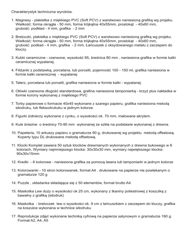 Charakterystyk techniczna wyrobów. 1. Magnesy - plakietka z miękkiego PVC (Soft PCV) z warstwowo naniesioną grafiką wg projeku. Wielkość: forma okrągła - 50 mm, forma trójkątna 40x55mm, prostokąt - 40x60 mm, grubość: podkład - 4 mm, grafika - 2 mm 2. Breloczki, plakietka z miękkiego PVC (Soft PCV) z warstwowo naniesioną grafiką wg projeku. Wielkość: forma okrągła - 50 mm, forma trójkątna 40x55mm, prostokąt - 40x60 mm, grubość: podkad - 4 mm, grafika - 2 mm, Łańcuszek z oksydowanego metalu z zaczepem do kluczy. 3. Kubki ceramiczne - czerwone, wysokość 95, średnica 80 mm , naniesiona grafika w formie kalki ceramicznej wypalanej. 4. Filiżanki z podstawką, porcelana, lub porcelit, pojemność 100 - 150 ml, grafika naniesiona w formie kalki ceramicznej - wypalanej 5. Talerz, porcelana lub porcelit, grafika naniesiona w formie kalki - wypalanej. 6. Ołówki czerwone długość standardowa, grafina naniesiona tamponiarką - krzyż plus nakładka w formie korony wykonanej z miękkiego PVC 7. Torby papierowe o formacie 40x45 wykonane z szarego papieru, grafika naniesiona metodą sitodruku, lub fleksodrukuku w jednym kolorze. 8. Figurki żołnierzy wykonane z cynku, o wysokości ok. 70 mm, malowane akrylem. 9. Kule śnieżne o średnicy 70-90 mm wykonanej ze szkła na podstawie wykonanej z drewna. 10. Papeteria, 10 arkuszy papieru o gramaturze 90 g, drukowanej wg projektu metodą offsetową. Koperty typu DL drukowane metodą offsetową. 11. Klocki Komplet zawiera 50 sztuk klocków drewnianych wykonanych z drewna bukowego w 6 kolorach, Wymiary najmniejszego klocka: 30x30x30 mm, wymiary największego klocka: 90x30x15mm 12. Kredki - 6 kolorowe - naniesiona grafika za pomocą lasera lub tamponiarki w jednym kolorze 13. Kolorowanki - 10 stron kolorowanek, format A4 , drukowane na papierze nie powlekanym o gramaturze 120 g 14. Puzzle , układanka składająca się z 50 elementów, format brutto A4. 15. Maskotka Lew duży o wysokości ok 25 cm, wykonany z tkaniny poliestrowej z koszulką z bawełny z grafiką (sitodruk) 16. Maskotka - breloczek lew o wysokości ok. 9 cm z łańcuszkiem z zaczepem do kluczy, grafika na koszulce wykonana w technice sitodruku 17. Reprodukcje zdjęć wykonane techniką cyfrową na papierze satynowym o gramaturze 160 g. Format A2, A4, A5 18. Obrusy z poliestru o średnicy 80 i 25 cm, grafika naniesiona na tkaninę w formie druku termotransferowego 19. Kieliszki i karafka wykonana ze szkła, grafika naniesiona za pomocą wypalanej kalki. 20. Papierośnice metalowe - grafika naniesiona poprzez wypalanie wzoru laserem YAG 21. Koszulki bawełaniane o gramaturze 250 - 300 g, grafika naniesiona metoda sitodruku. 22. Czapki bawełniane, grafika naniesiona za pomocą sitodruku lub wyszywania maszynowego. 23. Kufel ceramiczny - pokryty glazurą - pojemność ok. 0,5 l. 24. Zakładki do książki, pasek tworzywa HIPS, format 40x180 mm, grafika naniesiona metodą sitodruku, herb Gdańska wycięty wykrojnikiem lub laserem. 25. Torba bawełniana o formacie 40x45 cm, grafika naniesiona metodą sitodruku 26. Dzbanek i kubek metalowy - emaliowany, grafika naniesiona za pomocą kalki ceramicznej wypalanej