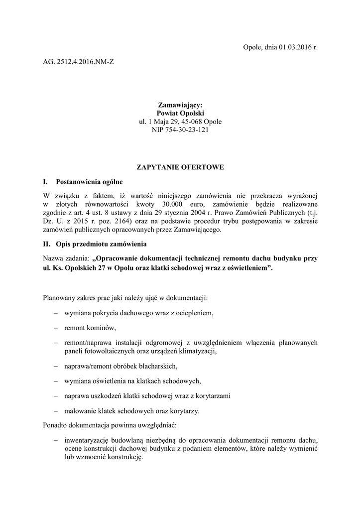 Opole, dnia 01.03.2016 r. AG. 2512.4.2016.NM-Z Zamawiający: Powiat Opolski ul. 1 Maja 29, 45-068 Opole NIP 754-30-23-121 ZAPYTANIE OFERTOWE I. Postanowienia ogólne W związku z faktem, iż wartość niniejszego zamówienia nie przekracza wyrażonej w złotych równowartości kwoty 30.000 euro, zamówienie będzie realizowane zgodnie z art. 4 ust. 8 ustawy z dnia 29 stycznia 2004 r. Prawo Zamówień Publicznych (t.j. Dz. U. z 2015 r. poz. 2164) oraz na podstawie procedur trybu postępowania w zakresie zamówień publicznych opracowanych przez Zamawiającego. II. Opis przedmiotu zamówienia Nazwa zadania: „Opracowanie dokumentacji technicznej remontu dachu budynku przy ul. Ks. Opolskich 27 w Opolu oraz klatki schodowej wraz z oświetleniem”. Planowany zakres prac jaki należy ująć w dokumentacji: wymiana pokrycia dachowego wraz z ociepleniem, remont kominów, remont/naprawa instalacji odgromowej z uwzględnieniem włączenia planowanych paneli fotowoltaicznych oraz urządzeń klimatyzacji, naprawa/remont obróbek blacharskich, wymiana oświetlenia na klatkach schodowych, naprawa uszkodzeń klatki schodowej wraz z korytarzami malowanie klatek schodowych oraz korytarzy. Ponadto dokumentacja powinna uwzględniać: inwentaryzację budowlaną niezbędną do opracowania dokumentacji remontu dachu, ocenę konstrukcji dachowej budynku z podaniem elementów, które należy wymienić lub wzmocnić konstrukcję. częściową inwentaryzację budowlaną budynku zawierającą zwymiarowane rzuty wszystkich kondygnacji z zaznaczonymi zakończeniami mediów (woda i kanalizacja) oraz urządzeniami sanitarnymi i zaznaczonymi zakończeniami wentylacji grawitacyjnej. Budynek przy ul. Ks. Opolskich stanowi własność Powiatu Opolskiego, budynek ten znajduje się w strefie ochrony konserwatora zabytków. Starostwo Powiatowe w Opolu nie posiada żadnej dokumentacji inwentaryzacyjnej obiektu, posiada jedynie dokumentację instalacji wewnętrznych i teletechnicznych (do wglądu). Na dachu mają być umieszczone panele fotowoltaiczne (Zamawiający posiada stosowną dokumentację dotyczącą instalacji fotowoltaicznej). W dokumentacji dotyczącej remontu dachu należy ten fakt uwzględnić, jak również należy uwzględnić podłączenie instalacji fotowoltaicznej do instalacji odgromowej. Przedmiotem zamówienia jest: 1) Projekt budowlany zgodny z przepisami prawa budowlanego, rozporządzeniem Ministra Transportu, Budownictwa i Gospodarki Morskiej z dnia 25 kwietnia 2012 r. w sprawie szczegółowego zakresu i formy projektu budowlanego (Dz.U.2012 poz. 462) oraz Rozporządzenie Ministra Infrastruktury z dnia 2 września 2004 r. w sprawie szczegółowego zakresu i formy dokumentacji projektowej, specyfikacji technicznych wykonania i odbioru robót budowalnych oraz programu funkcjonalno – użytkowego (t.j. Dz.U. 2013 poz. 1129) w ilości 5 egzemplarzy w formie pisemnej oraz 1 egzemplarz w formie elektronicznej w formacie PDF. 2) Projekt wykonawczy zgodny z rozporządzeniem Ministra Infrastruktury z dnia 2 września 2004 r. w sprawie szczegółowego zakresu i formy dokumentacji projektowej, specyfikacji technicznej wykonania zakresu i formy dokumentacji projektowej, specyfikacji technicznych wykonania i odbioru robót budowalnych oraz programu funkcjonalno – użytkowego (t.j Dz.U. 2013 poz. 1129) w ilości 5 egzemplarzy w formie pisemnej oraz 1 egzemplarza w formie elektronicznej w formacie PDF. Zakres i stopień dokładności projektu wykonawczego musi być wystarczający do sporządzenia przedmiaru robót, kosztorysu inwestorskiego oraz przygotowania oferty przez wykonawcę robót. Dopuszcza się opracowanie zawierające zakres określony w pkt. 2). i 3). tj. projekt budowlano - wykonawczy. 3) Specyfikacje techniczne wykonania i odbioru robót budowlanych w oparciu o rozporządzenie Ministra Infrastruktury z dnia 2 września 2004 r. w sprawie szczegółowego zakresu i formy dokumentacji projektowej, specyfikacji technicznych wykonania i odbioru robót budowlanych oraz programu funkcjonalno-użytkowego (t.j. Dz.U.2013 poz. 1129) w ilości 5 egzemplarzy w formie pisemnej oraz 1 egzemplarza w formie elektronicznej w formacie PDF. 4) Przedmiary robót w oparciu o rozporządzenie Ministra Infrastruktury z dnia 2 września 2004 r. w sprawie szczegółowego zakresu i formy dokumentacji projektowej, specyfikacji technicznych wykonania i odbioru robót budowlanych oraz programu funkcjonalno-użytkowego (t.j. Dz.U. 2013 poz. 1129) w ilości 5 egzemplarzy w formie pisemnej oraz 1 egzemplarza w formie elektronicznej w formacie Adobe Acrobat Reader (*.pdf) oraz w rozszerzeniu (*.xls). 5) Kosztorys inwestorski w oparciu o rozporządzenie Ministra Infrastruktury z dnia 18 maja 2004 r. w sprawie określenia metod i podstaw sporządzania kosztorysu inwestorskiego, obliczania planowanych kosztów prac projektowych oraz planowanych kosztów robót budowlanych określonych w programie funkcjonalno-użytkowym (Dz.U.2004 nr 130 poz. 1389) w ilości 4 egzemplarzy w formie pisemnej oraz 1 egzemplarza w formie elektronicznej w formacie PDF. 6) Informacja dotycząca bezpieczeństwa i ochrony zdrowia (BIOZ) - zgodnie z art. 20 ust. 1 pkt 1b) ustawy z dnia 07 lipca 1994 r. Prawo budowlane (t.j. Dz.U.2013 poz. 1409 ze zm.) w ilości 5 egzemplarzy w formie pisemnej oraz 1 egzemplarza w formie elektronicznej w formacie PDF. 7) Efekt ekologiczny w ilości 5 egzemplarzy w formie pisemnej oraz 1 egzemplarza w formie elektronicznej w formacie PDF 8) Inwentaryzację budowlaną w ilości 2 egzemplarzy w formie pisemnej oraz 1 egzemplarza w formie elektronicznej w formacie PDF i DWG. Wszystkie opracowania Wykonawca zobowiązany jest wykonać zgodnie z przepisami prawa, w tym aktualnie obowiązującymi przepisami techniczno – budowlanymi i obowiązującymi normami, a także zasadami wiedzy technicznej oraz przy zastosowaniu nowoczesnych rozwiązań racjonalizujących koszty budowy i eksploatacji obiektu. Rozwiązania technologiczne zawarte 