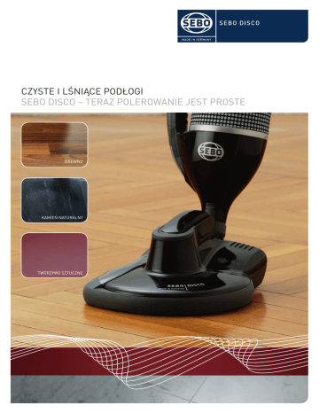 CZYSTE I LŚNIA˛CE PODŁOGI SEBO DISCO – TERAZ POLEROWANIE JEST PROSTE drewno kamień naturalny TWORZYWO SZTUCZNE SEBO DISCO TAKżE TWOJA PODŁOGA MOżE PIęKNIE LśNIć Nigdy wcześniej uzyskanie połysku twardych powierzchni nie było tak łatwe*. Teraz jest to możliwe dzięki polerce SEBO DISCO. Innowacyjny system Ultra High Speed (UHS) w SEBO DISCO wykorzystuje wiele opatentowanych rozwiązań i technologii. Wkład polerujący automatycznie ustawia się na odpowiedniej wysokości, błyskawicznie dostosowując się do polerowanej powierzchni. Prędkość 2000 obrotów na minutę, odpowiednio dobrany pad oraz jednoczesne odkurzanie polerowanej powierzchni gwarantują doskonały efekt połysku wypolerowanej podłogi bez zbędnego wysiłku i użycia środków chemicznych. Polerowanie z jednoczesnym odkurzaniem › Przezroczysty kanał ssący pozwala zobaczyć, jak kurz znika wciągany przez polerkę. › Łatwość wyjęcia, umycia i ponownego zamontowania pokrywy kanału. TWORZYWO SZTUCZNE Do pielęgnacji podłóg PCV i lakierowanych Innowacyjna technologia dla efektu lśniącej podłogi › Nowe pady polerujące SEBO wykonane z najwyższej jakości materiałów zapewniają doskonały połysk. › Zielony pad polerujący SEBO może być stosowany do wszystkich rodzajów twardych podłóg. Opatentowana konstrukcja polerki pozwala szybko i prosto wymienić wkład polerujący. * 2 Prosimy zwrócić uwagę na zalecenia producenta podłóg i o zapoznanie się z instrukcją obsługi SEBO DISCO. DREWNO Na zdjęciu: SEBO FELIX + DISCO Wygodne manewrowanie bez śladu zarysowań › Polerka SEBO DISCO dzięki niezwykle zwrotnemu przegubowi, umożliwiającemu pracę urządzenia pod kątem 90° w pionie i 180° w poziomie, zapewnia doskonałą zwrotność i ułatwia sprzątanie wokół przeszkód. › Wyposażona w gumowe kółka chroni podłogę przed porysowaniem. Automatyczne dostosowanie do każdej podłogi › W momencie zmiany polerowanej powierzchni, np. z parkietu na kamień naturalny bądź PCV, SEBO DISCO natychmiast reguluje optymalną wysokość pracy w danej chwili. Dzięki temu korzystanie z polerki jest łatwe i bezpieczne. Zabezpieczenie przed uszkodzeniem › Miękkie, gumowe zderzaki w trakcie polerowania idealnie chronią samo urządzenie, jak również meble i ściany przed uderzeniami, uszkodzeniami i porysowaniem. Do pielęgnacji i utrzymania jedwabistego wyglądu parkietu i innych podłóg drewnianych KAMIEŃ NATURALNY Do pielęgnacji i utrzymania połysku podłóg z naturalnego kamienia, takich jak polerowany marmur lub granit POŁYSK BEZ WYSIŁKU I śRODKÓW CHEMICZNYCH Polerka SEBO DISCO poleruje efektywnie i łatwo nawet w małych pomieszczeniach i między meblami. Jest łatwa w obsłudze, idealna do domu. Regularne polerowanie podłóg, nawet bez użycia środków chemicznych, nadaje im piękny połysk oraz konserwuje i zapewnia długotrwałe użytkowanie. 3 PROGRAM PIELęGNACYJNY DISCO Innowacyjny system pielęgnacji SEBO DISCO składa się czterech padów polerujących: ›d o parkietu, ›k amienia naturalnego, › l inoleum/PCV › i nnych twardych powierzchni*. Pad czerwony i żółty (komplet)* Czerwonym padem (1) polerujemy wyraźne ślady 1 użytkowania na powierzchniach podłóg, mocne zarysowania. W następnej kolejności w celu uzyskania idealnego połysku używamy padu żółtego (2) i zielonego (3). 2 Każdy kolor przeznaczony jest do konkretnego zastosowania. Pady są bardzo odporne na ścieranie, każdym z nich można wypolerować do 10 000 m2 powierzchni. 3 Pad zielony* (w wyposażeniu standardowym SEBO DISCO) Uniwersalny pad do regularnego stosowania i codziennej pielęgnacji podłóg twardych. Polerowanej powierzchni nadaje wysoki połysk. Pad niebieski* Specjalista od drewnianych podłóg woskowanych lub olejowanych. 4 Prosimy zapoznać się z zaleceniami producenta podłóg oraz instrukcją obsługi SEBO DISCO. Przed rozpoczęciem polerowania należy starannie oczyścić powierzchnię z zabrudzeń, zwłaszcza piasku. * marka SEBO – PERFEKCYJNa DO ODKURZANIA I POLEROWANIA Odkurzacze SEBO to idealne urządzenia do kompleksowej pielęgnacji wszelkiego rodzaju powierzchni, niezwykle ekonomiczne i wygodne w użytkowaniu. SEBO DISCO jest kompatybilna z następującymi urządzeniami: SEBO FELIX, SEBO AIRBELT K i SEBO AIRBELT D. Kolory › Czarny › Jasnoszary › Kość słoniowa SEBO DISCO z odkurzaczem serii Airbelt K SEBO DISCO z odkurzaczem serii Felix Dane techniczne SEBO DISCO: moc silnika: 200 W, prędkość: 2000 obr./min, szerokość robocza: 30 cm, waga: 3,9 kg. Nie zaleca się stosowania na podłogach z fakturą i nierównościami. Twój lokalny przedstawiciel: SEBO POLSKA Sp. z o.o. | Oddzial Warszawa | ul. Czajewicza 28A | 05-500 Piaseczno/ Warszawa | tel.: (22) 750 44 53 | www.sebopolska.pl