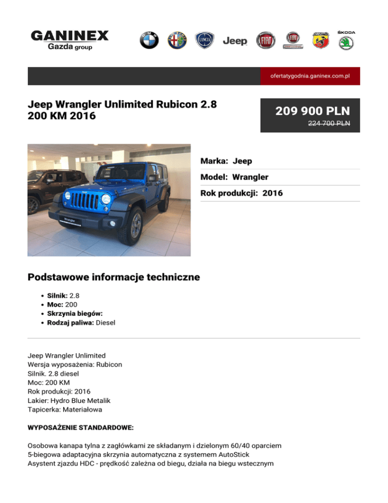 ofertatygodnia.ganinex.com.pl Jeep Wrangler Unlimited Rubicon 2.8 200 KM 2016 209 900 PLN Marka: Jeep Model: Wrangler Rok produkcji: 2016 Podstawowe informacje techniczne Silnik: 2.8 Moc: 200 Skrzynia biegów: Rodzaj paliwa: Diesel Jeep Wrangler Unlimited Wersja wyposażenia: Rubicon Silnik. 2.8 diesel Moc: 200 KM Rok produkcji: 2016 Lakier: Hydro Blue Metalik Tapicerka: Materiałowa WYPOSAŻENIE STANDARDOWE: Osobowa kanapa tylna z zagłówkami ze składanym i dzielonym 60/40 oparciem 5-biegowa adaptacyjna skrzynia automatyczna z systemem AutoStick Asystent zjazdu HDC - prędkość zależna od biegu, działa na biegu wstecznym 224 700 PLN Automatyczna klimatyzacja Boczne progi ochronne Rock Rails, ze stali lakierowanej na czarno, mocowane do nadwozia Czarny Soft Top Elektromechaniczne blokady przedniego i tylnego mechanizmu różnicowego TRU-LOCK Elektronicznie rozłączany stabilizator przedni Elektroniczny system stabilizacji toru jazdy ESC ze wspomaganiem hamowania awaryjnego BAS Filtr cząstek stałych DPF (Diesel) Fotel kierowcy z manualną regulacją wysokości HILL START ASSIST - asystent ruszania pod górę Immobilizer silnika SENTRY KEY z kodowanym transponderem w kluczyku Komputer z wyświetlaczem, kompasem i wskaźnikiem temperatury LAB Lampy przeciwmgielne przednie Lampy przeciwmgielne tylne Maty podłogowe MOPAR Most Dana 44 HD (Heavy Duty) tył Obręcze kół ze stopu aluminium 17" x 7,5" (opony P245/75R17) Obszyte skórą koło kierownicy Pakiet Elektryczny - centralny zamek z pilotem, elekt. otwierane szyby, elekt. regulowane lusterka Pakiet palacza (zapalniczka i popielniczka) Pałąk przeciwkapotażowy - system rur Pełne drzwi z opuszczanymi szybami Pełnowymiarowe koło zapasowe montowane na klapie bagażnika Pełnowymiarowe wielostopniowe poduszki powietrzne dla kierowcy i pasażera Płyta ochronna skrzynki rozdzielczej Płyta ochronna zbiornika paliwa Podgrzewane przednie fotele Pokrowiec koła zapasowego Radio AM/FM RDS MP3 CD AUX Reflektory przednie z automatycznym włączaniem Regulowana w pionie kolumna kierownicy Schowek pod podłogą bagażnika Skrzynia rozdzielcza Rock-Trac z reduktorem o przełożeniu 4,0:1 Sterowanie radiem w kole kierownicy System ERM przeciwdziałający przewróceniu się pojazdu System kontroli trakcji oparty na hamulcach BLD (Break Lock Differential) System monitorowania ciśnienia kół TPM z wyświetlaczem System nagłośnienia Alpine - 6 głośników, subwoofer, wzmacniacz 368 W Tempomat Wzmocnione hamulce HD - większe tarcze i zaciski Zasłony przeciwsłoneczne z lusterkami Zderzak przedni w kolorze czarnym Zderzak tylny w kolorze czarnym WYPOSAŻENIE OPCJONALNE: Lakier metalizowany Radio z nawigacją Czarny dach Freedom Top Katowice Katowice (Škoda) Pszczyna Gliwice Gliwice (BMW) al. Roździeńskiego 170 tel. 32 351 27 50 al. Roździeńskiego 182 tel. 32 203 66 00 ul. Bielska 31c tel. 32 210 10 00 ul. Pszczyńska 306 tel. 32 230 17 30 ul. Pszczyńska 322 tel. 32 700 10 00