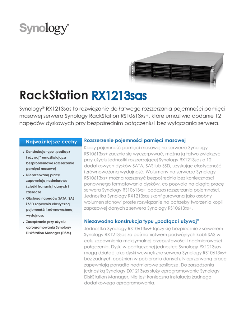 RackStation RX1213sas Synology® RX1213sas to rozwiązanie do łatwego rozszerzania pojemności pamięci masowej serwera Synology RackStation RS10613xs+, które umożliwia dodanie 12 napędów dyskowych przy bezpośrednim połączeniu i bez wyłączania serwera. Najważniejsze cechy ●● Konstrukcja typu „podłącz i używaj” umożliwiająca bezproblemowe rozszerzenie pamięci masowej ●● Nieprzerwaną pracę zapewniają nadmiarowe ścieżki transmisji danych i zasilacze ●● Obsługa napędów SATA, SAS i SSD zapewnia elastyczną pojemność i zrównoważoną wydajność ●● Rozszerzenie pojemności pamięci masowej Kiedy pojemność pamięci masowej na serwerze Synology RS10613xs+ zacznie się wyczerpywać, można ją łatwo zwiększyć przy użyciu jednostki rozszerzającej Synology RX1213sas o 12 dodatkowych dysków SATA, SAS lub SSD, uzyskując elastyczność i zrównoważoną wydajność. Wolumeny na serwerze Synology RS10613xs+ można rozszerzyć bezpośrednio bez konieczności ponownego formatowania dysków, co pozwala na ciągłą pracę serwera Synology RS10613xs+ podczas rozszerzania pojemności. Jednostka Synology RX1213sas skonfigurowana jako osobny wolumen stanowi proste rozwiązanie na potrzeby tworzenia kopii zapasowej danych z serwera Synology RS10613xs+. Zarządzanie przy użyciu Niezawodna konstrukcja typu „podłącz i używaj” oprogramowania Synology Jednostka Synology RS10613xs+ łączy się bezpiecznie z serwerem Synology RX1213sas za pośrednictwem podwójnych kabli SAS w celu zapewnienia maksymalnej przepustowości i nadmiarowości połączenia. Dyski w podłączonej jednostce Synology RX1213sas mogą działać jako dyski wewnętrzne serwera Synology RS10613xs+ bez żadnych opóźnień w pobieraniu danych. Nieprzerwaną pracę zapewniają ponadto nadmiarowe zasilacze. Do zarządzania jednostką Synology DX1213sas służy oprogramowanie Synology DiskStation Manager. Nie jest konieczna instalacja żadnego dodatkowego oprogramowania. DiskStation Manager (DSM) Złącza i przyciski Kieszeń na dysk twardy Wentylator Gniazdo zasilania Gniazdo rozszerzenia Identyfikator jednostki rozszerzającej Dane techniczne Sprzęt Wewnętrzny dysk twardy/SSD SATA/SAS 6 Gb/s x 12 (dyski twarde nie wchodzą w skład zestawu) Gniazdo rozszerzenia Wejścia x 2, wyjścia x 2 Wymiana dysków twardych podczas pracy Tak Typ wolumenu Basic, JBOD, RAID 0, RAID 1, RAID 5, RAID 6, RAID 10 Obsługiwany globalnie typ RAID Hot Spare RAID 1, RAID 5, RAID 6, RAID 10 Wymiary (wys. x szer. x gł.) 88 mm x 445 mm x 570 mm Waga 14,385 kg Wentylator systemu 80 x 80 mm x 4 Natężenie dźwięku 54,6 dB(A) Przywracanie zasilania Synchronizacja z połączonym serwerem RackStation Napięcie wejściowe zasilania prądem przemiennym Od 100 V do 240 V Częstotliwość zasilania Od 50 Hz do 60 Hz, prąd jednofazowy Temperatura pracy Od 5°C do 35°C (od 40°F do 95°F) Temperatura przechowywania Od -10°C do 70°C (od 15°F do 155°F) Wilgotność względna Od 5% do 95% Zużycie energii1 130,0 W (dostęp), 59,0 W (hibernacja HDD) Obsługiwane modele2 RS10613xs+ Ochrona środowiska i opakowanie Środowisko Zgodność z dyrektywą RoHS Zawartość opakowania Jednostka główna RX1213sas, podręcznik użytkownika, zestaw montażowy, kabel zasilający, kabel połączeniowy Certyfikaty FCC: Class A, CE: Klasa A Gwarancja 3 lata *Specyfikacje mogą ulegać zmianom bez powiadamiania. Najnowsze informacje można znaleźć w witrynie www.synology.com. 1.Pomiar z 12 dyskami twardymi Western Digital® 2TB WD2002FYPS. Wartości mogą być różne w różnych środowiskach 2.Informacje o najnowszych obsługiwanych modelach można uzyskać pod adresem www.synology.com. SYNOLOGY INC. Firma Synology wykorzystuje w pełni zalety najnowszych technologii, by zapewniać firmom i użytkownikom indywidualnym niezawodne oraz przystępne cenowo rozwiązania do centralizacji pamięci masowej, łatwego wykonywania kopii zapasowych danych, udostępniania i synchronizacji plików pomiędzy różnymi platformami, a także uzyskiwania dostępu do danych przy użyciu urządzeń mobilnych. Synology stawia sobie za cel oferowanie produktów o przyszłościowych funkcjach oraz najlepszych w swojej klasie usług dla klientów. Copyright © 2012, Synology Inc. Wszelkie prawa zastrzeżone. Nazwa Synology i logo Synology są znakami towarowymi lub zarejestrowanymi znakami towarowymi firmy Synology Inc. Nazwy innych produktów i firm wymienionych w tym dokumencie mogą być znakami towarowymi podmiotów, do których należą te nazwy. Firma Synology zastrzega sobie prawo do wprowadzania zmian w specyfikacji i opisie produktów w dowolnym momencie bez wcześniejszego powiadamiania. Wydrukowano na Tajwanie. RX1213sas-2012-PLK-REV002 Siedziba główna Synology Inc. 3F-3, No. 106, Chang An W. Rd., Taipei, Tajwan Tel.: +886 2 2552 1814 Faks: +886 2 2552 1824 Ameryka Północna i Południowa Synology America Corp. 13343 NE Bel-Red Road, Bellevue, WA 98005, USA Tel.: +1 425 818 1587 Francja Synology Francja 9 rue Benoît Malon, 92150 Suresnes, Francja Tel.: +33 1 46 14 87 73 Wielka Brytania Synology UK Ltd. Etheridge Avenue, Brinklow, Milton Keynes, MK10 0BP, Wielka Brytania Tel.: +44 1908 587422 Niemcy Synology GmbH Königsallee 92a 40212 Düsseldorf, Niemcy Tel.: +49 (0)211 5403 9658