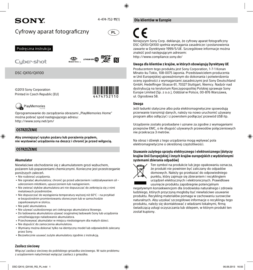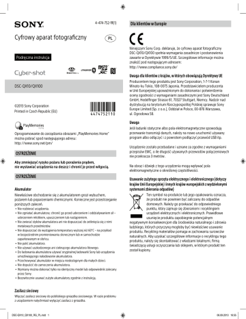 4-474-752-11(1) U E zb Dla klientów w Europie Cyfrowy aparat fotograficzny Podręczna instrukcja Niniejszym Sony Corp. deklaruje, że cyfrowy aparat fotograficzny DSC-QX10/QX100 spełnia wymagania zasadnicze i postanowienia zawarte w Dyrektywie 1999/5/UE. Szczegółowe informacje można znaleźć pod następującym adresem: http://www.compliance.sony.de/ Uwaga dla klientów z krajów, w których obowiązują Dyrektywy UE DSC-QX10/QX100 ©2013 Sony Corporation Printed in Czech Republic (EU) Producentem tego produktu jest Sony Corporation, 1-7-1 Konan Minato-ku Tokio, 108-0075 Japonia. Przedstawicielem producenta w Unii Europejskiej upoważnionym do dokonania i potwierdzenia oceny zgodności z wymaganiami zasadniczymi jest Sony Deutschland GmbH, Hedelfinger Strasse 61, 70327 Stuttgart, Niemcy. Nadzór nad dystrybucją na terytorium Rzeczypospolitej Polskiej sprawuje Sony Europe Limited (Sp. z o.o.), Oddział w Polsce, 00-876 Warszawa, ul. Ogrodowa 58. Uwaga Oprogramowanie do zarządzania obrazami „PlayMemories Home” można pobrać spod następującego adresu: http://www.sony.net/pm/ OSTRZEŻENIE Aby zmniejszyć ryzyko pożaru lub porażenia prądem, nie wystawiać urządzenia na deszcz i chronić je przed wilgocią. OSTRZEŻENIE Akumulator Niewłaściwe obchodzenie się z akumulatorem grozi wybuchem, pożarem lub poparzeniami chemicznymi. Konieczne jest przestrzeganie poniższych zaleceń. • Nie rozbierać urządzenia. • Nie zgniatać akumulatora; chronić go przed uderzeniem i oddziaływaniem sił – uderzeniem młotkiem, upuszczeniem lub nastąpieniem. • Nie zwierać styków akumulatora ani nie dopuszczać do zetknięcia się z nimi metalowych przedmiotów. • Nie dopuszczać do wystąpienia temperatury wyższej niż 60°C – na przykład w bezpośrednim promieniowaniu słonecznym lub w samochodzie zaparkowanym w słońcu. • Nie palić akumulatora. • Nie używać uszkodzonego ani cieknącego akumulatora litowego. • Do ładowania akumulatora używać oryginalnej ładowarki Sony lub urządzenia umożliwiającego naładowanie akumulatora. • Przechowywać akumulator w miejscu niedostępnym dla małych dzieci. • Nie dopuścić do zamoczenia akumulatora. • Wymiany można dokonać tylko na identyczny model lub odpowiednik zalecany przez Sony. • Bezzwłocznie usuwać zużyte akumulatory zgodnie z instrukcją. Jeśli ładunki statyczne albo pola elektromagnetyczne spowodują przerwanie transmisji danych, należy na nowo uruchomić używany program albo odłączyć i z powrotem podłączyć przewód USB itp. Urządzenie zostało przebadane i uznane za zgodne z wymaganiami przepisów EMC, o ile długość używanych przewodów połączeniowych nie przekracza 3 metrów. Na obraz i dźwięk z tego urządzenia mogą wpływać pola elektromagnetyczne o określonej częstotliwości. Usuwanie zużytego sprzętu elektrycznego i elektronicznego (dotyczy krajów Unii Europejskiej i innych krajów europejskich z wydzielonymi systemami zbierania odpadów) Ten symbol na produkcie lub jego opakowaniu oznacza, że produkt nie powinien być zaliczany do odpadów domowych. Należy go przekazać do odpowiedniego punktu, który zajmuje się zbieraniem i recyklingiem urządzeń elektrycznych i elektronicznych. Prawidłowe usunięcie produktu zapobiegnie potencjalnym negatywnym konsekwencjom dla środowiska naturalnego i zdrowia ludzkiego, których przyczyną mogłoby być niewłaściwe usuwanie produktu. Recykling materiałów pomaga w zachowaniu surowców naturalnych. Aby uzyskać szczegółowe informacje o recyklingu tego produktu, należy się skontaktować z władzami lokalnymi, firmą świadczącą usługi oczyszczania lub sklepem, w którym produkt ten został kupiony. S lu P p n n p W sp łą lu D w p e W z b p zu A b lo w D W W (z Z P C W R Z • • Zasilacz sieciowy Włączyć zasilacz sieciowy do pobliskiego gniazdka sieciowego. W razie problemu z urządzeniem natychmiast wyłączyć zasilacz z gniazdka. DSC-QX10_QX100_RG_PL.indd 1 06.09.2013 16:55 Usuwanie zużytych baterii i akumulatorów (dotyczy krajów Unii Europejskiej i innych krajów europejskich z wydzielonymi systemami zbierania odpadów) Ten symbol na baterii, akumulatorze lub opakowaniu oznacza, że produkt nie powinien być zaliczany do odpadów domowych. Na pewnych bateriach lub akumulatorach symbol ten może być używany razem z symbolem chemicznym. Symbole chemiczne rtęci (Hg) lub ołowiu (Pb) dodaje się, gdy bateria lub akumulator zawiera więcej niż 0,0005% rtęci lub 0,004% ołowiu. Prawidłowe usunięcie baterii lub akumulatora zapobiegnie potencjalnym negatywnym konsekwencjom dla środowiska naturalnego i zdrowia ludzkiego, których przyczyną mogłoby być niewłaściwe usuwanie baterii lub akumulatora. Recykling materiałów pomaga w zachowaniu surowców naturalnych. W przypadku produktu, który ze względów bezpieczeństwa, sprawności działania lub spójności danych wymaga stałego podłączenia do wewnętrznej baterii lub akumulatora, wymianę baterii lub akumulatora należy zlecić wykwalifikowanemu technikowi serwisu. Dla zapewnienia prawidłowego przetworzenia baterii lub akumulatora, wyeksploatowany produkt należy przekazać do odpowiedniego punktu, który zajmuje się zbieraniem i recyklingiem urządzeń elektrycznych i elektronicznych. W przypadku pozostałych baterii / akumulatorów należy się zapoznać z odpowiednim podrozdziałem dotyczącym bezpiecznego usuwania baterii lub akumulatora z produktu. Baterię lub akumulator należy przekazać do odpowiedniego punktu, który zajmuje się recyklingiem zużytych baterii. Aby uzyskać szczegółowe informacje o recyklingu tego produktu, baterii lub akumulatorów, należy się skontaktować z władzami lokalnymi, firmą świadczącą usługi oczyszczania lub sklepem, w którym produkt ten został kupiony. Dane techniczne Wymiary (zgodnie ze standardem Camera & Imaging Products Association): DSC-QX100: 62,5 × 62,5 × 55,5 mm (szer. × wys. 
