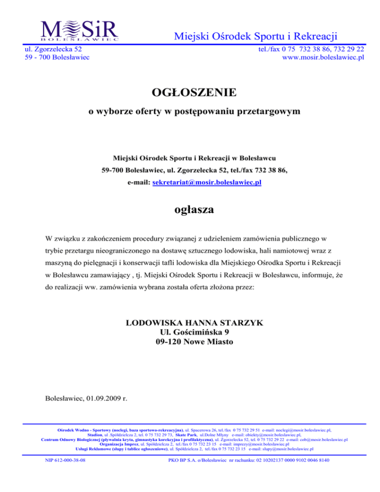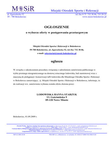 Miejski Ośrodek Sportu i Rekreacji ul. Zgorzelecka 52 59 - 700 Bolesławiec tel./fax 0 75 732 38 86, 732 29 22 www.mosir.boleslawiec.pl OGŁOSZENIE o wyborze oferty w postępowaniu przetargowym Miejski Ośrodek Sportu i Rekreacji w Bolesławcu 59-700 Bolesławiec, ul. Zgorzelecka 52, tel./fax 732 38 86, e-mail: [email protected] ogłasza W związku z zakończeniem procedury związanej z udzieleniem zamówienia publicznego w trybie przetargu nieograniczonego na dostawę sztucznego lodowiska, hali namiotowej wraz z maszyną do pielęgnacji i konserwacji tafli lodowiska dla Miejskiego Ośrodka Sportu i Rekreacji w Bolesławcu zamawiający , tj. Miejski Ośrodek Sportu i Rekreacji w Bolesławcu, informuje, Ŝe do realizacji ww. zamówienia wybrana została oferta złoŜona przez: LODOWISKA HANNA STARZYK Ul. Gościmińska 9 09-120 Nowe Miasto Bolesławiec, 01.09.2009 r. Ośrodek Wodno - Sportowy (noclegi, baza sportowo-rekreacyjna), ul. Spacerowa 26, tel./fax 0 75 732 29 51 e-mail: [email protected], Stadion, ul .Spółdzielcza 2, tel. 0 75 732 29 73, Skate Park, ul.Dolne Młyny e-mail: [email protected], Centrum Odnowy Biologicznej (pływalnia kryta, gimnastyka korekcyjna i profilaktyczna), ul. Zgorzelecka 52, tel. 0 75 732 29 22 e-mail: [email protected] Organizacja Imprez, ul. Spółdzielcza 2, tel./fax 0 75 732 23 15 e-mail: [email protected] Usługi Reklamowe (słupy i tablice ogłoszeniowe), ul. Spółdzielcza 2, tel./fax 0 75 732 23 15 e-mail: [email protected] NIP 612-000-38-08 PKO BP S.A. o/Bolesławiec nr rachunku: 02 10202137 0000 9102 0046 8140