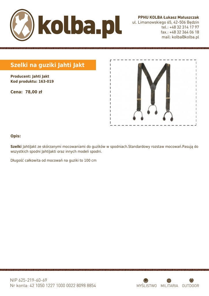 Szelki na guziki Jahti Jakt Producent: Jahti Jakt Kod produktu: 163-019 Cena: 78,00 zł Opis: Szelki JahtiJakt ze skórzanymi mocowaniami do guzików w spodniach.Standardowy rozstaw mocowań.Pasują do wszystkich spodni JahtiJakti oraz innych modeli spodni. Długość całkowita od mocowań na guziki to 100 cm