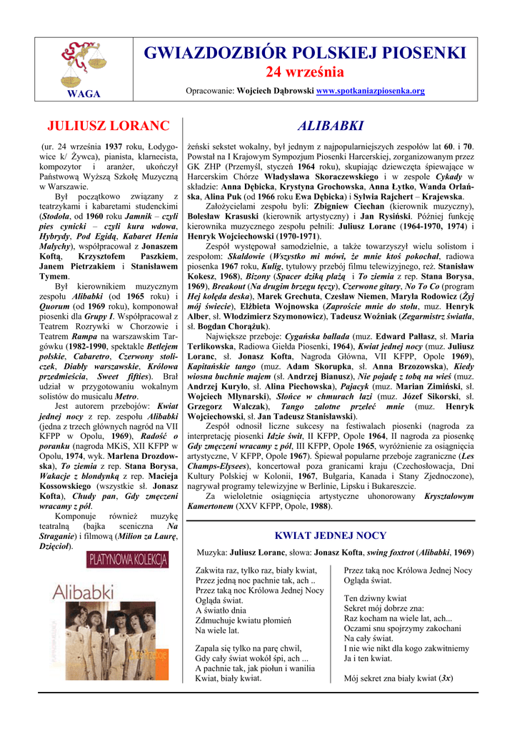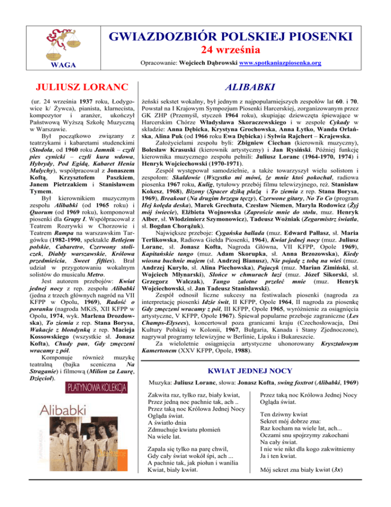 GWIAZDOZBIÓR POLSKIEJ PIOSENKI 24 września WAGA Opracowanie: Wojciech Dąbrowski www.spotkaniazpiosenka.org JULIUSZ LORANC ALIBABKI (ur. 24 września 1937 roku, Łodygowice k/ Żywca), pianista, klarnecista, kompozytor i aranżer, ukończył Państwową Wyższą Szkołę Muzyczną w Warszawie. Był początkowo związany z teatrzykami i kabaretami studenckimi (Stodoła, od 1960 roku Jamnik – czyli pies cynicki – czyli kura wdowa, Hybrydy, Pod Egidą, Kabaret Henia Malychy), współpracował z Jonaszem Koftą, Krzysztofem Paszkiem, Janem Pietrzakiem i Stanisławem Tymem. Był kierownikiem muzycznym zespołu Alibabki (od 1965 roku) i Quorum (od 1969 roku), komponował piosenki dla Grupy I. Współpracował z Teatrem Rozrywki w Chorzowie i Teatrem Rampa na warszawskim Targówku (1982-1990, spektakle Betlejem polskie, Cabaretro, Czerwony stoliczek, Diabły warszawskie, Królowa przedmieścia, Sweet fifties). Brał udział w przygotowaniu wokalnym solistów do musicalu Metro. Jest autorem przebojów: Kwiat jednej nocy z rep. zespołu Alibabki (jedna z trzech głównych nagród na VII KFPP w Opolu, 1969), Radość o poranku (nagroda MKiS, XII KFPP w Opolu, 1974, wyk. Marlena Drozdowska), To ziemia z rep. Stana Borysa, Wakacje z blondynką z rep. Macieja Kossowskiego (wszystkie sł. Jonasz Kofta), Chudy pan, Gdy zmęczeni wracamy z pół. Komponuje również muzykę teatralną (bajka sceniczna Na Straganie) i filmową (Milion za Laurę, Dzięcioł). żeński sekstet wokalny, był jednym z najpopularniejszych zespołów lat 60. i 70. Powstał na I Krajowym Sympozjum Piosenki Harcerskiej, zorganizowanym przez GK ZHP (Przemyśl, styczeń 1964 roku), skupiając dziewczęta śpiewające w Harcerskim Chórze Władysława Skoraczewskiego i w zespole Cykady w składzie: Anna Dębicka, Krystyna Grochowska, Anna Łytko, Wanda Orlańska, Alina Puk (od 1966 roku Ewa Dębicka) i Sylwia Rajchert – Krajewska. Założycielami zespołu byli: Zbigniew Ciechan (kierownik muzyczny), Bolesław Krasuski (kierownik artystyczny) i Jan Rysiński. Później funkcję kierownika muzycznego zespołu pełnili: Juliusz Loranc (1964-1970, 1974) i Henryk Wojciechowski (1970-1971). Zespół występował samodzielnie, a także towarzyszył wielu solistom i zespołom: Skaldowie (Wszystko mi mówi, że mnie ktoś pokochał, radiowa piosenka 1967 roku, Kulig, tytułowy przebój filmu telewizyjnego, reż. Stanisław Kokesz, 1968), Bizony (Spacer dziką plażą i To ziemia z rep. Stana Borysa, 1969), Breakout (Na drugim brzegu tęczy), Czerwone gitary, No To Co (program Hej kolęda deska), Marek Grechuta, Czesław Niemen, Maryla Rodowicz (Żyj mój świecie), Elżbieta Wojnowska (Zaproście mnie do stołu, muz. Henryk Alber, sł. Włodzimierz Szymonowicz), Tadeusz Woźniak (Zegarmistrz światła, sł. Bogdan Chorążuk). Największe przeboje: Cygańska ballada (muz. Edward Pałłasz, sł. Maria Terlikowska, Radiowa Giełda Piosenki, 1964), Kwiat jednej nocy (muz. Juliusz Loranc, sł. Jonasz Kofta, Nagroda Główna, VII KFPP, Opole 1969), Kapitańskie tango (muz. Adam Skorupka, sł. Anna Brzozowska), Kiedy wiosna buchnie majem (sł. Andrzej Bianusz), Nie pojadę z tobą na wieś (muz. Andrzej Kuryło, sł. Alina Piechowska), Pajacyk (muz. Marian Zimiński, sł. Wojciech Młynarski), Słońce w chmurach łazi (muz. Józef Sikorski, sł. Grzegorz Walczak), Tango zalotne przeleć mnie (muz. Henryk Wojciechowski, sł. Jan Tadeusz Stanisławski). Zespół odnosił liczne sukcesy na festiwalach piosenki (nagroda za interpretację piosenki Idzie świt, II KFPP, Opole 1964, II nagroda za piosenkę Gdy zmęczeni wracamy z pól, III KFPP, Opole 1965, wyróżnienie za osiągnięcia artystyczne, V KFPP, Opole 1967). Śpiewał popularne przeboje zagraniczne (Les Champs-Elysees), koncertował poza granicami kraju (Czechosłowacja, Dni Kultury Polskiej w Kolonii, 1967, Bułgaria, Kanada i Stany Zjednoczone), nagrywał programy telewizyjne w Berlinie, Lipsku i Bukareszcie. Za wieloletnie osiągnięcia artystyczne uhonorowany Kryształowym Kamertonem (XXV KFPP, Opole, 1988). KWIAT JEDNEJ NOCY Muzyka: Juliusz Loranc, słowa: Jonasz Kofta, swing foxtrot (Alibabki, 1969) Zakwita raz, tylko raz, biały kwiat, Przez jedną noc pachnie tak, ach .. Przez taką noc Królowa Jednej Nocy Ogląda świat. A światło dnia Zdmuchuje kwiatu płomień Na wiele lat. Zapala się tylko na parę chwil, Gdy cały świat wokół śpi, ach ... A pachnie tak, jak piołun i wanilia Kwiat, biały kwiat. Przez taką noc Królowa Jednej Nocy Ogląda świat. Ten dziwny kwiat Sekret mój dobrze zna: Raz kocham na wiele lat, ach... Oczami snu spojrzymy zakochani Na cały świat. I nie wie nikt dla kogo zakwitniemy Ja i ten kwiat. Mój sekret zna biały kwiat (3x)