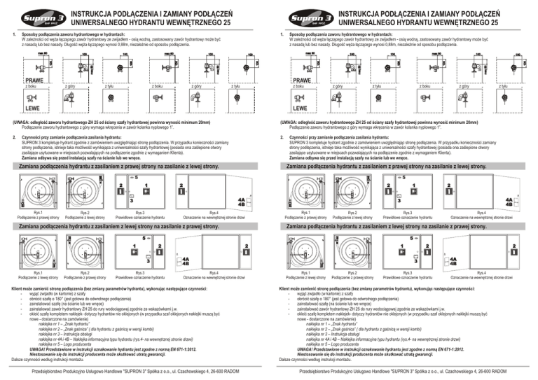 INSTRUKCJA PODŁĄCZENIA I ZAMIANY PODŁĄCZEŃ UNIWERSALNEGO HYDRANTU WEWNĘTRZNEGO 25 PRAWE z boku z góry z tyłu z góry PRAWE z tyłu z boku LEWE max 60 z góry 100 z tyłu z boku z góry (UWAGA: odległość zaworu hydrantowego ZH 25 od ściany szafy hydrantowej powinna wynosić minimum 20mm) Podłączenie zaworu hydrantowego z góry wymaga wkręcenia w zawór kolanka nyplowego 1”. 2. 2. Czynności przy zamianie podłączenia zasilania hydrantu: SUPRON 3 kompletuje hydrant zgodnie z zamówieniem uwzględniając stronę podłączenia. W przypadku konieczności zamiany strony podłączenia, istnieje taka możliwość wynikająca z uniwersalności szafy hydrantowej (posiada ona zaślepione otwory zasilające usytuowane w miejscach pozwalających na podłączenie zgodnie z wymaganiem Klienta). Zamiana odbywa się przed instalacją szafy na ścianie lub we wnęce. Zamiana podłączenia hydrantu z zasilaniem z prawej strony na zasilanie z lewej strony. Czynności przy zamianie podłączenia zasilania hydrantu: SUPRON 3 kompletuje hydrant zgodnie z zamówieniem uwzględniając stronę podłączenia. W przypadku konieczności zamiany strony podłączenia, istnieje taka możliwość wynikająca z uniwersalności szafy hydrantowej (posiada ona zaślepione otwory zasilające usytuowane w miejscach pozwalających na podłączenie zgodnie z wymaganiem Klienta). Zamiana odbywa się przed instalacją szafy na ścianie lub we wnęce. Zamiana podłączenia hydrantu z zasilaniem z prawej strony na zasilanie z lewej strony. 5 2 5 1 2 2 4A 4B 3 Rys.2 Podłączenie z lewej strony Rys.3 Prawidłowe oznaczenie hydrantu 1 Rys.1 Podłączenie z prawej strony Rys.4 Oznaczenie na wewnętrznej stronie drzwi Rys.2 Podłączenie z lewej strony 4A 4B Rys.3 Prawidłowe oznaczenie hydrantu Rys.4 Oznaczenie na wewnętrznej stronie drzwi Zamiana podłączenia hydrantu z zasilaniem z lewej strony na zasilanie z prawej strony. 5 5 1 2 3 Rys.2 Podłączenie z prawej strony 2 3 Zamiana podłączenia hydrantu z zasilaniem z lewej strony na zasilanie z prawej strony. Rys.1 Podłączenie z lewej strony z tyłu LEWE (UWAGA: odległość zaworu hydrantowego ZH 25 od ściany szafy hydrantowej powinna wynosić minimum 20mm) Podłączenie zaworu hydrantowego z góry wymaga wkręcenia w zawór kolanka nyplowego 1”. Rys.1 Podłączenie z prawej strony 100 100 100 max 60 100 100 100 max 60 z boku max 60 100 max 60 100 100 max 60 100 max 60 100 100 100 max 60 Sposoby podłączenia zaworu hydrantowego w hydrantach: W zależności od węża łączącego zawór hydrantowy ze zwijadłem - osią wodną, zastosowany zawór hydrantowy może być z nasadą lub bez nasady. Długość węża łączącego wynosi 0,88m, niezależnie od sposobu podłączenia. 100 1. Sposoby podłączenia zaworu hydrantowego w hydrantach: W zależności od węża łączącego zawór hydrantowy ze zwijadłem - osią wodną, zastosowany zawór hydrantowy może być z nasadą lub bez nasady. Długość węża łączącego wynosi 0,88m, niezależnie od sposobu podłączenia. 100 1. INSTRUKCJA PODŁĄCZENIA I ZAMIANY PODŁĄCZEŃ UNIWERSALNEGO HYDRANTU WEWNĘTRZNEGO 25 Rys.3 Prawidłowe oznaczenie hydrantu 2 1 4A 4B Rys.4 Oznaczenie na wewnętrznej stronie drzwi Klient może zamienić stronę podłączenia (bez zmiany parametrów hydrantu), wykonując następujące czynności: wyjąć zwijadło (w kartonie) z szafy obrócić szafę o 180° (jest gotowa do odwrotnego podłączenia) zainstalować szafę (na ścianie lub we wnęce) zainstalować zawór hydrantowy ZH 25 do rury wodociągowej zgodnie ze wskazówkami j.w. okleić szafę kompletem naklejek- dotyczy hydrantów nie oklejonych (w przypadku szaf oklejonych naklejki muszą być nowe - dostarczone na zamówienie) naklejka nr 1 – „Znak hydrantu” naklejka nr 2 – „Znak gaśnica” ( dla hydrantu z gaśnicą w wersji kombi) naklejka nr 3 – Instrukcja obsługi naklejka nr 4A i 4B – Naklejka informacyjna typu hydrantu (rys.4- na wewnętrznej stronie drzwi) naklejka nr 5 – Logo producenta UWAGA! Przedstawione w instrukcji oznakowanie hydrantu jest zgodne z normą EN 671-1:2012. Niestosowanie się do instrukcji producenta może skutkować utratą gwarancji. Dalsze czynności według instrukcji montażu. Przedsiębiorstwo Produkcyjno Usługowo Handlowe "SUPRON 3" Spółka z o.o., ul. Czachowskiego 4, 26-600 RADOM 2 3 Rys.1 Podłączenie z lewej strony Rys.2 Podłączenie z prawej strony Rys.3 Prawidłowe oznaczenie hydrantu 2 4A 4B Rys.4 Oznaczenie na wewnętrznej stronie drzwi Klient może zamienić stronę podłączenia (bez zmiany parametrów hydrantu), wykonując następujące czynności: wyjąć zwijadło (w kartonie) z szafy obrócić szafę o 180° (jest gotowa do odwrotnego podłączenia) zainstalować szafę (na ścianie lub we wnęce) zainstalować zawór hydrantowy ZH 25 do rury wodociągowej zgodnie ze wskazówkami j.w. okleić szafę kompletem naklejek- dotyczy hydrantów nie oklejonych (w przypadku szaf oklejonych naklejki muszą być nowe - dostarczone na zamówienie) naklejka nr 1 – „Znak hydrantu” naklejka nr 2 – „Znak gaśnica” ( dla hydrantu z gaśnicą w wersji kombi) naklejka nr 3 – Instrukcja obsługi naklejka nr 4A i 4B – Naklejka informacyjna typu hydrantu (rys.4- na wewnętrznej stronie drzwi) naklejka nr 5 – Logo producenta UWAGA! Przedstawione w instrukcji oznakowanie hydrantu jest zgodne z normą EN 671-1:2012. Niestosowanie się do instrukcji producenta może skutkować utratą gwarancji. Dalsze czynności według instrukcji montażu. Przedsiębiorstwo Produkcyjno Usługowo Handlowe "SUPRON 3" Spółka z o.o., ul. Czachowskiego 4, 26-600 RADOM