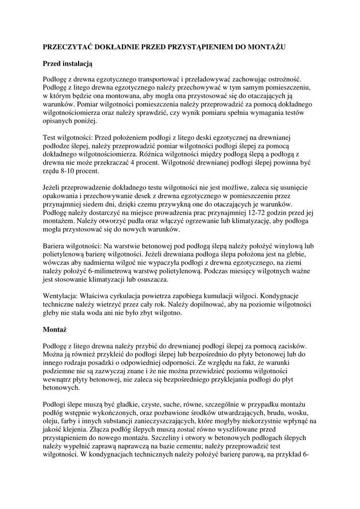 PRZECZYTAĆ DOKŁADNIE PRZED PRZYSTĄPIENIEM DO MONTAŻU Przed instalacją Podłogę z drewna egzotycznego transportować i przeładowywać zachowując ostrożność. Podłogę z litego drewna egzotycznego należy przechowywać w tym samym pomieszczeniu, w którym będzie ona montowana, aby mogła ona przystosować się do otaczających ją warunków. Pomiar wilgotności pomieszczenia należy przeprowadzić za pomocą dokładnego wilgotnościomierza oraz należy sprawdzić, czy wynik pomiaru spełnia wymagania testów opisanych poniżej. Test wilgotności: Przed położeniem podłogi z litego deski egzotycznej na drewnianej podłodze ślepej, należy przeprowadzić pomiar wilgotności podłogi ślepej za pomocą dokładnego wilgotnościomierza. Różnica wilgotności między podłogą ślepą a podłogą z drewna nie może przekraczać 4 procent. Wilgotność drewnianej podłogi ślepej powinna być rzędu 8-10 procent. Jeżeli przeprowadzenie dokładnego testu wilgotności nie jest możliwe, zaleca się usunięcie opakowania i przechowywanie desek z drewna egzotycznego w pomieszczeniu przez przynajmniej siedem dni, dzięki czemu przywykną one do otaczających je warunków. Podłogę należy dostarczyć na miejsce prowadzenia prac przynajmniej 12-72 godzin przed jej montażem. Należy otworzyć pudła oraz włączyć ogrzewanie lub klimatyzację, aby podłoga mogła przystosować się do nowych warunków. Bariera wilgotności: Na warstwie betonowej pod podłogą ślepą należy położyć winylową lub polietylenową barierę wilgotności. Jeżeli drewniana podłoga ślepa położona jest na glebie, wówczas aby nadmierna wilgoć nie wypaczyła podłogi z drewna egzotycznego, na ziemi należy położyć 6-milimetrową warstwę polietylenową. Podczas miesięcy wilgotnych ważne jest stosowanie klimatyzacji lub osuszacza. Wentylacja: Właściwa cyrkulacja powietrza zapobiega kumulacji wilgoci. Kondygnacje techniczne należy wietrzyć przez cały rok. Należy dopilnować, aby na poziomie wilgotności gleby nie stała woda ani nie było zbyt wilgotno. Montaż Podłogę z litego drewna należy przybić do drewnianej podłogi ślepej za pomocą zacisków. Można ją również przykleić do podłogi ślepej lub bezpośrednio do płyty betonowej lub do innego rodzaju posadzki o odpowiedniej odporności. Ze względu na fakt, że warunki podziemne nie są zazwyczaj znane i że nie można przewidzieć poziomu wilgotności wewnątrz płyty betonowej, nie zaleca się bezpośredniego przyklejania podłogi do płyt betonowych. Podłogi ślepe muszą być gładkie, czyste, suche, równe, szczególnie w przypadku montażu podłóg wstępnie wykończonych, oraz pozbawione środków utwardzających, brudu, wosku, oleju, farby i innych substancji zanieczyszczających, które mogłyby niekorzystnie wpłynąć na jakość klejenia. Złącza podłóg ślepych muszą zostać równo wyszlifowane przed przystąpieniem do nowego montażu. Szczeliny i otwory w betonowych podłogach ślepych należy wypełnić zaprawą naprawczą na bazie cementu; należy przeprowadzić test wilgotności. W kondygnacjach technicznych należy położyć barierę parową, na przykład 6- milometrową warstwę polietylenową. Zaleca się przeprowadzenie testu chlorku wapnia. Podłóg nie można kłaść, jeżeli ciśnienie pary jest wyższe niż. ok. 1,3 kg na 100 m2) w ciągu 24 godzin. Płyty betonowe mające mniej niż 60 dni są zazwyczaj zbyt mokre, aby kłaść na nie podłogę z drewna egzotycznego. Montaż na gwoździe • W celu zapobieżenia przenikaniu wilgoci pod podłogę z drewna egzotycznego należy położyć dwuwarstwowy 15-funtowy filc układany na zakładkę. Deski należy kłaść zaczynając od rogu pomieszczenia i równolegle do jego najdłuższej ściany wzdłuż sznurka traserskiego zostawiając przestrzeń równą grubości deski plus 3/8”. • Pierwszą deskę kłaść wpustem do ściany. Zabezpieczyć deski za pomocą gwoździ wykończeniowych. Przebijakiem wbić gwoździe poniżej powierzchni i wypełnić szpachlówką do drewna. • Zostawić 3/8” od płyty podstawowej lub ściany na szczelinę dylatacyjną i zabezpieczyć drewnianą lub plastykową przekładką dylatacyjną. • Kiedy pierwsze rzędy zostaną zabezpieczone, drugie i kolejne należy przybić bezpośrednio nad piórem ustawiając gwoździe pod kątem 45-50 stopni względem powierzchni. • Łączniki umieścić co 25-30 cm, minimalnie 2 łączniki na deskę, a każdy łącznik musi znajdować się 7,5 cm od końca każdej deski. Można wykorzystać dostępne złączniki do innych modeli. • Usunąć przekładki dylatacyjne i zamontować listwy profilujące podstawowe i/lub ćwierćwałkowe do przykrycia szczeliny dylatacyjnej. W razie potrzeby zamontować elementy przejściowe (reduktory, listwy teowe, itd.). Uwaga: Płyta wiórowa nie utrzyma odpowiednio gwoździ i tym samym nie można jej stosować jako materiał na podłogę ślepą Montaż na klej • • • Używać kleju poliuretanowego i zastosować się do wytycznych producenta kleju dotyczących bezpiecznego użycia, przechowywania i przeładunku. Klej rozsmarować kielnią pod kątem 45 stopni. Klej z powierzchni podłogi natychmiast usunąć wilgotną szmatką. Deski należy kłaść zaczynając od rogu pomieszczenia prostopadle do legarów podłogowych. Pierwszy rząd położyć wpustem do ściany, a podłogę kłaść dalej aż klej zostanie przykryty deskami. Sprawdzić linie robocze, aby upewnić się czy podłoga została położona równo. Zostawić przynajmniej 3/8” odstępu od płyty podstawowej lub ściany na szczelinę dylatacyjną. Do przytrzymania pierwszych rzędów należy zastosować klin lub przekładki dylatacyjne. • • Kiedy pierwsze rzędy zostaną zabezpieczone, klej należy dalej rozsmarowywać, a deski kłaść odcinkami aż montaż całej podłogi zostanie zakończony. Należy pamiętać o zamontowaniu łączników końcowych przy każdym rzędz