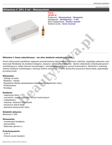 Informacje o produkcie Utworzono 03-03-2017 Witamina C 20% 5 ml - Mesosystem Cena : 18,00 zł ov a. pl Producent : Mesosystem - Hiszpania Dostępność : Dostępność - 3 dni Stan magazynowy : bardzo wysoki Średnia ocena : brak recenzji Witamina C (kwas askorbinowy) - ma silne działanie antyoksydacyjne. yN Chroni skórę przed szkodliwym wpływem promieniowania UV i działaniem wolnych rodników, zapobiega utlenianiu oraz stymuluje fibroblasty do produkcji kolagenu, elastyny i glikozoaminoglikanów . Oprócz właściwości antyoksydacyjnych i rewitalizujących, działa również uszczelniająco i wzmacniająco na ściany naczyń krwionośnych. Witamina C wykazuje również działanie rozświetlające, redukuje drobne zmarszczki, a także skutecznie przywraca skórze blask, poprawiając jej elastyczność. ea ut Wskazania: - Zabiegi na twarz - Melasma - ostuda - Wypadanie włosów spowodowane łojotokowym zapaleniem skóry - Przebarwienia - Rozstępy B Działanie: - regeneruje skórę - uszczelnia i wzmacnia ściany naczyń krwionośnych - rozświetlanie - redukcja drobnych zmarszczek - przywraca skórze blask - poprawia elastyczność skóry Składniki aktywne: Witamina C 20% Stosowanie: - mezoterapia bezigłowa - dermarollery - Elektroda ujemna (-). Przechowywanie: - 5-25 oC - Chronić przed światłem Wygenerowano w programie www.oscGold.com B ea ut yN ov a. pl Pojemność: 5 ml