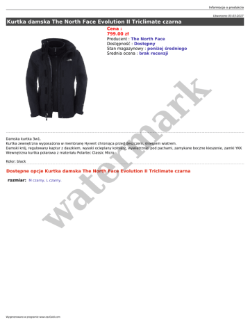 Informacje o produkcie Utworzono 03-03-2017 Kurtka damska The North Face Evolution II Triclimate czarna Cena : 799.00 zł er m ar k Producent : The North Face Dostępność : Dostępny Stan magazynowy : poniżej średniego Średnia ocena : brak recenzji Damska kurtka 3w1. Kurtka zewnętrzna wyposażona w membranę Hyvent chroniąca przed deszczem, śniegiem wiatrem. Damski krój, regulowany kaptur z daszkiem, wysoki ocieplany kołnierz, wywietrzniki pod pachami, zamykane boczne kieszenie, zamki YKK Wewnętrzna kurtka polarowa z materiału Polartec Classic Micro Kolor: black Dostępne opcje Kurtka damska The North Face Evolution II Triclimate czarna w at rozmiar: M czarny, L czarny. Wygenerowano w programie www.oscGold.com