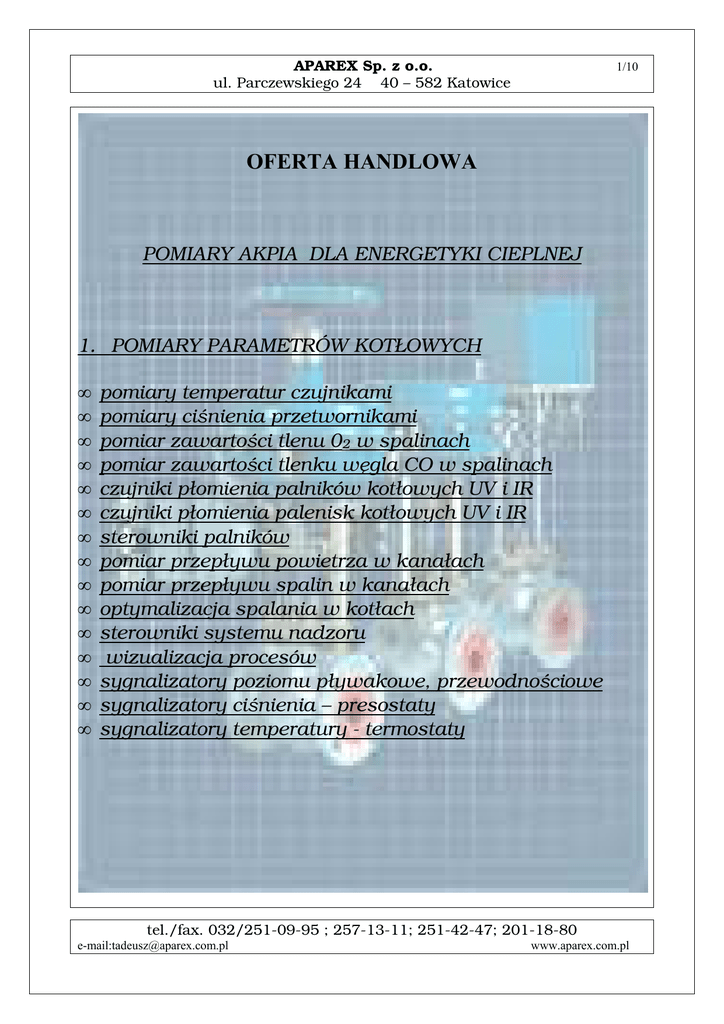 APAREX Sp. z o.o. ul. Parczewskiego 24 40 – 582 Katowice 1/10 OFERTA HANDLOWA POMIARY AKPIA DLA ENERGETYKI CIEPLNEJ 1. POMIARY PARAMETRÓW KOTŁOWYCH • • • • • • • • • • • • • • • pomiary temperatur czujnikami pomiary ciśnienia przetwornikami pomiar zawartości tlenu 02 w spalinach pomiar zawartości tlenku węgla CO w spalinach czujniki płomienia palników kotłowych UV i IR czujniki płomienia palenisk kotłowych UV i IR sterowniki palników pomiar przepływu powietrza w kanałach pomiar przepływu spalin w kanałach optymalizacja spalania w kotłach sterowniki systemu nadzoru wizualizacja procesów sygnalizatory poziomu pływakowe, przewodnościowe sygnalizatory ciśnienia – presostaty sygnalizatory temperatury - termostaty tel./fax. 032/251-09-95 ; 257-13-11; 251-42-47; 201-18-80 e-mail:[email protected] www.aparex.com.pl APAREX Sp. z o.o. ul. Parczewskiego 24 40 – 582 Katowice 2/10 1. POMIARY PARAMETRÓW KOTŁOWYCH ZAKRES OFERTY 1. ANALIZATORY TLENU – KRAJOWE SENSOR PRODUKT ; TTM ; ALTER 2. ANALIZATORY TLENU – LAMTEC LT1/LS1 ; LT2/LS2 3. ANALIAZTOR CO/H2 - LAMTEC LT2-K/KS1-K 4. CZUJNIKI PŁOMIENIA – LAMTEC CZUJNIKI UV ; CZUJNIKI IR ; MODUŁY STERUJĄCE F250; CZUJNIKI KOMPAKTOWE F200; 5. STEROWNIKI PALNIKÓW – LAMTEC VMS; FMS; ETAMATIC 6. KANAŁOWY POMIAR PRZEPŁYWU GAZÓW - LAMTEC SIATKA POMIAROWA DLA KANAŁÓW OKRĄGŁYCH I PROSTOKĄTNYCH DO WSPÓŁPRACY Z PRZETWORNKIEM PRZEPŁYWU 7. OPTYMALIZACJA SPALNIA - LAMTEC ETAMATIC – STEROWNIK DLA KOTŁÓW OLEJOWYCH I GAZOWYCH 8. STEROWNIKI SYSTEMU NADZORU – IMPACT; STEROWNIKI I ALGORYTMY STEROWANIA ORAZ OPTYMALIZACJI SPALANIA W KOTŁACH 9. WIZUALIZAJA PROCESÓW – IMPACT; ASTOR tel./fax. 032/251-09-95 ; 257-13-11; 251-42-47; 201-18-80 e-mail:[email protected] www.aparex.com.pl APAREX Sp. z o.o. ul. Parczewskiego 24 40 – 582 Katowice 3/10 2. ARMATURA REGULACYJNA I ODCINAJĄCA ZAKRES OFERTY 1. Zawory regulacyjne gwintowane – POLNA, TAC, Danfoss 2. Zawory regulacyjne kołnierzowe – POLNA, TOFAMA, ZETKAMA 3. Zawory regulacyjne do spawania - POLNA 4. Siłowniki pneumatyczne membranowe - POLNA 5. Siłowniki elektryczne 1-fazowe ZAP, ZUAP, Belimo 6. Siłowniki elektryczne 3-fazowe ZAP, ZUAP, Belimo 7. Inteligentne systemy sterowania – INTEC, PNEFAL 8. Zawory odcinające z napędami – WAKMET, TOFAMA 9. Przepustnice z napędami – POLNA, TOFAMA, TEHACO 10. Zasuwy z napędami – TEHACO, JAFAR 11. Zawory kulowe z napędami – EFAR, CHEMITEX 12. Regulatory bezpośredniego działania – POLNA, Narzędziowcy 13. Elektrozawory – ARMAK, ASCO, FLAMAGAZ tel./fax. 032/251-09-95 ; 257-13-11; 251-42-47; 201-18-80 e-mail:[email protected] www.aparex.com.pl APAREX Sp. z o.o. ul. Parczewskiego 24 40 – 582 Katowice 4/10 3. OSPRZĘT MONTAŻOWY ZAKRES OFERTY 1. Zawory manometryczne – WAKMET, POLNA, ZAP 2. Kurki manometryczne - ARMATURA, KFM 3. Zawory kulowe PN140 Dn15 - do spawania 4. Złącza izolacyjne rur impulsowych 5. Rurki syfonowe – cylindryczne, U-rurki, z kielichem obrotowym 6. Króćce termometryczne – M20x1,5; G1/2”; M27x2; G3/4”..... 7. Kołnierze – płaskie, szyjkowe, gwintowane..... 8. Rurki impulsowe R35, K18, 1H18N9T.... 9. Przewody pneumatyczne – PE, PA, PU 10. Osprzęt pneumatyczny – filtry, reduktory, złączki 11. Złącza rurowe - tel./fax. 032/251-09-95 ; 257-13-11; 251-42-47; 201-18-80 e-mail:[email protected] www.aparex.com.pl APAREX Sp. z o.o. ul. Parczewskiego 24 40 – 582 Katowice 5/10 POMIARY PARAMETRÓW KOTŁOWYCH CYRKONOWE ANALIZATORY DO POMIARU ZAWARTOŚCI TLENU W GAZACH PRZEMYSŁOWYCH - KRAJOWE - 1. ANALIZA SPALIN- in situ ANALIZA TLENU + CO2 +λ ANALIZA TLENU +T1 /T2 +η ZAKRESY POMIAROWE 0.....5% 0....10% 0....21% [ Ο2 ] Analizatory typu C-101, C-102, C-104, C-105 oraz C-201T służą do pomiaru stężenia tlenu [%O2] w gazach przemysłowych o temperaturach mieszczących się w zakresie: Analizatory: C-101 (20÷650°C ) C-102 (20÷700°C ) C-104 (20÷700°C ) C-105 (20÷650°C ) C-201T (750÷1250°C ) Cyrkonowy Analizator Tlenu CAT 4, CAT 5 - przeznaczone są do ciągłego pomiaru stężenia tlenu w gazach spalinowych kotłów energetycznych (bezpośrednio w kanale spalin). Dzięki swojej konstrukcji, analizatory umożliwiają monitorowanie zawartości tlenu (wyświetlacz cyfrowy), jak również współpracę poprzez pętlę prądową z układami automatyki sterującej procesem spalania Zakresy pomiarowe: %O2 0.1 ÷ 20 / 0.1 ÷ 10 / 0.1÷5% (zakres przełączany zworką) • funkcje analizatora • długość sondy w kanale spalin - Wyjście prądowe – liniowe, izolowane o obciążalności ≤ 500 Ω(sygnał proporcjonalny do stężenia tlenu): mA 0 ÷ 20 lub 4 ÷ 20 (zakres przełączany zworką) odczyt stężenia tlenu, odczyt temperatury ogniwa, m długość: 0.2 ÷ 2 m (zgodnie z zamów.) Analizator Tlenu CAT 4 uzyskał świadectwo zgodności z europejskimi normami: IEC 1010-1990 oraz IEC 1207-1994 wystawione przez POLSKIE STOWARZYSZENIE NA RZECZ BADAŃ TECHNICZNYCH I ATESTACJI (członek FSNT NOT) - Świadectwo Nr 2/96. tel./fax. 032/251-09-95 ; 257-13-11; 251-42-47; 201-18-80 e-mail:[email protected] www.aparex.com.pl APAREX Sp. z o.o. ul. Parczewskiego 24 40 – 582 Katowice 6/10 ANALIZATOR SPRAWNOŚCI PALENISKOWEJ ASP-1 Analizator sprawności paleniskowej jest przyrządem pomiarowym przeznaczonym do wyznaczania bieżącej sprawności paleniska kotłów opomiarowanych dowolnego typu analizatorem zawartości tlenu w spalinach i stanowi uzupełnienie systemów informacji o ekonomice procesu spalania. Jego podstawową funkcją jest wyznaczanie procentowej sprawności spalania w palenisku kotłowym na podstawie pomiaru temperatury wlotowej powietrza, temperatury wylotowej spalin oraz zawartości tlenu w spalinach. Funkcjami uzupełniającymi przyrządu są: wyznaczanie współczynnika nadmiaru powietrza ( λ ) wyznaczanie objętościowej zawartości dwutlenku węgla w spalinach pomiar temperatur : wlotowej powietrza do paleniska i wylotowej sp