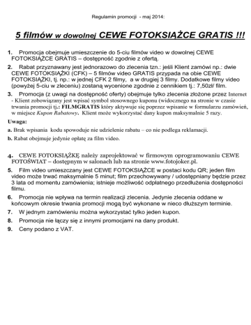 Regulamin promocji - maj 2014: 5 filmów w dowolnej CEWE FOTOKSIĄŻCE GRATIS !!! 1. Promocja obejmuje umieszczenie do 5-ciu filmów video w dowolnej CEWE FOTOKSIĄŻCE GRATIS – dostępność zgodnie z ofertą. 2. Rabat przyznawany jest jednorazowo do zlecenia tzn.: jeśli Klient zamówi np.: dwie CEWE FOTOKSIĄŻKI (CFK) – 5 filmów video GRATIS przypada na obie CEWE FOTOKSIĄŻKI, tj. np.: w jednej CFK 2 filmy, a w drugiej 3 filmy. Dodatkowe filmy video (powyżej 5-ciu w zleceniu) zostaną wycenione zgodnie z cennikiem tj.: 7,50zł/ film. 3. Promocja (z uwagi na dostępność oferty) obejmuje tylko zlecenia złożone przez Internet - Klient zobowiązany jest wpisać symbol stosownego kuponu (widocznego na stronie w czasie trwania promocji tj.: FILMGRATIS który aktywuje się poprzez wpisanie w formularzu zamówień, w miejsce Kupon Rabatowy. Klient może wykorzystać dany kupon maksymalnie 5 razy. Uwaga: a. Brak wpisania kodu spowoduje nie udzielenie rabatu – co nie podlega reklamacji. b. Rabat obejmuje jedynie opłatę za film video. 4. CEWE FOTOKSIĄŻKĘ należy zaprojektować w firmowym oprogramowaniu CEWE FOTOŚWIAT – dostępnym w salonach lub na stronie www.fotojoker.pl. 5. Film video umieszczany jest CEWE FOTOKSIĄŻCE w postaci kodu QR; jeden film video może trwać maksymalnie 5 minut; film przechowywany / udostępniany będzie przez 3 lata od momentu zamówienia; istnieje możliwość odpłatnego przedłużenia dostępności filmu. 6. Promocja nie wpływa na termin realizacji zlecenia. Jedynie zlecenia oddane w końcowym okresie trwania promocji mogą być wykonane w nieco dłuższym terminie. 7. W jednym zamówieniu można wykorzystać tylko jeden kupon. 8. Promocja nie łączy się z innymi promocjami na dany produkt. 9. Ceny podano z VAT.