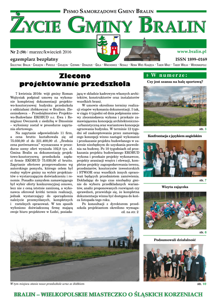 PISMO SAMORZĄDOWE GMINY BRALIN ŻYCIE GMINY BRALIN Nr 2 (50) | marzec/kwiecień 2016 www.bralin.pl egzemplarz bezpłatny ISSN 1899–0169 Sołectwa: Bralin · Chojęcin - Parcele · Chojęcin · Czermin · Działosze · Gola · Mnichowice · Nosale · Nowa Wieś Książęca · Tabor Mały · Tabor Wielki · Weronikopole Zlecono projektowanie przedszkola 7 kwietnia 2016r. wójt gminy Roman Wojtysiak podpisał umowę na wykonanie kompletnej dokumentacji projektowo-kosztorysowej budynku przedszkola z oddziałami żłobkowymi w Bralinie. Zleceniodawca – Przedsiębiorstwo Projektowo-Budowlane EKOBUD s.c. Ewa i Remigiusz Owczarek z siedzibą w Dmosinie – wyłoniony został w procedurze zapytania ofertowego. Na zapytanie odpowiedziało 11 firm, a cena brutto kształtowała się od 75.030,00 zł do 221.400,00 zł. „Średnia cena porównawcza” wyznaczana w procedurze oceny ofert wyniosła 102,8 tys. zł. Gmina Bralin za dokumentację projektowo-kosztorysową przedszkola zapłaci firmie EKOBUD 75.030,00 zł brutto. Zapytanie ofertowe przeprowadzono wg autorskiego pomysłu, którego celem był realny wpływ gminy na wybór projektantów o wystarczającym doświadczeniu i renomie. Ponadto zamysłem zamawiającego był wybór oferty konkurencyjnej cenowo, lecz nie z ceną istotnie zaniżoną, a wykonawca oferował krótki termin realizacji, jednak wystarczający do sporządzenia należycie przemyślanych, kompletnych i rzetelnych opracowań. W ten sposób wyłoniono doświadczoną firmę mającą swoje biuro projektowe w Łodzi, posiada- jącą w składzie kadrowym własnych architektów, konstruktorów oraz instalatorów wszelkich branż. W umowie określono terminy realizacji etapów wykonania dokumentacji. I tak, w ciągu 4 tygodni od dnia podpisania umowy zleceniodawca wykona i przekaże zamawiającemu koncepcję architektoniczno-urbanistyczną oraz wariantowe koncepcje ogrzewania budynku. W terminie 12 tygodni od zaakceptowania przez zamawiającego koncepcji winno nastąpić wykonanie i przekazanie projektu budowlanego w zakresie niezbędnym do uzyskania pozwolenia na budowę. Po 10 tygodniach od przekazania projektu budowlanego EKOBUD wykona i przekaże projekty wykonawcze, projekty aranżacji wnętrz i elewacji, kompletne projekty zagospodarowania terenu, przedmiarów, kosztorysów inwestorskich i STWiOR oraz wszelkich innych opracowań będących przedmiotem zamówienia. Dokładając do tego czas niezbędny gminie do wyboru przedkładanych wariantów, analiz proponowanych rozwiązań czy sprawdzeń, przewiduje się, że kompletna dokumentacja winna być dostępna do końca listopada tego roku. Po konsultacji z dyrektorem przedszkola projektantom określono wymagacd. na str. 2 W numerze: Czy jest szansa na halę sportową? str. 3 Konfrontacja z językiem angielskim str. 7 Wizyta zajączka str. 8 Podsumowali działalność W tym miejscu stanie nowe przedszkole wraz ze żłobkiem str. 10 BRALIN – WIELKOPOLSKIE MIASTECZKO O ŚLĄSKICH KORZENIACH 2 cd. ze str. 1 nia i wytyczne dotyczące oczekiwań wobec nowego obiektu. W szczególności wskazano, w jakie instalacje wewnętrzne winna być wyposażona nowa placówka. Obiekt ma posiadać własną kuchnię z zapleczem o przemyślanej technologii i należytej ergonomii. Wskazano projektantom, aby dobierając materiały budowlane, w szczególności wykończeniowe oraz przyjmując określone rozwiązania techniczne, mieć na uwadze wysoką trwałość obiektu i jego poszczególnych elementów, wygodę eksploatacji, minimalizację kosztów eksploatacji. Z życia urzędu Przypomnijmy, że planowane jest powstanie placówki 8-oddziałowej, z czego 4 to oddziały przedszkolne, 2 oddziały typowo żłobkowe dla 2-letnich dzieci oraz 2 oddziały żłobkowo-przedszkolne dla 3-letnich dzieci. Według zakładanego harmonogramu rozpoczęcie robót planowane jest wczesną wiosną 2017 roku. Do końca 2017 roku przewiduje się osiągnięcie stanu surowego zamkniętego. Pozwoli to na prowadzenie prac wewnętrznych instalacyjnych i wykończeniowych w okresie zimowym i wczesnowiosennym. Okres wakacji 2018 roku zarezerwowany byłby na dokonywanie O kanalizacji na Komisji Rolnictwa 24 lutego 2016 roku odbyło się pierwsze w tym roku posiedzenie Komisji Rolnictwa, Gospodarki Wodnej i Ochrony Środowiska. W obradach udział wzięli Wójt Gminy Bralin pan Roman Wojtysiak, kierownik referatu inwestycji pan Artur Wójcik, pani Marzena Kuropka,pani Małgorzata Krzak, pani Anna Piasecka, sołtysi z poszczególnych sołectw oraz radni gminni – członkowie Komisji Rolnictwa. Pierwszym punktem obrad było ustalenie i przyjęcie ramowego planu pracy komisji na 2016 rok, co jednogłośnie zostało przyjęte. Następnie omówiono szereg zagadnień związanych z gospodarką wodno–ściekową gminy Bralin, ze szczególnym uwzględnieniem perspektyw pozyskiwania funduszy pozabudżetowych na ten cel. Wójt Gminy Bralin dość szeroko omówił powyższy temat, relacjonując, iż przygotowana jest dokumentacja projektowa na Chojęcin, a w przygotowaniu projekt na Mnichowice. To kierunki, które w tej kadencji są priorytetem do zrealizowania. Jeśli chodzi o środki unijne, to w marcu 2016 roku ruszył nabór wniosków w tym kierunku z programu Wielkopolski Regionalny Program Operacyjny 2014+, jednak jesteśmy aglomeracją niespełniającą podstawowego wymogu, tj. 10 tys. mieszkańców i nie możemy z tego skorzystać. Dopiero w III kwartale 2016 roku prawdopodobnie zostanie ogłoszony nabór do 6 tys. mieszkańców i ewentualnie wtedy gmina złoży wniosek albo na Chojęcin (5 etapów) – tam są już gotowe projekty, albo Mnichowice – projekt w przygotowaniu. Jednak nawet jeżeli wnioski zostaną złożone, to realizacja może być nie wcześniej niż w 2017 roku. Oprócz tych projektów wójt zarządził przygotowanie dokumentacji w miejscowościach, w których są poPGRowskie bloki, tj. w Nosalach i Mnichowicach, ponieważ tam jest najtrudniejsza sytuacja, jeśli ch