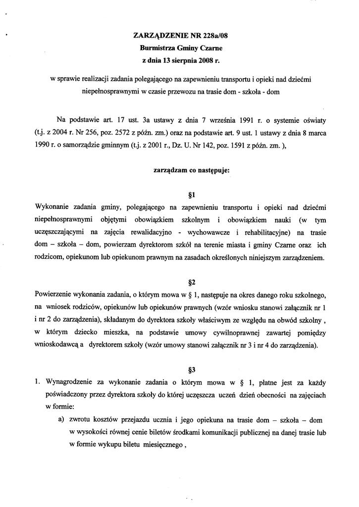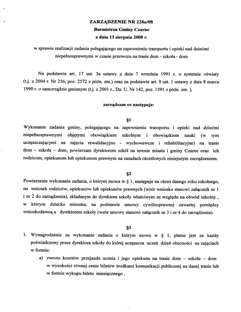 . .ZARZ¥DZENIE NR 228a/08 Burmistrza Gminy Czarne z dnia 13 sierpnia 2008 r. w sprawie realizacji zadania polegaj¹cego na zapewnieniu transportu i opieki nad dzieæmi niepe³nosprawnymi w czasie przewozu na trasie dom -szko³a -dom Na podstawie art. 17 ust. 3a ustawy z dnia 7 wrzeœnia 1991 r. o systemie oœwiaty (t.j. z 2004 r. Nr 256, poz. 2572 z póŸnozm.) oraz na podstawie art. 9 ust. 1 ustawy z dnia 8 marca 1990 r. o samorz¹dzie gminnym (t.j. z 2001 r., Dz. U. Nr 142, poz. 1591 z póŸnozm.), zarz¹dzam co nastêpuje: §1 Wykonanie zadania gminy, polegaj¹cego na zapewnieniu transportu i opieki nad dzieæmi niepe³nosprawnymi uczêszczaj¹cymi dom -szko³a objêtymi obowi¹zkiem na zajêcia rewalidacyjno -dom, szkolnym i -wychowawcze obowi¹zkiem i nauki rehabilitacyjne) (w tym na trasie powierzam dyrektorom szkó³ na terenie miasta i gminy Czarne oraz ich rodzicom, opiekunom lub opiekunom prawnym na zasadachokreœlonychniniejszym zarz¹dzeniem. §2 Powierzenie wykonania zadania, o którym mowa w § 1, nastêpuje na okres danego roku szkolnego, na wniosek rodziców, opiekunów lub opiekunów prawnych (wzór wniosku stanowi za³¹cznik nr 1 i nr 2 do zarz¹dzenia), sk³adanym do dyrektora szko³y w³aœciwymze wzglêdu na obwód szkolny, w którym dziecko mieszka, na podstawie umowy cywilnoprawnej zawartej pomiêdzy wnioskodawc¹ a dyrektorem szko³y (wzór umowy stanowi za³¹cznik nr 3 i nr 4 do zarz¹dzenia). §3 1. Wynagrodzenie za wykonanie zadania o którym mowa w § 1, p³atne jest za ka¿dy poœwiadczonyprzez dyrektora szko³y do której uczêszcza uczeñ dzieñ obecnoœcina zajêciach w formie: a) zwrotu kosztów przejazdu ucznia i jego opiekuna na trasie dom -szko³a -dom w wysokoœci równej cenie biletów œrodkamikomunikacji publicznej na danej trasie lub w formie wykupu biletu miesiêcznego, .b) zwrotu kosztów przejazdu za 1 kilometr przebiegu pojazdu w wysokoœci 100% stawki okreœlonejrozporz¹dzeniem Ministra Infrastruktury z dnia 25 marca 2002 r. w sprawie warunków ustalania oraz sposobu dokonywania zwrotu kosztów u¿ywania do celów s³u¿bowych samochodów osobowych, motocykli i motorowerów niebêd¹cych w³asnoœci¹ pracodawcy (Dz.U. Nr 27, poz. 271 z póŸno zm.), w zale¿noœci od pojemnoœciskokowej silnika posiadanegosamochodu. 2. Wysokoœæwynagrodzenia o którym mowa w § 3 ust.1, pkt b, ustala siê jako iloczyn liczby kilometrów na trasie dom -szko³a -dom i dni obecnoœcidziecka na zajêciach. 3. Podstaw¹ wyp³aty wynagrodzenia o którym mowa w ust. 1 i 2, jest oœwiadczenierodziców, opiekunów lub opiekunów prawnych z³o¿one nie póŸniej ni¿ do 5 dnia nastêpnego miesi¹ca, potwierdzaj¹ce realizacjê uzgodnionych w umowie warunków (wzór oœwiadczeniastanowi . za³¹cznik do umowy). §4 Wyp³ata wynagrodzenia rodzicom, opiekunom lub opiekunom prawnym nastêpuje z do³u do 15 dnia nastêpnego miesi¹ca -po zrealizowaniu zadania dowozu i opieki nad dzieckiem, potwierdzonego w sposób okreœlonyw § 3 ust. 1 zarz¹dzenia. §4 Wykonanie zarz¹dzenie powierzam dyrektorom szkó³ na terenie miasta i gminy Czarne oraz Sekretarzowi Gminy i Skarbnikowi Gminy.. §5 Zarz¹dzenie wchodzi w ¿ycie z dniem podpisania i podlega og³oszeniu na tablicy og³oszeñ Urzêdu Miasta i Gminy w Czarnem i ma zastosowaniedo umów od O1 wrzeœnia2008r. BU in¿. RZ iuk . Za³¹cznik nr 1do Zarz¹dzeniaNr 228a/08 BurmistrzaGminy Czarnez dnia 13 sierpnia 2008r. Imiê i nazwiskownioskodawcy Adres zamieszkania Nr rachunkubankowego Dyrektor Wniosek Proszê o zwrot kosztów przejazdu ucznia niepe³nosprawnegoœrodkiemlokomocji publicznej( PKS, PKP) (zakupbiletu miesiêcznego) * (imiê i nazwisko dziecka) (dataurodzenia) zamieszka³egow orazjego opiekuna* do (nazwai adresszko³y) Uczeñdowo¿onybêdziepod opiek¹ rodzica/opiekuna/opiekuna prawnego* (imiê i nazwisko,nr dowodu osobistego) zamieszka³egow ( PodpiswnioskodawcyO * skreœliæ, je¿eli nie dotyczy Za³¹czniki: l. Aktualne zaœwiadczenie ze szko³ypoœwiadczaj¹ce,.. ¿edzieckojest uczniemtej szko³y, 2. Orzeczenieo stopniuniepe³nosprawnoœci. t . Za³¹cznik nr 2 do Zarz¹dzeniaNr 2288/08 BunnistrzaGminy Czarnez dnia 13 sierpnia 2008 r. .,,."',,-.. ", ~'~:;c1 Imiê i nazwiskownioskodawcy .,..,~";;; Adres zamieszkania Dyrektor Nr rachunkubankowego Wniosek P "~ oC" ", ';"," ,j Proszê ': o powierzenie mi transportu io opieki nad uczniem niepe³nosprawnym ":' (imiê i nazwiskodziecka) zamieszka³ym w Dziecko uczêszczado kl. w (nazwai adresszko³y) Iloœækilometrów na trasie dom-szko³a-dom km Dziecko dowo¿one bêdzie przez rodzica/opiekuna/opiekuna prawnego (imiê i nazwisko,nr dowodu osobistego) zamieszka³ego w . bêd¹cego w³aœcicielemsamochodu-marka o pojemnoœcisilnika i numerze rejestracyjnym nr polisy ubezpieczeniowej od odpowiedzialnoœcicywilnej (OC) nr polisy ubezpieczeniowej od nieszczêœliwych wypadków nr polisy ubezpieczeniowej transportu dziecka niepe³nosprawnego Podpiswnioskodawc Za³¹czniki: 1. Aktualne zaœwiadczenieze szko³y poœwiadczaj¹ce,¿e dziecko jest uczniem tej szko³y 2. Orzeczenie o stopniu niepe³nosprawnoœci ~"c,ii~ ..c,;~ (NW) ~'; '-r Za³¹cznik nr 3 do Zan¹dzenia Nr 228a/08 BurmistrzaGminy Czarnez dnia 13 sierpnia 2008r. UMOWA Zawarta w dniu w Nr /200.. pomiêdzy: , dzia³aj¹cego Dyrektora z upowa¿nienia Burmistrza Gminy Czarne a Pani¹/Panem osobistym numer: prawnym , , dziecka reprezentowan¹ przez: , legitymuj¹cym siê dowodem rodzicem/opiekunem/opiekunem niepe³nosprawnego , zamieszka³ym w §1 Realizuj¹c obowi¹zki Gminy Czarne wynikaj¹ce z art. 17 ust. 3a ustawy z dnia 7 wrzeœnia1991 r. o systemie oœwiaty (t.j. Dz. U. z 2004 r. Nr 256 poz. 2572 z póŸno zm.) Pani/Pan zapewni dowo¿enie i opiekê --dziecku zamieszka³emu niepe³nosprawnemu w drodze do (nazwai adresszko³y) i z powrotem, bior¹c za nie odpowiedzialnoœæ w tym czasie. l. §2 Za wykonanie zadania ustala siê miesiêczne wynagrodzenie w formie zwrotu kosztów przejazdu ucznia i jego opie