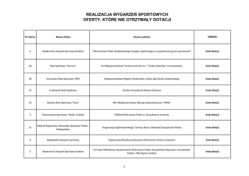 REALIZACJA WYDARZEŃ SPORTOWYCH OFERTY, KTÓRE NIE OTRZYMAŁY DOTACJI Nr oferty Nazwa Klubu Nazwa zadania UWAGI 6 Akademicki Związek Sportowy Kraków "Mistrzostwa Polski Akademickiego Związku Sportowego w zespołowych grach sportowych" brak dotacji 30 Klub Sportowy "Korona" XV Międzynarodowy Turniej Juniorów im." Tomka Kowalika" w koszykówce brak dotacji 36 Uczniowki Klub Sportowy 1993 Międzynarodowe Regaty Wioślarskie o Złoty Ząb Smoka Wawelskiego brak dotacji 32 Krakowski Klub Kajakowy Puchar Prezydenta Miasta Krakowa brak dotacji 33 Szkolny Klub Sportowy "Kusy" XXII Międzynarodowy Mityng Lekkoatletyczny "KRAK" brak dotacji 3 Towarzystwo Sportowe "Wisła" Kraków Półfinał Mistrzostw Polski w Koszykówce Juniorek brak dotacji 21 Oddział Regionalny Olimpiady Specjalne Polska Małopolskie Organizacja Ogólnopolskiego Turnieju Bocce Olimpiad Specjalnych Polska brak dotacji 8 Małopolski Związek Szachowy Organizacja Miedzynarodowych Mistrzostw Polski w Szachach brak dotacji 5 Akademicki Związek Sportowy Kraków Turnieje Półfinałowe Akademickich Mistrzostw Polski, Koszykówka Mężczyzn, Koszykówka Kobiet, Piłka Ręczna Kobiet brak dotacji 1 20 Krakowski Kolejowy Klub Sportowy Ogólnopolski Turniej Klasyfikacyjny Kadetów Memoriał Józefa Hebdy brak dotacji 7 Małopolski Związek Szachowy Organizacja Międzynarodowego Turnieju o Wieżę Wolnosci 1918 w Szachach brak dotacji 19 Krakowski Kolejowy Klub Sportowy Ogólnopolski Turniej Klasyfikacyjny Memoriał Ernesta Wittmanna Młodzików brak dotacji 23 Krakowski Klub Jazdy Konnej Eliminacje Ogólnopolskiej Olimpiady Młodzieży brak dotacji 17 Krakowski Kolejowy Klub Sportowy Mistrzostwa Małopolski Krasnali brak dotacji 2