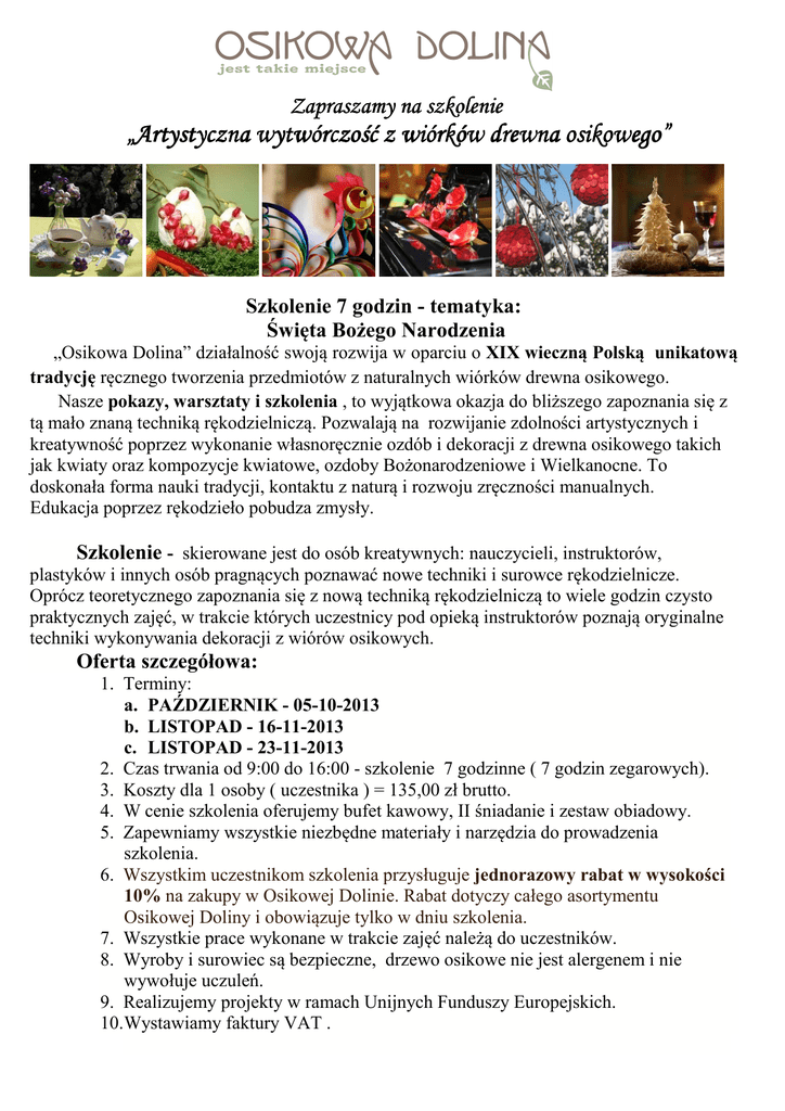 Zapraszamy na szkolenie „Artystyczna wytwórczość z wiórków wiórków drewna osikowego” osikowego” Szkolenie 7 godzin - tematyka: Święta Bożego Narodzenia „Osikowa Dolina” działalność swoją rozwija w oparciu o XIX wieczną Polską unikatową tradycję ręcznego tworzenia przedmiotów z naturalnych wiórków drewna osikowego. Nasze pokazy, warsztaty i szkolenia , to wyjątkowa okazja do bliższego zapoznania się z tą mało znaną techniką rękodzielniczą. Pozwalają na rozwijanie zdolności artystycznych i kreatywność poprzez wykonanie własnoręcznie ozdób i dekoracji z drewna osikowego takich jak kwiaty oraz kompozycje kwiatowe, ozdoby Bożonarodzeniowe i Wielkanocne. To doskonała forma nauki tradycji, kontaktu z naturą i rozwoju zręczności manualnych. Edukacja poprzez rękodzieło pobudza zmysły. Szkolenie - skierowane jest do osób kreatywnych: nauczycieli, instruktorów, plastyków i innych osób pragnących poznawać nowe techniki i surowce rękodzielnicze. Oprócz teoretycznego zapoznania się z nową techniką rękodzielniczą to wiele godzin czysto praktycznych zajęć, w trakcie których uczestnicy pod opieką instruktorów poznają oryginalne techniki wykonywania dekoracji z wiórów osikowych. Oferta szczegółowa: 1. Terminy: a. PAŹDZIERNIK - 05-10-2013 b. LISTOPAD - 16-11-2013 c. LISTOPAD - 23-11-2013 2. Czas trwania od 9:00 do 16:00 - szkolenie 7 godzinne ( 7 godzin zegarowych). 3. Koszty dla 1 osoby ( uczestnika ) = 135,00 zł brutto. 4. W cenie szkolenia oferujemy bufet kawowy, II śniadanie i zestaw obiadowy. 5. Zapewniamy wszystkie niezbędne materiały i narzędzia do prowadzenia szkolenia. 6. Wszystkim uczestnikom szkolenia przysługuje jednorazowy rabat w wysokości 10% na zakupy w Osikowej Dolinie. Rabat dotyczy całego asortymentu Osikowej Doliny i obowiązuje tylko w dniu szkolenia. 7. Wszystkie prace wykonane w trakcie zajęć należą do uczestników. 8. Wyroby i surowiec są bezpieczne, drzewo osikowe nie jest alergenem i nie wywołuje uczuleń. 9. Realizujemy projekty w ramach Unijnych Funduszy Europejskich. 10.Wystawiamy faktury VAT . Szkolenie 7 godzin - tematyka: Święta Bożego Narodzenia Uczestnicy szkolenia wykonają następujące dekoracje: 1. Aniołki Obiata 2. Dzwonki Delja 3. Bombka Obiata 4. Osikowe Gwiazdki 5. Osikowa Kartka Świąteczna Zapraszamy do współpracy. Roman Noszczyk 42-350 Koziegłowy, ul. Żarecka 52, Tel. +48 34 366-14-95, 601-933-445 www.osikowadolina.pl, [email protected]