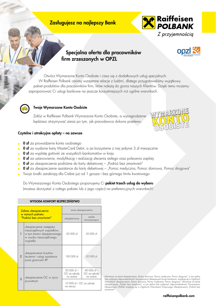 Zasługujesz na najlepszy Bank Specjalna oferta dla pracowników firm zrzeszonych w OPZL Otwórz Wymarzone Konto Osobiste i ciesz się z dodatkowych usług specjalnych. W Raiffeisen Polbank cenimy wzajemne relacje z ludźmi, dlatego przygotowaliśmy wyjątkowy pakiet produktów dla pracowników firm, które należą do grona naszych Klientów. Dzięki temu możemy zaproponować Ci usługi bankowe na jeszcze korzystniejszych niż ogólne warunkach. Twoje Wymarzone Konto Osobiste Załóż w Raiffeisen Polbank Wymarzone Konto Osobiste, a wynagrodzenie będziesz otrzymywać zaraz po tym, jak pracodawca dokona przelewu. Czytelne i atrakcyjne opłaty – na zawsze 0 zł za prowadzenie konta osobistego 0 zł za wydanie karty MasterCard Debit, a za korzystanie z niej jedynie 3 zł miesięcznie 0 zł za wypłatę gotówki ze wszystkich bankomatów w kraju 0 zł za ustanowienie, modyfikację i realizację zlecenia stałego oraz polecenia zapłaty 0 zł za ubezpieczenie podróżne do karty debetowej – „Podróż bez zmartwień” 0 zł za ubezpieczenie assistance do karty debetowej – „Pomoc medyczna, Pomoc domowa, Pomoc drogowa” Twoje środki zarabiają dla Ciebie już od 1 grosza i bez górnego limitu kwotowego Do Wymarzonego Konta Osobistego proponujemy Ci pakiet trzech usług do wyboru (możesz skorzystać z całego pakietu lub z jego części) na preferencyjnych warunkach! WYGODA KOMFORT BEZPIECZEŃSTWO Zakres ubezpieczenia w ramach pakietu: “Podróż bez zmartwień” 1 ubezpieczenie następstw nieszczęśliwych wypadków, w tym śmierci ubezpieczonego w wyniku nieszczęśliwego wypadku 2 ubezpieczenie kosztów leczenie i usługi assistance poza granicami RP 3 ubezpieczenie OC w życiu prywatnym suma ubezpieczenia ubezpieczony osoba towarzysząca 50 000 zł 50 000 zł 100 000 zł 50 000 zł 50 000 zł – OC za szkody na osobie 40 000 zł – OC za szkody na osobie 10 000 zł – OC za szkody na rzeczy Informacja na temat ubezpieczenia „Pomoc domowa, Pomoc medyczna, Pomoc drogowa”, w tym pełna lista wyłączeń odpowiedzialności Tworzarzystwa Ubezpieczeń Europ Assistance, znajdują się w Ogólnych Warunkach Ubezpieczenia „Pomoc domowa, Pomoc medyczna, Pomoc drogowa”. Informacje na temat ubezpieczenia „Podróż bez zmartwień”, w tym pełna lista wyłączeń odpowiedzialności Towarzystwa Ubezpieczeń UNIQA znajdują się w Ogólnych Warunkach Grupowego Ubezpieczenia „Podróż bez zmartwień”. raiffeisenpolbank.com Kredyt na Miarę Atrakcyjnie oprocentowany kredyt możesz przeznaczyć na dowolny cel. Udostępniamy gotówkę bez zabezpieczeń i poręczycieli, aby każdy mógł zrealizować swoje plany ze spokojną głową. Warunki dla Ciebie: oprocentowanie 6,99% w skali roku 0 zł za przyznanie kredytu okres spłaty kredytu nawet do 8 lat aż do 150 000 zł Kwota kredytu netto 5 000 Okres kredytowania 10 000 15 000 20 000 Miesięczna rata (PLN)) 2 lata 223,81 447,36 671,44 895,25 3 lata 154,35 308,70 463,05 617,40 4 lata 119,70 239,41 359,11 478,81 Rzeczywista roczna stopa oprocentowania (RRSO) Kredytu na Miarę spłacanego w 73 równych ratach miesięcznych, gdzie kwota udzielonegokredytu wynosi 19 950 zł i obejmuje wartość finansowanej kredytem prowizji w wysokości 0%, tj. 0 zł, z uwzględnieniem oprocentowania nominalnego w wysokości 6,99%, wynosi 7,22%. Miesięczna rata Kredytu na Miarę równa jest 336,28 zł, całkowita kwota do zapłaty przez konsumenta wynosi 24 548,26 zł, a całkowita kwota kredytu to 19 950 zł. Stan na dzień 1.07.2015 r. Karta kredytowa Wygodna Karta Kredytowa Visa, karta kredytowa World MasterCard Class&Club lub Platynowa Visa to doskonały sposób na zakupy małe czy duże, zaplanowane czy spontaniczne. Karty kredytowe Raiffeisen Polbank sprawdzą się zawsze i wszędzie. 0 zł opłaty miesięcznej przez pierwsze pół roku korzystania z Wygodnej Karty Kredytowej Visa lub karty kredytowej World MasterCard Class&Club 200 zł za wydanie karty kredytowej Platynowa Visa Możliwość rozłożenia większych zakupów na wygodne raty Atrakcyjne programy lojalnościowe i promocje Dla Wygodnej Karty Kredytowej Visa z limitem kredytowym w wysokości (całkowita kwota kredytu) 2250 PLN, stopie oprocentowania w wysokości 10%, opłacie miesięcznej za prowadzenie Konta karty w wysokości 5 PLN, całkowita kwota do zapłaty wynosi 2 912,39 PLN, RRSO wynosi 14,27%. Wyliczenia dokonano na dzień 26.10.2015 r. Pierwszy MC – 3 000 PLN Dla karty kredytowej World MasterCard Class&Club z limitem kredytowym w wysokości (całkowita kwota kredytu) 4050 PLN, stopie oprocentowania w wysokości 10%, opłacie miesięcznej za prowadzenie Konta karty w wysokości 5 PLN, całkowita kwota do zapłaty wynosi 5 137,80 PLN, RRSO wynosi 12,92%. Wyliczenia dokonano na dzień 26.10.2015 r. Dla karty kredytowej Platynowa Visa z limitem kredytowym w wysokości (całkowita kwota kredytu) 19 700 PLN, stopie oprocentowania w wysokości 10%, opłacie za wydanie i prowadzenie Konta karty w pierwszym roku obowiązywania Umowy w wysokości 400 PLN, opłacie rocznej za prowadzenie Konta karty w kolejnych latach obowiązywania Umowy w wysokości 400 PLN, całkowita kwota do zapłaty wynosi 25 717,68 PLN, RRSO wynosi 14,63%. Wyliczenia dokonano na dzień 26.10.2015 r. Lokata Lokata terminowa to prosty i bezpieczny sposób pomnażania pieniędzy. Możesz spełniać marzenia i cieszyć się zyskami dzięki tej formie oszczędzania! 2,6% w skali roku okres 3 m-cy od 3000 zł bez górnego limitu Jak skorzystać z oferty? Wystarczy zarejestrować się na stronie: https://wnioski.raiffeisenpolbank.com/oferta_dla_pracownikow Następnie udać do najbliższej Placówki Banku. Oferta ważna do: 31-01-2016 r. Raiffeisen Polbank 65-427 Zielona Góra, ul. Wrocławska 17b, tel. +48 728 889 355 raiffeisenpolbank.com