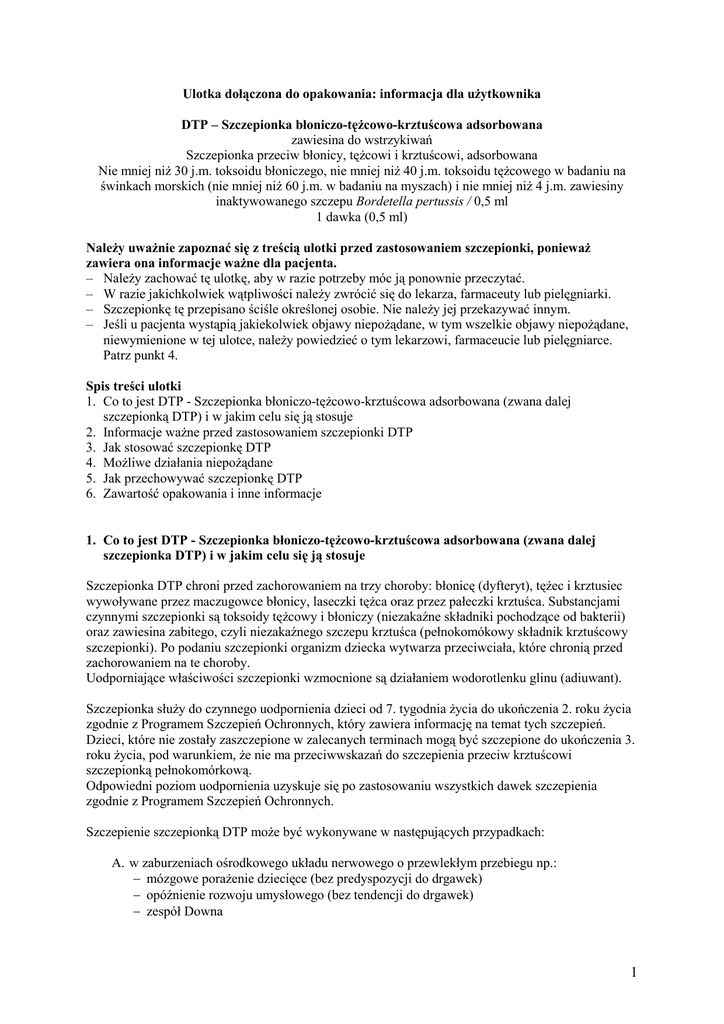 Ulotka dołączona do opakowania: informacja dla użytkownika DTP – Szczepionka błoniczo-tężcowo-krztuścowa adsorbowana zawiesina do wstrzykiwań Szczepionka przeciw błonicy, tężcowi i krztuścowi, adsorbowana Nie mniej niż 30 j.m. toksoidu błoniczego, nie mniej niż 40 j.m. toksoidu tężcowego w badaniu na świnkach morskich (nie mniej niż 60 j.m. w badaniu na myszach) i nie mniej niż 4 j.m. zawiesiny inaktywowanego szczepu Bordetella pertussis / 0,5 ml 1 dawka (0,5 ml) Należy uważnie zapoznać się z treścią ulotki przed zastosowaniem szczepionki, ponieważ zawiera ona informacje ważne dla pacjenta. – Należy zachować tę ulotkę, aby w razie potrzeby móc ją ponownie przeczytać. – W razie jakichkolwiek wątpliwości należy zwrócić się do lekarza, farmaceuty lub pielęgniarki. – Szczepionkę tę przepisano ściśle określonej osobie. Nie należy jej przekazywać innym. – Jeśli u pacjenta wystąpią jakiekolwiek objawy niepożądane, w tym wszelkie objawy niepożądane, niewymienione w tej ulotce, należy powiedzieć o tym lekarzowi, farmaceucie lub pielęgniarce. Patrz punkt 4. Spis treści ulotki 1. Co to jest DTP - Szczepionka błoniczo-tężcowo-krztuścowa adsorbowana (zwana dalej szczepionką DTP) i w jakim celu się ją stosuje 2. Informacje ważne przed zastosowaniem szczepionki DTP 3. Jak stosować szczepionkę DTP 4. Możliwe działania niepożądane 5. Jak przechowywać szczepionkę DTP 6. Zawartość opakowania i inne informacje 1. Co to jest DTP - Szczepionka błoniczo-tężcowo-krztuścowa adsorbowana (zwana dalej szczepionka DTP) i w jakim celu się ją stosuje Szczepionka DTP chroni przed zachorowaniem na trzy choroby: błonicę (dyfteryt), tężec i krztusiec wywoływane przez maczugowce błonicy, laseczki tężca oraz przez pałeczki krztuśca. Substancjami czynnymi szczepionki są toksoidy tężcowy i błoniczy (niezakaźne składniki pochodzące od bakterii) oraz zawiesina zabitego, czyli niezakaźnego szczepu krztuśca (pełnokomókowy składnik krztuścowy szczepionki). Po podaniu szczepionki organizm dziecka wytwarza przeciwciała, które chronią przed zachorowaniem na te choroby. Uodporniające właściwości szczepionki wzmocnione są działaniem wodorotlenku glinu (adiuwant). Szczepionka służy do czynnego uodpornienia dzieci od 7. tygodnia życia do ukończenia 2. roku życia zgodnie z Programem Szczepień Ochronnych, który zawiera informację na temat tych szczepień. Dzieci, które nie zostały zaszczepione w zalecanych terminach mogą być szczepione do ukończenia 3. roku życia, pod warunkiem, że nie ma przeciwwskazań do szczepienia przeciw krztuścowi szczepionką pełnokomórkową. Odpowiedni poziom uodpornienia uzyskuje się po zastosowaniu wszystkich dawek szczepienia zgodnie z Programem Szczepień Ochronnych. Szczepienie szczepionką DTP może być wykonywane w następujących przypadkach: A. w zaburzeniach ośrodkowego układu nerwowego o przewlekłym przebiegu np.: − mózgowe porażenie dziecięce (bez predyspozycji do drgawek) − opóźnienie rozwoju umysłowego (bez tendencji do drgawek) − zespół Downa 1 B. jeżeli stwierdzono drgawki przygodne w wywiadzie, ale wtedy zaleca się osłonę farmakologiczną i ocenę EEG (elektroencefalografię) C. u niemowląt i dzieci z rozpoznaną padaczką, u których napady nie występują od co najmniej 12 miesięcy, w wyniku leczenia. Szczepienia w tej grupie powinny odbywać się pod osłoną dotychczas stosowanych leków D. u niemowląt, jeżeli u członków rodziny występowały drgawki lub ewentualnie reakcje poszczepienne po szczepieniu szczepionką DTP E. u dzieci z obniżoną odpornością np. związaną z zakażeniem wirusem HIV, nawet wówczas, jeżeli uzyska się odpowiedź w ograniczonym stopniu. 2. Informacje ważne przed zastosowaniem szczepionki DTP Kiedy nie stosować szczepionki DTP − jeśli u dziecka występuje/ą: • uczulenie na substancje czynne lub którykolwiek z pozostałych składników tej szczepionki (wymienione w punkcie 6). Objawy uczulenia to: wysypka lub wysypka z pęcherzami, która może być swędząca, obrzęk okolicy oczu i twarzy, trudności w oddychaniu i połykaniu, nagły spadek ciśnienia krwi i utrata przytomności, • ostre stany chorobowe przebiegające z gorączką. Łagodne infekcje nie są przeciwwskazaniem do podania szczepionki, • choroby przewlekłe w okresie zaostrzenia. W tych przypadkach szczepienie należy wykonać po ustąpieniu zaostrzenia choroby, − jeśli w ciągu 2 dni od poprzedniego podania szczepionki u dziecka: • wystąpił trwający 3 i więcej godzin nieutulony ciągły płacz lub krzyk o wysokich tonach (krzyk mózgowy), • nastąpiło podwyższenie temperatury ciała do 40,5ºC i powyżej, niewywołane innymi czynnikami, − jeśli w ciągu 3 dni od poprzedniego podania szczepionki u dziecka: • wystąpiły objawy mózgowe manifestujące się zaburzeniem świadomości i ogniskowymi objawami neurologicznymi, • wystąpiły drgawki przebiegające z gorączką lub bez, − jeśli w ciągu 7 dni od poprzedniego szczepienia u dziecka miała miejsce utrata świadomości lub epizod hipotensyjno – hiporeaktywny (obniżenie ciśnienia, zwiotczenie mięśni, zmniejszona wrażliwość na bodźce, senność, bladość i (lub) zasinienie skóry) mogące przebiegać z zaburzeniami oddychania. Jeżeli istnieją jakiekolwiek przeciwwskazania do szczepienia DTP - Szczepionką błoniczo-tężcowokrztuścową adsorbowaną, to należy ocenić ryzyko podania szczepionki w stosunku do ryzyka wystąpienia zakażenia. Ostrzeżenia i środki ostrożności Szczepienie powinno być poprzedzone badaniem lekarskim i wywiadem na temat ogólnego stanu zdrowia oraz wcześniej wykonanych i zanotowanych szczepień. Postępowanie takie pozwala przewidzieć ryzyko wystąpienia działań niepożądanych po podaniu szczepionki DTP. Zachować szczególną ostrożność i poinformować lekarza, jeśli po poprzedniej dawce 