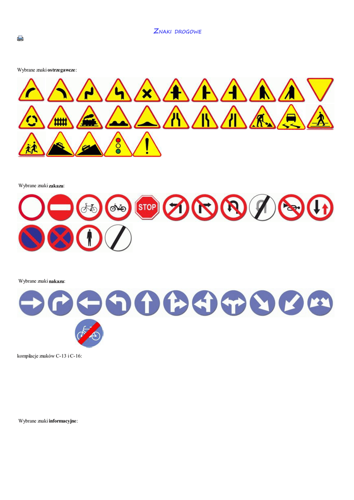 ZNAKI Wybrane znaki ostrzegawcze: Wybrane znaki zakazu: Wybrane znaki nakazu: kompilacje znaków C-13 i C-16: Wybrane znaki informacyjne: DROGOWE Wybrane tabliczki do znaków: Wybrane znaki poziome: Znaki szlaków rowerowych: Wszystkie znaki drogowe z dokładnymi opisami: ostrzegawcze, zakazu, nakazu, informacyjne, poziome, tabliczki do znaków, znaki uzupełniające, kierunku i miejscowości.
