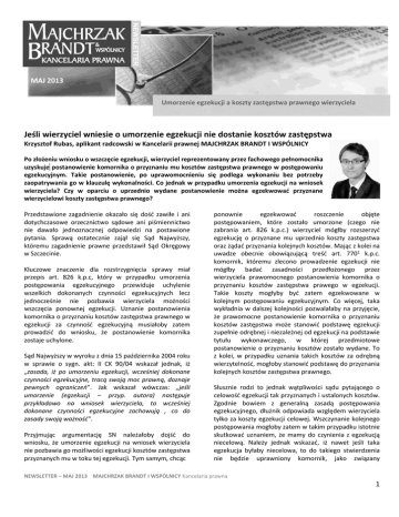 MAJ 2013 Umorzenie egzekucji a koszty zastępstwa prawnego wierzyciela Jeśli wierzyciel wniesie o umorzenie egzekucji nie dostanie kosztów zastępstwa Krzysztof Rubas, aplikant radcowski w Kancelarii prawnej MAJCHRZAK BRANDT I WSPÓLNICY Po złożeniu wniosku o wszczęcie egzekucji, wierzyciel reprezentowany przez fachowego pełnomocnika uzyskuje postanowienie komornika o przyznaniu mu kosztów zastępstwa prawnego w postępowaniu egzekucyjnym. Takie postanowienie, po uprawomocnieniu się podlega wykonaniu bez potrzeby zaopatrywania go w klauzulę wykonalności. Co jednak w przypadku umorzenia egzekucji na wniosek wierzyciela? Czy w oparciu o uprzednio wydane postanowienie można egzekwować przyznane wierzycielowi koszty zastępstwa prawnego? Przedstawione zagadnienie okazało się dość zawiłe i ani dotychczasowe orzecznictwo sądowe ani piśmiennictwo nie dawało jednoznacznej odpowiedzi na postawione pytania. Sprawą ostatecznie zajął się Sąd Najwyższy, któremu zagadnienie prawne przedstawił Sąd Okręgowy w Szczecinie. Kluczowe znaczenie dla rozstrzygnięcia sprawy miał przepis art. 826 k.p.c, który w przypadku umorzenia postępowania egzekucyjnego przewiduje uchylenie wszelkich dokonanych czynności egzekucyjnych lecz jednocześnie nie pozbawia wierzyciela możności wszczęcia ponownej egzekucji. Uznanie postanowienia komornika o przyznaniu kosztów zastępstwa prawnego w egzekucji za czynność egzekucyjną musiałoby zatem prowadzić do wniosku, że postanowienie komornika zostaje uchylone. Sąd Najwyższy w wyroku z dnia 15 października 2004 roku w sprawie o sygn. akt: II CK 90/04 wskazał jednak, iż „zasada, iż po umorzeniu egzekucji, wcześniej dokonane czynności egzekucyjne, tracą swoją moc prawną, doznaje pewnych ograniczeń”. Jak wskazał wówczas: „jeśli umorzenie (egzekucji – przyp. autora) następuje przykładowo na wniosek wierzyciela, to wcześniej dokonane czynności egzekucyjne zachowują , co do zasady swoją ważność”. Przyjmując argumentację SN należałoby dojść do wniosku, że umorzenie egzekucji na wniosek wierzyciela nie pozbawia go możliwości egzekucji kosztów zastępstwa przyznanych mu w toku tej egzekucji. Tym samym, chcąc ponownie egzekwować roszczenie objęte postępowaniem, które zostało umorzone (czego nie zabrania art. 826 k.p.c.) wierzyciel mógłby rozszerzyć egzekucję o przyznane mu uprzednio koszty zastępstwa oraz żądać przyznania kolejnych kosztów. Mając z kolei na uwadze obecnie obowiązującą treść art. 7701 k.p.c. komornik, któremu zlecono prowadzenie egzekucji nie mógłby badać zasadności przedłożonego przez wierzyciela prawomocnego postanowienia komornika o przyznaniu kosztów zastępstwa prawego w egzekucji. Takie koszty mogłyby być zatem egzekwowane w kolejnym postępowaniu egzekucyjnym. Co więcej, taka wykładnia w dalszej kolejności pozwalałaby na przyjęcie, że prawomocne postanowienie komornika o przyznaniu kosztów zastępstwa może stanowić podstawę egzekucji zupełnie odrębnej i niezależnej od egzekucji na podstawie tytułu wykonawczego, w której przedmiotowe postanowienie o przyznaniu kosztów zostało wydane. To z kolei, w przypadku uznania takich kosztów za odrębną wierzytelność, mogłoby stanowić podstawę do przyznania kolejnych kosztów zastępstwa prawnego. Słusznie rodzi to jednak wątpliwości sądu pytającego o celowość egzekucji tak przyznanych i ustalonych kosztów. Zgodnie bowiem z generalną zasadą postępowania egzekucyjnego, dłużnik odpowiada względem wierzyciela tylko za koszty egzekucji celowej. Wszczynanie kolejnego postępowania mogłoby zatem w takim przypadku istotnie skutkować uznaniem, że mamy do czynienia z egzekucją niecelową. Należy jednak wskazać, iż nawet jeśli taka egzekucja byłaby niecelowa, to do takiego stwierdzenia nie będzie uprawniony komornik, jako związany NEWSLETTER – MAJ 2013 MAJCHRZAK BRANDT I WSPÓLNICY Kancelaria prawna 1 przedłożonym prawomocnym postanowieniem innego komornika o przyznaniu wierzycielowi kosztów zastępstwa. Przedstawione wątpliwości uwypuklają lukę w prawie, która mogła być wykorzystywana przez wierzycieli dla mnożenia kolejnych postępowań egzekucyjnych w oparciu o ten sam tytuł i tym samym mnożeniu postanowień o przyznaniu im kosztów zastępstwa prawnego. Nie trudno się zatem dziwić, że takiej wykładni przepisów, wspartej dodatkowo orzeczeniem SN z 15 października 2004 w sprawie II CK 90/04 nie zaaprobował SN w składzie podejmującym uchwałę, rozstrzygającą zagadnienie prawne. 8 marca 2013 roku, SN stwierdził bowiem, że „umorzenie postępowania egzekucyjnego na wniosek wierzyciela powoduje uchylenie wydanego w jego toku postanowienia o przyznaniu wierzycielowi od dłużnika kosztów zastępstwa prawnego (art. 826 k.p.c)”. Tym samym, wierzyciel podejmując decyzję o zaniechaniu dalszego prowadzenia egzekucji pozbawia się kosztów zastępstwa prawnego, przyznanych w tym postępowaniu i wobec uchylenia postanowieniu o ich przyznaniu, nie ma podstawy do ich egzekucji – niezależnie czy chciałby je egzekwować łącznie z roszczeniem objętym pierwotnym postępowaniem czy też osobno, w drodze odrębnego postępowania egzekucyjnego. Jednocześnie, Sąd Najwyższy w uchwale z 8 marca 2013 roku przesądził, iż komornik, któremu złożono tytuł w postaci prawomocnego postanowienia komornika w przedmiocie kosztów nie ma możliwości badania jego zasadności. (sygn. akt: III CZP 1/13) W celu uzyskania dalszych informacji prosimy o kontakt: Krzysztof Rubas: tel. +48 61 27 87 000; [email protected] ORZECZNICTWO I ZMIANY W PRAWIE Z WOKANDY Współwłaściciel ma podstawę do żądania wynagrodzenia za nieuprawnione korzystanie z rzeczy W dniu 19 marca 2013 roku Sąd Najwyższy w składzie 7 sędziów podjął uchwałę dotyczącą kwestii wynagrodzenia należnego współwłaścicielowi rzeczy w sytuacji, gdy z rzeczy tej w sposób nieuprawnion