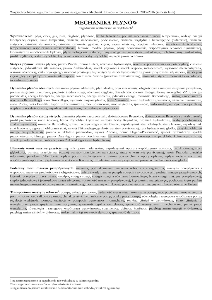 Wojciech Sobieski: zagadnienia teoretyczne na egzamin z Mechaniki Płynów – rok akademicki 2015-2016 (semestr letni) MECHANIKA PŁYNÓW zagadnienia realizowane na wykładach1 Wprowadzenie: płyn, ciecz, gaz, para, ciągłość, płynność, liczba Knudsena, podział mechaniki płynów, temperatura, rodzaje energii kinetycznej cząstek, skale temperatur, ciśnienie, nadciśnienie, podciśnienie, ciśnienie względne i bezwzględne (całkowite), ciśnienie statyczne, ciśnienie dynamiczne, ciśnienie całkowite, gęstość, ciężar, ciężar właściwy, objętość właściwa, współczynnik ściśliwości, temperaturowy współczynnik rozszerzalności, lepkość, modele płynów, płyny newtonowskie, współczynnik lepkości dynamicznej, kinematyczny współczynnik lepkości, płyny reologicznie stabilne, płyny reologicznie niestabilne, turbulencja, ruch laminarny i turbulentny, profil prędkości, liczba Reynoldsa, krytyczne wartości liczby Reynoldsa, napięcie powierzchniowe. Statyka płynów: statyka płynów, prawo Pascala, prawo Eulera, równanie hydrostatyki, równanie powierzchni ekwipotencjalnej, ciśnienie statyczne, jednostkowa siła masowa, prawo Archimedesa, środek ciężkości i środek wyporu, metacentrum, wysokość metacentryczna, warunki równowagi ciała pływającego, moment prostujący, kąt krytyczny, napór hydrostatyczny, punkt przyłożenia siły naporu, napór jako ciężar „bryły ciepkłej”, całkowita siła naporu, twierdzenie Stevina (paradoks hydrostatyczny), moment statyczny, moment bezwładności, twierdzenie Stainera. Dynamika płynów idealnych: dynamika płynów idelanych, płyn idealny, płyn rzeczywisty, objętościowe i masowe natężenie przepływu, pomiar natężenia przepływu, prędkość średnia strugi, równanie ciągłości, Zasada Zachowania Energii, formy szczególne ZZE, energia potencjalna, energia kinetyczna, energia mechaniczna, energia ciśnienia, jednostka energii, równanie Bernoulliego, analogia mechaniczna równania Bernoulliego, wzór Torricellego, wysokość rozporządzalna, butla Mariotte'a, lewar hydrauliczny, kawitacja, ciśnienie dynamiczne, rurka Pitota, rurka Prandtla, napór hydrodynamiczny, moc dostarczona, moc użyteczna, sprawność, koło wodne, wypływ przez przelewy, wypływ przez duże otwory, współczynnik wypływu, nieustalony wypływ cieczy. Dynamika płynów rzeczywistych: dynamika płynów rzeczywistych, doświadczenie Reynoldsa, doświadczenie Reynoldsa a skala zjawisk, profil prędkości w rurze kołowej, liczba Reynoldsa, krytyczne wartości liczby Reynoldsa, promień hydrauliczny, liczby podobieństwa, analiza wymiarowa, równanie Bernoulliego płynu rzeczywistego, straty lokalne, współczynnik strat lokalnych, straty liniowe, współczynnik strat liniowych, algorytm obliczania strat, wykres Nikuradsego, grubość warstwy przyściennej, rura hydraulicznie gładka, przykład obliczeń uwzględniających straty, pompa w układzie przewodów, wykres Ancony, prawo Hagena-Poiseuille'a 2, spadek hydrauliczny, spadek piezometryczny, filtracja, prawo Darcy'ego i prawo Forchheimera, badania ośrodków porowatych – przykłady, kolmatacja, sufozja, adwekcja, uderzenie hydrauliczne, wzór Żukowskiego, taran hydrauliczny. Elementy teorii warstwy przyściennej: siła oporu i siła nośna, współczynnik oporu i współczynnik nośności, profil lotniczy, stery głębokości, warstwa przyścienna, rozwój warstwy przyściennej na ściance, straty w warstwie przyściennej, teoria Prandtla, zjawisko oderwania, paradoks d'Alemberta, opływ pod- i nadkrytyczny, struktura powierzchni a opory opływu, wpływ rodzaju ruchu na współczynnik oporu, wiry spływowe, ścieżka von Karmana, turbulentna warstwa przyścienna, powierzchnia hydraulicznie gładka. Podstawy teorii maszyn przepływowych: maszyna, podział maszyn, maszyna robocza i energetyczna, maszyna przepływowa i wyporowa, maszyna prędkościowa i objętościowa, zalety i wady maszyn przepływowych i wyporowych, podział maszyn przepływowych, kierunki przepływu przez wirnik, entalpia, energia strugi, energia strugi a równanie Bernoulliego, bilans energii maszyny przepływowej, ciepło jednostkowe i jednostkowa praca użyteczna, sprawność maszyny przepływowej, kręt punktu materialnego, pochodna krętu punktu materialnego, moment obrotowy maszyny wirnikowej, moc maszyny wirnikowej, praca użyteczna maszyny wirnikowej, równanie Eulera. Transportowe maszyny robocze3: pompy, układy pompowe, wydajność rzeczywista i nominalna pompy, moc pobierana i moc użyteczna pompy, sprawność całkowita pompy, charakterystyki hydrauliczne pomp, punkt pracy pompy, równoległa i szeregowa współpraca pomp, regulacja wydajności pompy, kawitacja w pompach, wentylatory i dmuchawy, rozkład ciśnień w wentylatorze, straty ciśnienia w wentylatorze, praca sprężania, moc sprężania, sprawność ogólna wentylatora, sprawność wewnętrzna i mechaniczna, punkt pracy wentylatora, równoległa i szeregowa współpraca wentylatorów, strumienice, dyfuzor, konfuzor, przebieg zmian energii w dyfuzorze, przebieg zmian ciśnień w dyfuzorze, maksymalny kąt rozwarcia dyfuzora, sprawność dyfuzora. 1 na szaro zaznaczone są zagadnienia nie wchodzące w zakres egzaminu 2 bez wyprowadzania wzorów – tylko założenia i wnioski 3 zagadnienia częściowo zrealizowane na laboratorium (nie wchodzą w zakres egzaminu)