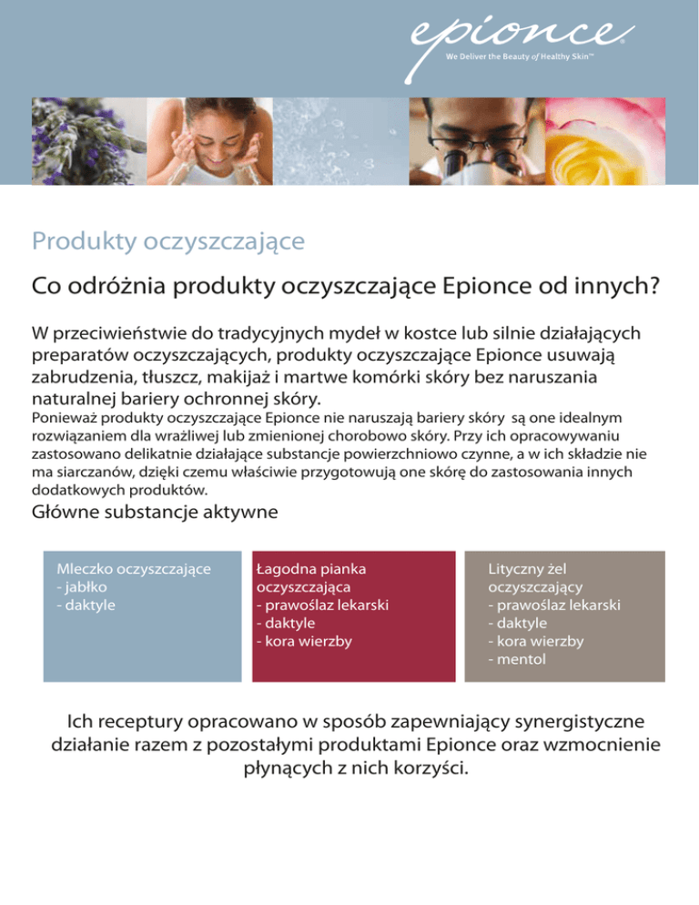 Produkty oczyszczające Co odróżnia produkty oczyszczające Epionce od innych? W przeciwieństwie do tradycyjnych mydeł w kostce lub silnie działających preparatów oczyszczających, produkty oczyszczające Epionce usuwają zabrudzenia, tłuszcz, makijaż i martwe komórki skóry bez naruszania naturalnej bariery ochronnej skóry. Ponieważ produkty oczyszczające Epionce nie naruszają bariery skóry są one idealnym rozwiązaniem dla wrażliwej lub zmienionej chorobowo skóry. Przy ich opracowywaniu zastosowano delikatnie działające substancje powierzchniowo czynne, a w ich składzie nie ma siarczanów, dzięki czemu właściwie przygotowują one skórę do zastosowania innych dodatkowych produktów. Główne substancje aktywne Mleczko oczyszczające - jabłko - daktyle Łagodna pianka oczyszczająca - prawoślaz lekarski - daktyle - kora wierzby Lityczny żel oczyszczający - prawoślaz lekarski - daktyle - kora wierzby - mentol Ich receptury opracowano w sposób zapewniający synergistyczne działanie razem z pozostałymi produktami Epionce oraz wzmocnienie płynących z nich korzyści. Który preparat polecić? Mleczko oczyszczające Preparat można nanosić na suchą lub zwilżoną skórę, a następnie usuwać za pomocą chusteczki lub zmywać wodą, co sprawia, że jest idealny do oczysz czania po zabiegu. Sprawia, że skóra jest aksamitna i nawilżona. Doskonały do suchej lub bardzo wrażliwej skóry. Idealny do usuwania makijażu oczu. Łagodna pianka oczyszczająca Doskonały środek oczyszczający do codziennego użytku dla osób o skórze dowolnego typu preferujących piankę oczyszczającą. Spieniony preparat łatwo się zmywa, dzięki czemu na powierzchni skóry nie zostają żadne jego pozostałości. Lityczny żel oczyszczający Dogłębnie oczyszcza pory dzięki składnikom o silnym działaniu antybakteryjnym Działa przeciwpodrażnieniowo, jednocześnie zmniejszając zaczerwienienia związane z wieloma powszechnymi schorzeniami skóry, na przykład: wągrami i prosakami, cystami, łuszczącymi się plamami i trądzikiem. Usuwa nagromadzone martwe komórki skóry odpowiedzialne za łuszczenie się w przypadku niektórych częstych schorzeń skóry, na przykład łuszczycy i zapalenia skóry. Zapewnia działanie chłodzące, przynosi ulgę w objawach trądziku zapalnego. Jest idealny do stosowania po zabiegach w celu ograniczenia pojawiania się pryszczy po zabiegu. Porady specjalisty Epionce Klient: Mam suchą skórę, ale bardzo lubię stosować pianki do mycia twarzy. Specjalista Epionce: Idealnym środkiem dla Pani będzie Łagodna pianka oczyszczająca! Chociaż oznaczono ją dwiema kropkami jako produkt przeznaczony do skóry normalnej i mieszanej, nadaje się ona bardzo dobrze dla wszystkich typów skóry, od bardzo suchej aż do bardzo wrażliwej i skłonnej do trądziku, dla osób preferujących pianki oczyszczające. Jest najlepsza dla skóry suchej, ulegającej wpływom hormonów, na której co miesiąc pojawiają się wypryski. Klient: Mam bardzo suchą wrażliwą skórę. Czy muszę myć twarz dwa razy dziennie czy wystarczy, że oczyszczę ją raz dziennie? Specjalista Epionce: Jeżeli usuwa Pani makijaż przed pójściem spać, wystarczy oczyszczać skórę raz dziennie wieczorem, a jedynie przemyć skórę wodą ranem. Nawet, jeżeli nie stosuje Pani makijażu, dobrze jest wieczorem „zmyć dzień” (zanieczyszczenia, kurz, brud, itd.) za pomocą mleczka oczyszczającego przed pójściem spać. Klient: Czy mogę usuwać makijaż oczu jednocześnie myjąc twarz za pomocą jednego z produktów oczyszczających? Specjalista Epionce: Chociaż zaleca się stosowanie mleczka oczyszczającego do delikatnego oddzielnego usuwania makijażu oczu, można również używać płynów oczyszczających Epionce w jednoczesnym usuwaniu makijażu oczu i twarzy. Należy jedynie unikać dostania się płynu oczyszczającego bezpośrednio do obszaru gałki ocznej! Przy mocniejszym makijażu w ciągu dnia, najpierw należy oczyścić twarz, aby usunąć makijaż, a następnie czynność powtórzyć, aby zapewnić głębsze oczyszczanie skóry. Klient: Mam wypryski na klatce piersiowej i plecach. Czy mogę stosować produkt oczyszczający Epionce do innych części ciała? Specjalista Epionce: Oczywiście! Lityczny żel oczyszczający stanowi doskonały płyn do mycia tych części ciała z tendencją do występowania wyprysków lub nadmiernie łuszczących się. Klient: Lubię uczucie, jakie dają produkty aktywnie oczyszczające lub glikolowe na mojej tłustej skórze. Specjalista Epionce: Lityczny żel oczyszczający stanowi doskonałą alternatywę dla silniejszych środków, które mogą w rzeczywistości uruchamiać procesy zapalne w skórze. Lityczny żel oczyszczający zawiera korę wierzby i pirytionian cynku do zabijania bakterii, jednocześnie łagodząc stan zapalny skóry. Jeżeli przyzwyczaiła się Pani, że „czuje” Pani swój płyn oczyszczający, polubi Pani uczucie czystości, jakie daje Lityczny żel oczyszczający. Zapewnia on głębokie oczyszczanie bez usuwania naturalnych lipidów skóry.