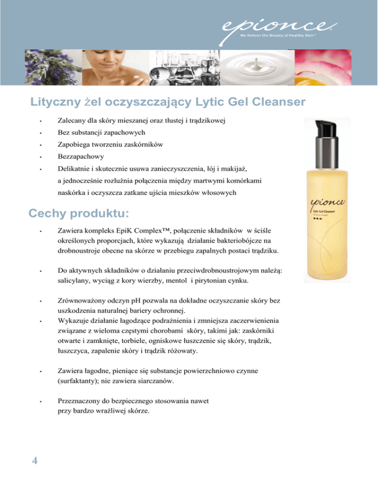Lityczny żel oczyszczający Lytic Gel Cleanser • Zalecany dla skóry mieszanej oraz tłustej i trądzikowej • Bez substancji zapachowych • Zapobiega tworzeniu zaskórników • Bezzapachowy • Delikatnie i skutecznie usuwa zanieczyszczenia, łój i makijaż, a jednocześnie rozluźnia połączenia między martwymi komórkami naskórka i oczyszcza zatkane ujścia mieszków włosowych Cechy produktu: • Zawiera kompleks EpiK Complex™, połączenie składników w ściśle określonych proporcjach, które wykazują działanie bakteriobójcze na drobnoustroje obecne na skórze w przebiegu zapalnych postaci trądziku. • Do aktywnych składników o działaniu przeciwdrobnoustrojowym należą: salicylany, wyciąg z kory wierzby, mentol i pirytonian cynku. • Zrównoważony odczyn pH pozwala na dokładne oczyszczanie skóry bez uszkodzenia naturalnej bariery ochronnej. Wykazuje działanie łagodzące podrażnienia i zmniejsza zaczerwienienia związane z wieloma częstymi chorobami skóry, takimi jak: zaskórniki otwarte i zamknięte, torbiele, ogniskowe łuszczenie się skóry, trądzik, łuszczyca, zapalenie skóry i trądzik różowaty. • 4 • Zawiera łagodne, pieniące się substancje powierzchniowo czynne (surfaktanty); nie zawiera siarczanów. • Przeznaczony do bezpiecznego stosowania nawet przy bardzo wrażliwej skórze. Korzyści ze stosowania Litycznego żelu oczyszczającego Lytic Gel Cleanser • W przeciwieństwie do tradycyjnych mydeł w kostkach lub drażniących preparatów myjących pozwala na usunięcie zanieczyszczeń, łoju, makijażu oraz martwych komórek naskórka bez uszkodzenia naturalnej bariery ochronnej skóry. • Zapewnia efekt ochłodzenia skóry, co zmniejsza dolegliwości związane z zapalną postacią trądziku. • Odpowiednio przygotowuje skórę, aby uzyskać maksymalną korzyść z preparatów leczniczych pozostawianych na skórze bez zmywania. Otwiera zatkane ujścia mieszków włosowych i usuwa nagromadzenia martwych komórek naskórka, odpowiedzialne za efekt łuszczenia się przy niektórych częstych chorobach skóry, jak łuszczyca i zapalenie skóry. • Jest znakomitym preparatem do mycia ciała przy trądziku zlokalizowanym na plecach i klatce piersiowej. • Idealny do stosowania przy nawet najbardziej wrażliwej skórze. www.epionce.pl 5 Porady Specjalisty Epionce Klientka: Moja babcia używała mydła w kostce do mycia twarzy przez 50 lat i nie miała żadnych problemów ze skórą. Co takiego szczególnego jest w tym żelu do mycia? Specjalista Epionce: Mydła w kostce, niezależnie od ich oznaczenia jako „dla skóry wrażliwej” lub „nawilżające”, to najczęściej preparaty silnie zasadowe, które mogą zaburzyć delikatną równowagę kwaśnego płaszcza lipidowego skóry – powodując, że staje się ona bardzo napięta. Wszystkie produkty oczyszczające Epionce mają odpowiedni dla skóry, zrównoważony odczyn pH. Skóra po ich użyciu jest czysta i odświeżona, bez żadnych podrażnień. Klientka: : Mam zaczerwienione, łuszczące się plamy na skórze wzdłuż linii włosów, których nie mogę się pozbyć – czy można coś na to poradzić? Specjalista Epionce: Wygląda to na łojotokowe zapalenie skóry, które pojawia się przy tłustej skórze w połączeniu z przewlekłym stanem zapalnym. Zmiany zwykle lokalizują się na skórze owłosionej głowy i na twarzy. Proszę oczyszczać zmienioną okolicę przy pomocy Litycznego żelu oczyszczającego, a następnie stosować preparat Epionce z serii Lytic. Takie postępowanie pozwoli usunąć zmiany skórne. Klientka: Mam 20 lat i na brodzie pojawił mi się trądzik – jak się go pozbyć? Specjalista Epionce: Lityczny żel oczyszczający jest doskonałym preparatem pozwalającym na głębokie oczyszczenie porów, co pomoże pozbyć się niedoskonałości skóry bez nadmiernego uszkodzenia naturalnej bariery ochronnej. Pomaga on także zmniejszyć zaczerwienienia związane z zapalnymi zmianami skórnymi. Proszę stosować Lityczny żel oczyszczający w połączeniu z Tonikiem oczyszczającym Purifyig Toner oraz/lub z preparatem Epionce z serii Lytic, aby uzyskać dodatkową korzyść z oczyszczenia porów. Klientka: Na klatce piersiowej i na plecach pojawiają mi się zmiany trądzikowe, czy jest jakiś produkt Epionce, który pomoże mi je usunąć? Specjalista Epionce: Lityczny żel oczyszczający to znakomity żel do mycia wszystkich okolic ciała, na których może pojawić się trądzik. Klientka: Lubię uczucie, jakie pozostawiają na mojej tłustej skórze aktywne preparaty myjące lub preparaty zawierające kwas glikolowy. Specjalista Epionce: Lityczny żel oczyszczający stanowi doskonałą alternatywą dla silniej działających preparatów, które mogą nawet wywołać procesy zapalne w skórze. Jeśli ktoś jest przyzwyczajony do „odczuwania” swojego preparatu oczyszczającego, to z całą pewnością polubi uczucie chłodu i świeżości podczas stosowania Litycznego żelu oczyszczającego. 6