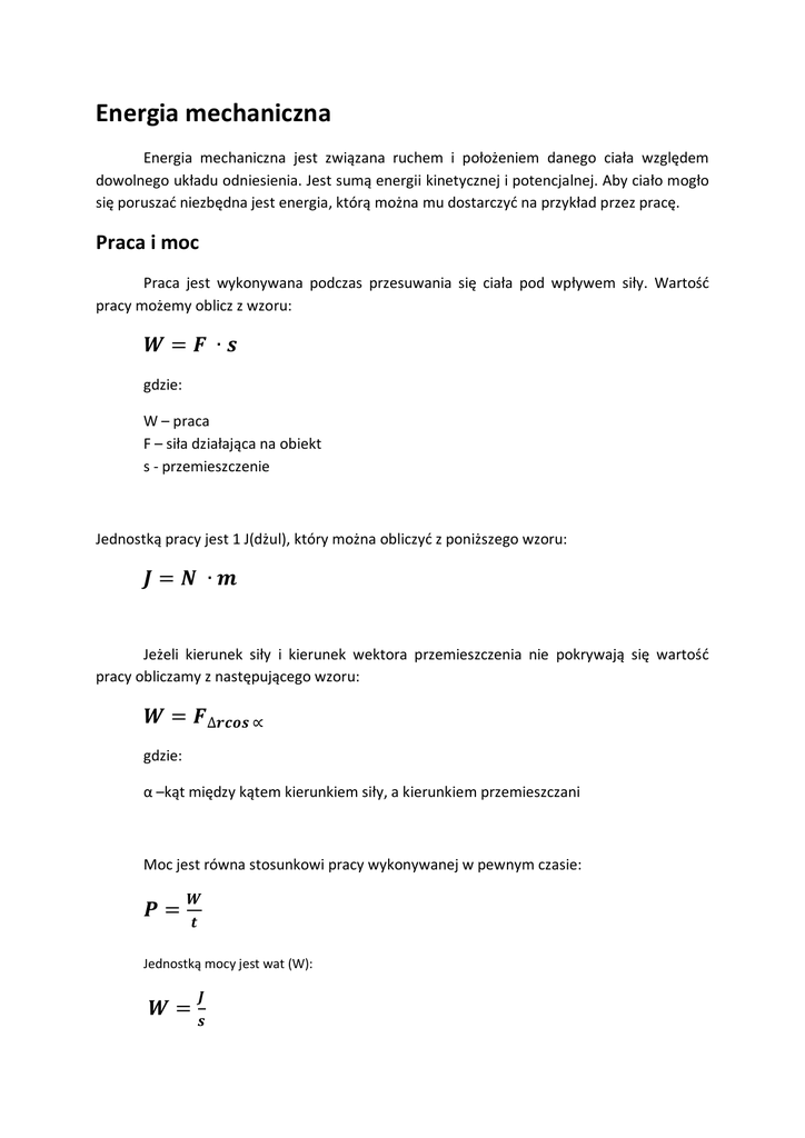 Energia mechaniczna Energia mechaniczna jest związana ruchem i położeniem danego ciała względem dowolnego układu odniesienia. Jest sumą energii kinetycznej i potencjalnej. Aby ciało mogło się poruszać niezbędna jest energia, którą można mu dostarczyć na przykład przez pracę. Praca i moc Praca jest wykonywana podczas przesuwania się ciała pod wpływem siły. Wartość pracy możemy oblicz z wzoru: = ∙ gdzie: W – praca F – siła działająca na obiekt s - przemieszczenie Jednostką pracy jest 1 J(dżul), który można obliczyć z poniższego wzoru: = ∙ Jeżeli kierunek siły i kierunek wektora przemieszczenia nie pokrywają się wartość pracy obliczamy z następującego wzoru: = ∆ ∝ gdzie: α –kąt między kątem kierunkiem siły, a kierunkiem przemieszczani Moc jest równa stosunkowi pracy wykonywanej w pewnym czasie: = Jednostką mocy jest wat (W): = Urządzenie o większej mocy jest w stanie wykonać tą samą pracę w krótszym czasie. Oznacza to, że samochód o większej mocy silnika potrafi się szybciej rozpędzić lub wjechać na wzniesienie niż samochód z mający silnikiem o mniejszej mocy. Urządzenia techniczne wykorzystują tylko część dostarczonej im energii. Sprawność urządzenia technicznego jest to stosunek mocy otrzymanej do mocy dostarczonej do urządzenia: = Energia kinetyczna Energia nie może powstać „niczego” i nie może zniknąć. Spełnia ona zasadę zachowania. Energię kinetyczną posiadają ciał będące w ruchu. Wartość energii kinetycznej jest proporcja masy ciała i kwadratu prędkości tego ciała: = Wartość energii kinetycznej jest zależna od układu odniesienia, na który opisujemy ruch danego ciała. Jeżeli chcemy żeby ciało posiadało energię kinetyczną należy je rozpędzić czyli wykonać pracę. W wyniku wzrostu prędkości ciała rośnie także energia kinetyczna tego ciała. Zmiana energii kinetycznej jest równa pracy wykonywanej nad ciałem przez siłę zewnętrzną. Energia potencjalna Wartość energii potencjalnej jest zależna od miejsca położenia ciała względem przyjętego układu odniesienia, czyli jest wartością względną. Energia potencjalna w polu grawitacyjnym Ziemi jest zależna od masy ciała oraz wysokości (ponad poziom, który uznamy za zerowy), na której ciało zostało umieszczone. Podczas podnoszenia ciała siła zewnętrzna wykonuje pracę podczas, której zmienia się energia potencjalna tego ciała. Zmiana energii potencjalnej jest równa wykonywanej pracy co przedstawia poniższy wzór: ∆ = Zmianę energii potencjalnej obliczamy następującym worem: ∆ = Zgodnie z definicją pracy: = = = = Energia potencjalna jest zgromadzona zarówno w sprężynie rozciągniętej jak i ściśniętej. Wartość energii potencjalnej sprężyny jest równa pracy siły energii siły zewnętrznej podczas rozciągania tej sprężyny co przedstawia następujący wzór: ∆ = Rozciągając sprężynę działamy na nią z siła ⃗ , której przeciwstawia się siła ⃗ , którą definiujemy następującym wzorem: =− gdzie: k – współczynnik sprężystości sprężyny[ ] = x – rozciągnięcie lub ściśnięcie sprężyny Wartość siły zewnętrznej ⃗ definiujemy następującym wzorem: = Z tego wzoru wynika że im większe jest rozciągnięcie sprężyny tym większa jest wartość siły. Średnią wartość siły rozciągającej sprężyny możemy obliczyć poniższym wzorem: Ś = czyli Ś = Wartość pracy siły zewnętrznej podczas rozciągania sprężyny można obliczyć następującym wzorem: = Do obliczenia zmiany energii potencjalnej sprężystości służy następujący wzór: ∆ = Zasada zachowania energii mechanicznej Zasadę zachowania energii mechanicznej mówi o tym że energia nie znika tylko zmienia formę można sformułować następującej: (Ek0 + Ep0) = (Ekk + Epk) czyli energia początkowa jest równa energii końcowej. Maksymalna szybkość przekazu informacji przyrodzie i jej konsekwencje. Jednym ze sposobów przemieszczania się energii jest fala mechaniczna wymaga ona ośrodka materialnego, a przekazywanie energii odbywa się od cząsteczki do cząsteczki. Drugim ze sposobów przekazywania energii jest fala magnetyczna, która nie wymaga ośrodka materialnego. Mechanizm rozchodzenia się fali mechanicznej Fala mechaniczna polega na rozchodzeniu się zaburzenia przez ośrodek. Jeżeli fala rozchodzi się w danym ośrodku to występują w nim ruch drgający cząsteczek i ruch zburzenia. Fala rozchodzi się przez przekazanie ruchu drgającego od cząsteczki do cząsteczki. W dali porzecznej cząsteczki ośrodka drgają w kierunku prostopadłym do kierunku rozchodzenia się fali. Natomiast w fali podłużnej cząsteczki drgają wzdłuż kierunku rozchodzenia się fali. Wielkości fizyczne opisujące są następujące: A – amplituda fali – maksymalne wychylenie z położenia równowagi T – okres fali – czas w jakim cząsteczka wykonuje jedno pełne drganie f – częstotliwość fali – ilość pełnych drgań jakich cząsteczka wykonuje w określonym czasie. Jednostką częstotliwości jest Hz (herc): = ; [ ]= = λ – długość fali – odległość, na jaką rozchodzą się zaburzania ośrodka w ciągu jednego okresu v – prędkość fali – prędkość jaką rozchodzi się zburzenie w danym ośrodku. Możemy ją obliczyć następującego wzoru: = = Fale o małych długościach to fale o dużych częstotliwościach, a fale o dużych długościach to wale o małych częstotliwościach co możemy wywnioskować po ostatnim wzorze. Stwierdzenie to jest prawdziwe ponieważ fale w tym samym ośrodku rozchodzą się z tą samą prędkością. Fala nośnikiem informacji Fala może przekazywać nie tylko energię, ale też informacje. Jednym z rodzajów fal, które przekazują informacje są fale dźwiękowe. Źródło dźwięku wprawia w drgania cząsteczki powietrza. Ruch ten jest przekazywany od cząsteczki do cząsteczki przez cały otaczając