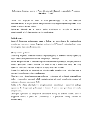 Informacje dotyczące pobytu w Polsce dla obywateli Japonii - uczestników Programu „Zwiedzaj i Pracuj” Osoba, która przybywa do Polski na okres przekraczający 14 dni, ma obowiązek zameldowania się w miejscu pobytu stałego lub czasowego najpóźniej czwartego dnia, licząc od dnia przybycia do tego miejsca. Zgłoszenia dokonuje się w organie gminy właściwym ze względu na położenie nieruchomości, w której dany cudzoziemiec zamieszkuje. Podjęcie pracy Uczestnik Programu, podejmujący pracę w Polsce, jest zobowiązany do przedstawienia pracodawcy wizy, uprawniającej do pobytu na terytorium RP i umożliwiającej podjęcie pracy bez ubiegania się o zezwolenie na pracę. Ubezpieczenia społeczne Uczestnicy Programu, którzy na obszarze RP podejmą pracę na podstawie umowy o pracę, są objęci obowiązkowym ubezpieczeniem emerytalnym i rentowym. Takimi ubezpieczeniami są także obowiązkowo objęte osoby wykonujące pracę na podstawie umowy agencyjnej, umowy zlecenia albo innej umowy o świadczenie usług, do której zgodnie z Kodeksem cywilnym stosuje się przepisy dotyczące zlecenia. Pracownicy podlegają też obowiązkowo ubezpieczeniu wypadkowemu i chorobowemu, a zleceniobiorcy ubezpieczeniu wypadkowemu. Obowiązkowym ubezpieczeniom emerytalnemu i rentowemu nie podlegają zleceniobiorcy będący równocześnie uczniami szkół ponadgimnazjalnych, szkół ponadpodstawowych lub studentami, do czasu ukończenia 26 lat. Każda osoba objęta obowiązkowo ubezpieczeniami emerytalnym i rentowym podlega zgłoszeniu do ubezpieczeń społecznych w terminie 7 dni od daty powstania obowiązku ubezpieczenia. Obowiązek zgłoszenia do ubezpieczeń społecznych należy do płatnika składek, czyli w przypadku umowy o pracę do zleceniodawcy. pracodawcy, a w przypadku umowy zlecenia do Ubezpieczenie zdrowotne Niezależnie od wykupienia przez uczestnika Programu komercyjnego ubezpieczenia zdrowotnego przed przybyciem na terytorium RP, w przypadku podjęcia pracy przez uczestnika Programu, jego pracodawca ma obowiązek objęcia nowoprzyjętego pracownika ubezpieczeniem zdrowotnym. W tym celu zgłasza go do Zakładu Ubezpieczeń Społecznych, a następnie co miesiąc odprowadza od dochodów pracownika składkę na ubezpieczenie zdrowotne do NFZ. Za osoby wykonujące pracę na umowę zlecenia lub inną umowę o świadczenie usług składkę odprowadza zleceniodawca. Obowiązek podatkowy W przypadku podjęcia pracy na podstawie umowy o pracę, pracodawca występuje o nadanie pracownikowi numeru NIP, a następnie odprowadza zaliczki na podatek dochodowy pracownika, wydając mu stosowne dokumenty, tj. PIT 11 i roczny PIT 37. W przypadku innej umowy niż umowa o pracę, pracodawca odprowadza zryczałtowany podatek od przychodu pracownika. Jeżeli obywatel Japonii przebywa w Polsce dłużej niż przez 183 dni w roku podatkowym, obowiązany jest on do rozliczenia podatku dochodowego w Polsce za ten rok, zgodnie z umową o unikaniu podwójnego opodatkowania między Polską a Japonią. W każdym województwie jest jeden urząd skarbowy, którego naczelnik posiada kompetencje w zakresie obsługi cudzoziemców, świadczących pracę na terytorium RP. Inne obowiązki wynikające z prawa RP i/lub Porozumienia Zgodnie z przepisami prawa RP oraz treścią Porozumienia, obywatel Japonii - uczestnik Programu powinien dysponować kwotą równowartości 2000 dolarów amerykańskich na początkowy okres pobytu. Koniecznym będzie wykazanie posiadania tej kwoty na swoim rachunku bankowym. W ramach procedury wizowej, uczestnik musi także przedstawić dowód dokonania rezerwacji powrotnego biletu lotniczego, bądź sumę odpowiadającą wartości biletu lotniczego, a także zadeklarować wolę nabycia ubezpieczenia zdrowotnego.