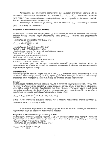 Przejdziemy do omówienia zachowania się wartości przyszłych kapitału Ko w modelach kapitalizacji niezgodnej tj. wartość Pk / m , K k / m , Wk / m opisanych wzorami (15),(16),(17) w zależności od okresu kapitalizacji czy od częstości dopisywania odsetek. Jest to zależne od modelu kapitalizacji. Zaczniemy od kapitalizacji prostej, czyli od zbadania Pk / m określonego wzorem (15). Zaczniemy od przykładu: Przykład 7 dla kapitalizacji prostej Wyznaczymy wartość przyszłą kapitału 1jp po 4 latach po różnych okresach kapitalizacji prostej według rocznej stopy procentowej 12% (r=0.12) . Wobec (15) przykładowo mamy: - kapitalizacja czteroletnia (m=0.25, k=1) P1 / 0.25 1(1 1 * 0.12 ) 1,48 0.25 - kapitalizacja dwuletnia (m=0,5, k=2) P2/0.5 = 1(1+2*0.12/0.5)=1,48 jp -kapitalizacja roczna (m=1, k=4) kapitalizacja zgodna P4/1 = 1*(1+4*0,12) = 1,48 -kapitalizacja półroczna (m=2, k=8) P8/2 = 1(1+8*0,12/2) = 1,48 - kapitalizacja kwartalna (m=4, k=4*4=16) P16/4 = 1(1+16*0,12/4) = 1,48 Widoczne jest, że w tym przypadku wartość przyszła kapitału Ko=1 jp ulokowanego na 4 lata nie zależy od częstości dopisywania odsetek (od długość okresu kapitalizacji). Ogólnie mamy Twierdzenie 1. Wartość przyszła kapitału Ko(Ko>0) po n (n=1,2,…) okresach stopy procentowej r (r>0) w modelu kapitalizacji prostej (z dołu) zgodnej jest taka sama jak w modelu kapitalizacji prostej (z dołu) niezgodnej, czyli nie zależy od długości okresu kapitalizacji. Dowód: Wyznaczając wartość przyszłą kapitału Ko, po n okresach stopy procentowej r (r>0) przy m-krotnym dopisywaniu odsetek w ciągu jednego okresu stopy procentowej stosujemy wzór (15). Liczba k okresów kapitalizacji jest tutaj równa k=n*m, przy czym k jest liczbą naturalną (zarówno dla kapitalizacji w podokresach jak i nadokresach), co wynika z przyjętego określenia kapitalizacji niezgodnej. Mamy więc: Pn m / m K 0 (1 n * m * r ) m K 0 (1 nr ) Pn / 1 Pn Gdzie Pn jest wartością przyszłą kapitału Ko w modelu kapitalizacji prostej zgodnej tj. dane wzorem 4. Co kończy dowód. W modelach kapitalizacji złożonej przyszła wartość kapitału zależy już od okresu kapitalizacji, czyli od częstości dopisywania odsetek. Przykład 8 dla kapitalizacji złożonej z dołu. Wyznaczymy wartość przyszłą kapitału 1 jp po czterech latach przy różnych okresach kapitalizacji w modelu kapitalizacji złożonej z dołu według rocznej stopy procentowej równej r=0.12. Przykładowo mamy: - kapitalizacja czteroletnia (m=0.25, k=1) K1 / 0.25 1(1 0.12 1 ) 0.25 1,48 jp 1 - kapitalizacja dwuletnia (m=0,5, k=2) K 2 / 0.5 0.12 2 ) 0.5 1(1 1,5376 jp -kapitalizacja roczna (m=1, k=4) kapitalizacja zgodna K 4 /1 1(1 0.12 4 ) 1 1,5735 jp -kapitalizacja półroczna (m=2, k=8) K8 / 2 1(1 0.12 8 ) 1,5938 jp 2 - kapitalizacja kwartalna (m=4, k=4*4=16) K16 / 4 1(1 0.12 16 ) 1,6047 jp 4 Czyli jest tendencja wzrostowa. Wartość przyszła kapitału 1jp jest tym większa im krótszy jest okres kapitalizacji. Ogólnie mamy: Twierdzenie 2. Dla każdej ustalonej liczby naturalnej n (liczba okresów stopy procentowej przez jaka Bedze kapitał spoczywał) wartość przyszła kapitału Ko (Ko>0) po n okresach stopy procentowej r (r>0) w modelu kapitalizacji złożonej z dołu jest rosnącą funkcją częstości kapitalizacji odsetek, czyli jest funkcją rosnącą względem m. Dowód: Ustalmy n naturalne. Wartość przyszła kapitału Ko (Ko>0) po n okresach stopy procentowej r (r>0) zgodnie z (16) tj. K k / m K 0 (1 r k ) w modelu kapitalizacji złożonej z m dołu niezgodnej jest równe (20) K n m / m K 0 (1 r n*m n * r n*m ) K 0 (1 ) m n*m Gdyż liczba okresów kapitalizacji jest równa k=n*m. Liczba k jest liczbą naturalną zarówno dla kapitalizacji w podokresach jak i dla kapitalizacji w nadokresach. Łatwo widać, że jeśli m rośnie, to k również rośnie (i na odwrót). Mamy wykazać, że funkcja, m-> K n m / m jest rosnąca (n*m należy do N). Wobec (20) wystarczy wykazać, że ciąg (ak) określony wzorem: ak (1 nr k ) k k N jest ciągiem rosnącym. Wykażemy najpierw nierówność Bernoulliego, tzn. (21) (1 x) p 1 px x 1, x 0,p 2,3,... Dla ustalonego p należącego do N, p>=2 rozważmy funkcję fi postaci: (1 x) p 1 px x ( 1, ) Funkcja fi jest różniczkowalna w naszym przedziale (-1, do nieskończoności) i mamy: ' p(1 x) p 1 p p((1 x) p 1 1 x ( 1, ) Zauważmy, że ta pochodna jest równa = 0 wtedy i tylko wtedy, gdy (1+x) p-1=1, czyli x=0. Ponadto p-1>=1 oraz 1+x>0 dla x>-1, więc 0<(1+x)p-1<1 gdy -1<x<0 wtedy x+1 należy do przedziału (0,1). Oraz 2 (1+x)p-1>1 gdy 0<x<nieskończoność. Zatem nasza pochodna jest mniejsza od zera dla x z przedziału (-1,0) a większa od zera dla (0,nieskończoność), wiec funkcja fi maleje w przedziale (-1,0) zaś rośnie w przedziale (0, nieskończoność). W punkcie x=0 funkcja fi osiąga minimum globalne (w zbiorze (-1, nieskończoność)). Wobec tego ( x) (0) 0x ( 1, ) oraz ( x) 0 x ( 1,0) (0, ) Co z dowolności wyboru p oznacza, że zachodzi nierówności (21). Nierówność (21) można także wykazywać stosując zasadę indukcji matematycznej względem p dla dowolnego ustalonego x należącego do sumy zbiorów (-1,0) i (0, nieskończoność). Zauważmy, że dla ak>0, k naturalne. Ponadto dla dowolnego ustalonego k naturalnego mamy: nr k 1 nr k 1 nr ) 1 nr nr k 1 (1 )( k 1 ) k 1 (1 )( k 1 ) k nr k nr k nr k k (1 ) 1 k k k 2 nr k k knr k 1 nr nr (1 )( 2 ) (1 )(1 )k 1 k k k (k 1)(k nr ) k knr nr ak 1 ak (1 1 (1 nr (k 1)( k stosując teraz nierówność bernoulliego (21) dla p=k+1 oraz x zauważyć, że ak 1 ak (1 nr (k 1)( k nr ) nr k 2 k knr k )( ) k (k 1)(k nr ) nr ) (łatwo ( 1,0) ) i otrzymujemy nr nr )(1 (k 1) k (k 1)( k nr ) ) k nr k k nr nr k nr 1 k N Wobec tego ak+1>ak dla k naturalnych, czyli ciąg (ak) jest rosnący. Wobec (20) mamy, że K nm / m K 0 a nm , więc K nm / m jest funkcją rosnącą względem m, co kończy dowód. Z powyższego twierdzenia otrzymujemy bezpośrednio wniosek