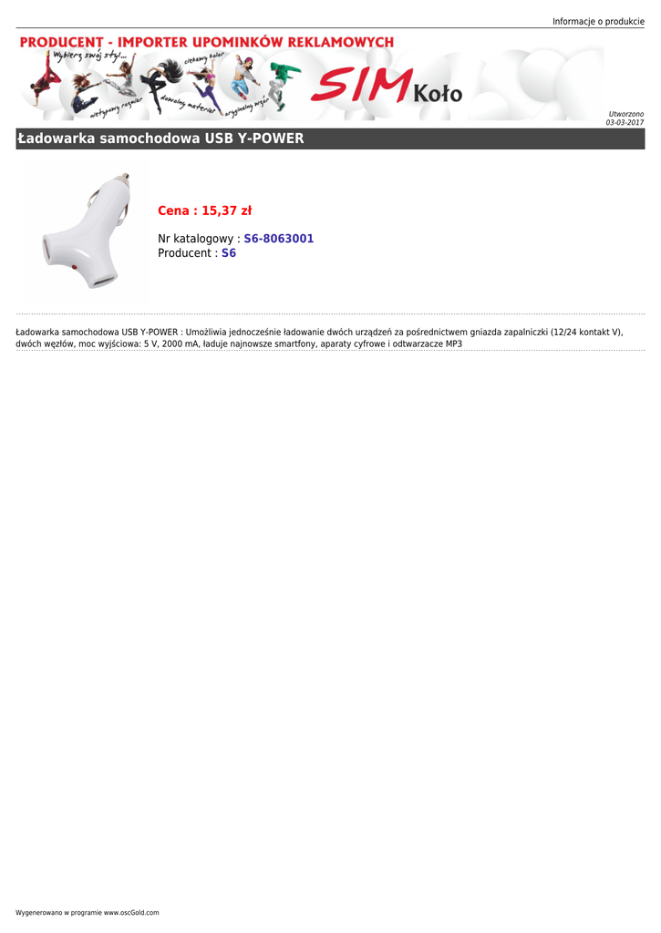 Informacje o produkcie Utworzono 03-03-2017 Ładowarka samochodowa USB Y-POWER Cena : 15,37 zł Nr katalogowy : S6-8063001 Producent : S6 Ładowarka samochodowa USB Y-POWER : Umożliwia jednocześnie ładowanie dwóch urządzeń za pośrednictwem gniazda zapalniczki (12/24 kontakt V), dwóch węzłów, moc wyjściowa: 5 V, 2000 mA, ładuje najnowsze smartfony, aparaty cyfrowe i odtwarzacze MP3 Wygenerowano w programie www.oscGold.com