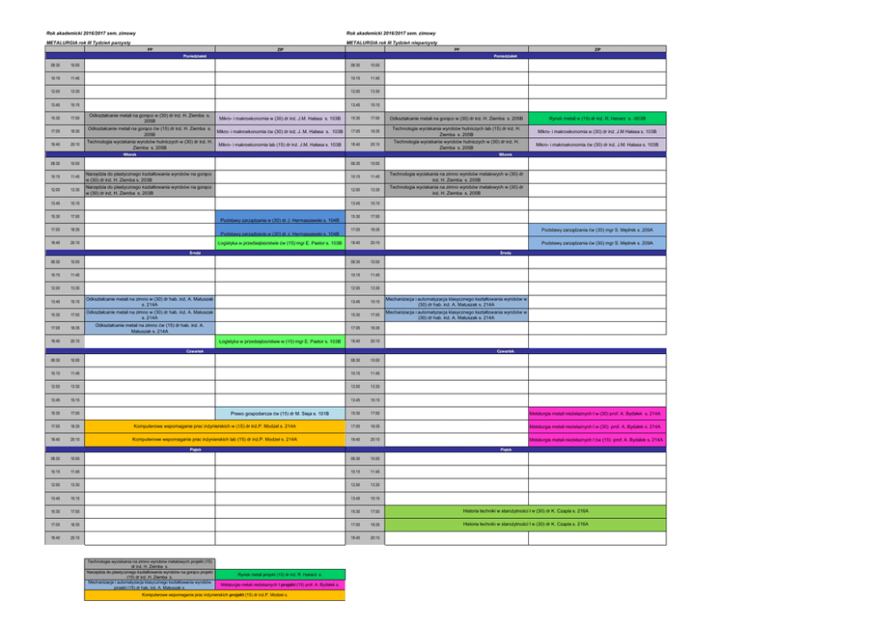 Rok akademicki 2016/2017 sem. zimowy Rok akademicki 2016/2017 sem. zimowy METALURGIA rok III Tydzień parzysty METALURGIA rok III Tydzień nieparzysty PP ZIP PP Poniedziałek ZIP Poniedziałek 08:30 10:00 08:30 10:00 10:15 11:45 10:15 11:45 12:00 13:30 12:00 13:30 13:45 15:15 13:45 15:15 15:30 17:00 Odkształcanie metali na gorąco w (30) dr inż. H. Ziemba s. 205B Mikro- i makroekonomia w (30) dr inż. J.M. Hałasa s. 103B 15:30 17:00 Odkształcanie metali na gorąco w (30) dr inż. H. Ziemba s. 205B Rynek metali w (15) dr inż. R. Hanarz s. -003B 17:05 18:35 Odkształcanie metali na gorąco ćw (15) dr inż. H. Ziemba s. 205B Mikro- i makroekonomia ćw (30) dr inż. J. M. Hałasa s. 103B 17:05 18:35 Technologia wyciskania wyrobów hutniczych lab (15) dr inż. H. Ziemba s. 205B Mikro- i makroekonomia w (30) dr inż. J.M Hałasa s. 103B 18:40 20:10 Technologia wyciskania wyrobów hutniczych w (30) dr inż. H. Ziemba s. 205B Mikro- i makroekonomia lab (15) dr inż. J.M. Hałasa s. 103B 18:40 20:10 Technologia wyciskania wyrobów hutniczych w (30) dr inż. H. Ziemba s. 205B Mikro- i makroekonomia ćw (30) dr inż. J.M. Hałasa s. 103B Wtorek Wtorek 08:30 10:00 08:30 10:00 10:15 11:45 Narzędzia do plastycznego kształtowania wyrobów na gorąco w (30) dr inż. H. Ziemba s. 203B 10:15 11:45 Technologia wyciskania na zimno wyrobów metalowych w (30) dr inż. H. Ziemba s. 205B 12:00 13:30 Narzędzia do plastycznego kształtowania wyrobów na gorąco w (30) dr inż. H. Ziemba s. 203B 12:00 13:30 Technologia wyciskania na zimno wyrobów metalowych w (30) dr inż. H. Ziemba s. 205B 13:45 15:15 13:45 15:15 15:30 17:00 15:30 17:00 17:05 18:35 17:05 18:35 18:40 20:10 18:40 20:10 Podstawy zarządzania w (30) dr J. Hermaszewski s. 104B Podstawy zarządzania w (30) dr J. Hermaszewski s. 104B Logistyka w przedsiębiorstwie ćw (15) mgr E. Pastor s. 103B Środa Podstawy zarządzania ćw (30) mgr S. Mędrek s. 209A Podstawy zarządzania ćw (30) mgr S. Mędrek s. 209A Środa 08:30 10:00 08:30 10:00 10:15 11:45 10:15 11:45 12:00 13:30 12:00 13:30 15:15 Odkształcanie metali na zimno w (30) dr hab. inż. A. Matuszak s. 214A 13:45 15:15 Mechanizacja i automatyzacja klasycznego kształtowania wyrobów w (30) dr hab. inż. A. Matuszak s. 214A 17:00 Odkształcanie metali na zimno w (30) dr hab. inż. A. Matuszak s. 214A 15:30 17:00 Mechanizacja i automatyzacja klasycznego kształtowania wyrobów w (30) dr hab. inż. A. Matuszak s. 214A 17:05 18:35 Odkształcanie metali na zimno ćw (15) dr hab. inż. A. Matuszak s. 214A 17:05 18:35 18:40 20:10 18:40 20:10 13:45 15:30 Logistyka w przedsiębiorstwie w (15) mgr E. Pastor s. 103B Czwartek Czwartek 08:30 10:00 08:30 10:00 10:15 11:45 10:15 11:45 12:00 13:30 12:00 13:30 13:45 15:15 13:45 15:15 15:30 17:00 15:30 17:00 Metalurgia metali nieżelaznych I w (30) prof. A. Bydałek s. 214A 17:05 18:35 Komputerowe wspomaganie prac inżynierskich w (15) dr inż.P. Modzel s. 214A 17:05 18:35 Metalurgia metali nieżelaznych I w (30) prof. A. Bydałek s. 214A 18:40 20:10 Komputerowe wspomaganie prac inżynierskich lab (15) dr inż.P. Modzel s. 214A 18:40 20:10 Prawo gospodarcze ćw (15) dr M. Sieja s. 101B Piątek Metalurgia metali nieżelaznych I ćw (15) prof. A. Bydałek s. 214A Piątek 08:30 10:00 08:30 10:00 10:15 11:45 10:15 11:45 12:00 13:30 12:00 13:30 13:45 15:15 13:45 15:15 15:30 17:00 15:30 17:00 Historia techniki w starożytności I w (30) dr K. Czapla s. 216A 17:05 18:35 17:05 18:35 Historia techniki w starożytności I w (30) dr K. Czapla s. 216A 18:40 20:10 18:40 20:10 Technologia wyciskania na zimno wyrobów metalowych projekt (15) dr inż. H. Ziemba s. Narzędzia do plastycznego kształtowania wyrobów na gorąco projekt (15) dr inż. H. Ziemba s. Mechanizacja i automatyzacja klasycznego kształtowania wyrobów projekt (15) dr hab. inż. A. Matuszak s. Rynek metali projekt (15) dr inż. R. Hanarz s. Metalurgia metali nieżelaznych I projekt (15) prof. A. Bydałek s. Komputerowe wspomaganie prac inżynierskich projekt (15) dr inż.P. Modzel s.