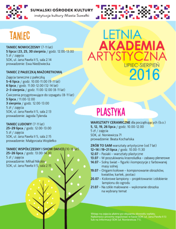 TANIEC NOWOCZESNY (7-11 lat) 5 lipca i 23, 25, 30 sierpnia / godz. 12.00-13.00 5 zł / zajęcia SOK, ul. Jana Pawła II 5, sala 2.14 prowadzenie: Ewa Niedźwiecka TANIEC Z PAŁECZKĄ MAŻORETKOWĄ Zajęcia taneczne z pałeczką 5-6 lipca / godz. 10.00-11.00 (9-11 lat) 6 lipca / godz. 11.00-12.00 (12-14 lat) 2-3 sierpnia / godz. 11.00-12.00 (8-11 lat) Ćwiczenia przygotowujące do szpagatu (8-11 lat) 5 lipca / 11.00-12.00 3 sierpnia / godz. 12.00-13.00 5 zł / zajęcia SOK, ul. Jana Pawła II 5, sala 2.13 prowadzenie: Jagoda Tylenda TANIEC LUDOWY (7-11 lat) 25-29 lipca / godz. 12.00-13.00 5 zł / zajęcia SOK, ul. Jana Pawła II 5, sala 2.15 prowadzenie: Małgorzata Wojdełko TANIEC WSPÓŁCZESNY I SHOW DANCE (10-16 lat) 25-26 lipca / godz. 13.00-14.30 5 zł / zajęcia prowadzenie: Mihail Nikolov SOK, ul. Jana Pawła II 5, sala 2.15 WARSZTATY CERAMICZNE dla początkujących (b.o.) 5, 12, 19, 26 lipca / godz. 10.00-12.00 5 zł / zajęcia SOK, ul. Noniewicza 71 prowadzenie: Beata Kochańska ZRÓB TO SAM warsztaty artystyczne (od 7 lat) 12-14 i 19-21 lipca / godz. 10.00-11.30 12.07 – Pasiaki – warsztaty plastyczne 13.07 – W poszukiwaniu krasnoludka – zabawy plenerowe 14.07 – Solny świat – figurki i kompozycje z farbowanej masy solnej 19.07 – Origami kołowe – komponowanie obrazków, kwiatów, kartek, postaci 20.07 – Kolorowe lampiony – projektowanie i zdobienie lampionu do ogrodu 21.07 – Na szkle malowane – wykonanie obrazka na wybrany temat Wstęp na zajęcia płatne po okazaniu dowodu wpłaty. Należności prosimy regulować w kasie SOK (ul. Jana Pawła II 5) lub na informacji SOK (ul. Noniewicza 71). 12-14 i 19-21 lipca / godz. 12.30-14.00 12.07 – Schowaj mnie – wykonanie pudełeczka na wakacyjne skarby 13.07 – Pejzaż znad Czarnej Hańczy – technika quillingu 14.07 – Zdobne przedmioty – technika decoupage’u 19.07 – Rolo-stworki – wykorzystanie materiałów z recyklingu 20.07 – U prof. Ciekawskiego – laboratorium w kuchni, czyli zróbmy sobie eksperyment 21.07 – Chusteczką malowane – technika decoupage’u 5 zł / zajęcia SOK, ul. Jana Pawła II 5, sala 0.28 lub plener prowadzenie: Lidia Żyniewicz i Halina Lutyńska WARSZTATY PLASTYCZNE w Pracowni Sztuk Pięknych (od 5 lat) 18-22, 25-29 lipca / godz. 10.00-13.00 1-5, 8-12 sierpnia / godz. 10.00-13.00 5 zł / zajęcia SOK, ul. Jana Pawła II 5, sala 0.30 prowadzenie: Mieczysław Iwaszko NAUKA STANDARDÓW JAZZOWYCH (od 16 lat) 15, 22, 29 lipca / godz. 15.00-16.30 wstęp wolny SOK, ul. Jana Pawła II 5, sala 1.22 prowadzenie: Wiesław Jarmoc LETNIE WARSZTATY GOSPEL 21-23 lipca / godz. 11.00-12.30 (10-16 lat) 21-22 lipca / godz. 16.00-22.00 (od 16 lat) 23 lipca / godz. 16.00-20.00 (od 16 lat) 10 zł / zajęcia SOK, ul. Jana Pawła II 5, sala 1.20 prowadzenie: A nna Szafranowska, Szymon Markiewicz (Kraków) WARSZTATY PLASTYCZNE w Pracowni Centrum Poznawanie, dotykanie, formowanie (5-9 lat) 8-9 sierpnia / godz. 14.00-15.30 Więcej niż portret (10-15 lat) 10-12 sierpnia / godz. 13.00-15.00 Mała Akademia Grafiki (5-9 lat) 24 sierpnia / godz. 14.00-15.30 Figury małe i duże (10-15 lat) 25 sierpnia / godz. 14.00-16.00 wstęp wolny SOK ul. Noniewicza 71 prowadzenie: Halina Mackiewicz ART-PLAST ZACZAROWANA WALIZKA – familijne spotkania ze sztuką 27 sierpnia / godz. 11.00-13.00 wstęp wolny plac Marii Konopnickiej prowadzenie: Halina Mackiewicz WSZYSTKO JEST TEATREM warsztaty teatralne dla młodzieży (od 15 lat) 1-4 sierpnia / godz. 12.00-14.00 wstęp wolny SOK, ul. Jana Pawła II 5, sala 2.23 prowadzenie: Mirosława Krymska WARSZTATY RECYTATORSKO-AKTORSKIE dla młodzieży i dorosłych (od 15 lat) 8-12 sierpnia / godz. 8.00-12.00 wstęp wolny SOK, ul. Noniewicza 71, Sala Granatowa prowadzenie: Joanna Łupinowicz Organizator zastrzega możliwość wprowadzenia zmian w programie. Aktualny plan zajęć dostępny jest na www.soksuwalki.eu