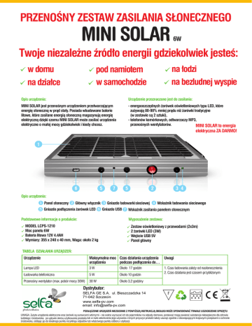 PRZENOŚNY ZESTAW ZASILANIA SŁONECZNEGO MINI SOLAR 6W Twoje niezależne źródło energii gdziekolwiek jesteś: w domu pod namiotem na działce na łodzi na bezludnej wyspie w samochodzie Opis urządzenia: Urządzenie przeznaczone jest do zasilania: MINI SOLAR jest przenośnym urządzeniem przetwarzającym energię słoneczną w prąd stały. Posiada wbudowane baterie litowe, które zasilane energią słoneczną magazynują energię elektryczną dzięki czemu MINI SOLAR może zasilać urządzenia elektryczne o małej mocy gdziekolwiek i kiedy chcesz. - energooszczędnych żarówek oświetleniowych typu LED, które zużywają 80-90% mniej prądu niż żarówki tradycyjne (w zestawie są 2 sztuki), - telefonów komórkowych, odtwarzaczy MP3, przenośnych wentylatorów. MINI SOLAR to energia elektryczna ZA DARMO! 1 6 5 7 5 2 3 4 Opis urządzenia: Panel słoneczny Główny włącznik Gniazdo ładowarki sieciowej ‚ Wskaźnik ładowania sieciowego ƒ Gniazdo podłączenia żarówek LED „ Gniazdo USB … Wskaźnik zasilania panelem słonecznym Podstawowe informacje o produkcie: Wyposażenie zestawu: MODEL LCPS-1210 Moc panelu 6W Bateria litowa 12V 4.4AH Wymiary: 355 x 240 x 40 mm, Waga: około 2 kg Zestaw oświetleniowy z przewodami (2x3m) 2 żarówki LED (3W) Wejście USB 5V Panel główny TABELA DZIAŁANIA URZĄDZEŃ: Urządzenie Maksymalna moc Czas działania urządzenia Uwagi urządzenia podczas podłączenia do… Lampa LED 3W Około 17 godzin Ładowarka telefoniczna 5W Około 10 godzin Przenośny wentylator (max. pobór mocy 30W) 30 W Około 3,2 godziny 1. Czas ładowania zależy od nasłonecznienia 2. Czas działania jest czasem przybliżonym Dystrybutor: SELFA GE S.A. ul. Bieszczadzka 14 71-042 Szczecin www.selfa-pv.com email: [email protected] PODŁĄCZENIE URZĄDZEŃ NIEZGODNIE Z POWYŻSZĄ INSTRUKCJĄ OBSŁUGI MOŻE SPOWODOWAĆ TRWAŁE USZKODZENIE SPRZĘTU UWAGA: Zużyte urządzenia elektryczne oraz żarówki są surowcami wtórnymi – nie wolno wyrzucać ich do pojemników na odpady domowe, ponieważ mogą zawierać substancje niebezpieczne dla zdrowia ludzkiego i środowiska. po upływie okresu użytkowania produktu lub w razie zakończenia jego używania z innych przyczyn produkt należy usunąć zgodnie z obowiązującymi krajowymi przepisami o ochronie środowiska, oddając go do lokalnego punktu recyklingu odpadów lub właściwego punktu odbioru i utylizacji.