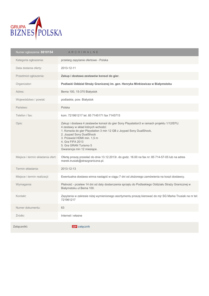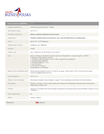 Numer ogłoszenia: 8810154 A RCHI WA L N E Kategoria ogłoszenia: przetarg zapytanie ofertowe - Polska Data dodania oferty: 2013-12-11 Przedmiot ogłoszenia: Zakup i dostawa zestawów konsol do gier. Organizator: Podlaski Oddział Straży Granicznej im. gen. Henryka Minkiewicza w Białymstoku Adres: Bema 100, 15-370 Białystok Województwo / powiat: podlaskie, pow. Białystok Państwo: Polska Telefon / fax: kom. 721961217 tel. 85 7145171 fax 7145715 Opis: Zakup i dostawa 4 zestawów konsol do gier Sony Playstation3 w ramach projektu 1/12/EFU. 4 zestawy w skład których wchodzi: 1. Konsola do gier Playstation 3 min 12 GB z Joypad Sony DualShock, 2. Joypad Sony DualShock 3. Przewód HDMI min. 1,5 m 4. Gra FIFA 2013 5. Gra GRAN Turismo 5 Gwarancja min 12 miesiące. Miejsce i termin składania ofert: Ofertę proszę przesłać do dnia 13.12.2013r. do godz. 16.00 na fax nr: 85 714-57-05 lub na adres [email protected]. Termin składania: 2013-12-13 Miejsce i termin realizacji: Ewentualna dostawa winna nastąpić w ciągu 7 dni od złożonego zamówienia na koszt dostawcy. Wymagania: Płatność - przelew 14 dni od daty dostarczenia sprzętu do Podlaskiego Oddziału Straży Granicznej w Białymstoku ul Bema 100. Kontakt: Zapytania w zakresie niżej wymienionego asortymentu proszę kierować do mjr SG Marka Trusiak na nr tel: 721961217 Numer dokumentu: 63 Źródło: Internet i własne Załączniki: ZIP załącznik