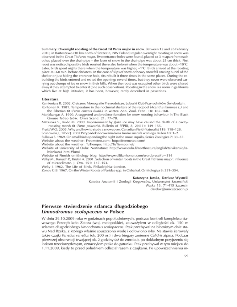 Summary: Overnight roosting of the Great Tit Parus major in snow. Between 12 and 26 February 2010, in Bartoszewo (10 km north of Szczecin, NW Poland) regular overnight roosting in snow was observed in the Great Tit Parus major. Two entrance holes were found, placed ca 3 m apart from each other, placed over the drainpipe – the layer of snow in the drainpipe was about 25 cm thick. First roost was noticed (possibly birds roosted there also before) when the temperature was about –10°C. Later, birds spent nights there when the temperature was higher, –1°C. Birds arrived at the roosting place 30–60 min. before darkness. In the case of slips of snow or heavy snowfall causing burial of the shelter or just hiding the entrance hole, tits rebuilt it three times in the same places. During the rebuilding the birds entered and exited the openings several times, but they never were observed carrying out clumps of ice or snow in their bills. When the roost was occupied other birds were chased away if they attempted to enter it (one such observation). Roosting in the snow is a norm in galliforms which live at high latitudes; it has been, however, rarely described in passerines. Literatura Kamieniarz R. 2002. Cietrzew. Monografie Przyrodnicze. Lubuski Klub Przyrodników, Świebodzin. Korhonen K. 1981. Temperature in the nocturnal shelters of the redpool (Acanthis flammea L.) and the Siberian tit (Parus cinctus Budd.) in winter. Ann. Zool. Fenn. 18: 165–168. Marjakangas A. 1990. A suggested antipredator function for snow roosting behaviour in The Black Grouse Tetrao tetrix. Ornis Scand. 21: 77–78. Matsuoka S., Kudo M. 2009. Imprisonment by glaze ice may have caused the death of a cavity-roosting marsh tit (Parus palustris). Bulletin of FFPRI, 8, 2(411): 149–155. Pruitt W.O. 2005. Why and how to study a snowcover. Canadian Field-Naturalist 119: 118–128. Sosnowski J., Tabor J. 2007 Przypadek nocowania kosa Turdus merula w śniegu. Kulon 10: 1–2. Sulkava S. 1969. On small birds spending the night in the snow. Aquilo, Series Zoologica 7: 33–37. Website about the weather: Freemeteo.com: http://freemeteo.com/ Website about the weather: TuTiempo: http://TuTiempo.net/ Website of University of Oulu: Nortnature: http://www.oulu.fi/northnature/english/talvikansio/talviankara1.html#lumi Website of Finnish ornithology blog: http://www.ollikorhonen.com/wordpress/?p=514 Velky M., Kanuch P., Kristin A. 2001. Selection of winter roosts in the Great Tit Parus major: influence of microclimate. J. Orn. 151: 147–153. Welty J. 1962. The Life of Birds. Philadelphia–London. Zonov G.B. 1967. On the Winter Roosts of Paridae spp. in Cisbaikal. Ornitologiya 8: 351–354. Katarzyna Jarska, Dariusz Wysocki Katedra Anatomii i Zoologii Kręgowców, Uniwersytet Szczeciński Wąska 13, 71-415 Szczecin [email protected] Pierwsze stwierdzenie szlamca długodziobego Limnodromus scolopaceus w Polsce W dniu 29.10.2009 roku w godzinach popołudniowych, podczas kontroli kompleksu stawowego Przeręb koło Zatora (woj. małopolskie), zauważyłem w odległości ok. 150 m szlamca długodziobego Limnodromus scolopaceus. Ptak przebywał na błotnistym dnie stawu Nad Rzeką, z którego właśnie spuszczono wodę i odłowiono ryby. Na stawie żerowały także czajki Vanellus vanellus (ok. 200 os.) i dwa biegusy zmienne Calidris alpina. Podczas pierwszej obserwacji trwającej ok. 2 godziny (aż do zmroku), po dokładnym przyjrzeniu się lotkom trzeciorzędowym, oznaczyłem ptaka do gatunku. Ptak przebywał w tym miejscu do 1.11.2009, kiedy to przed południem odleciał razem z czajkami. Po upowszechnieniu in59 formacji w internecie, w sumie ok. stu osób przyjechało w celu obejrzenia ptaka, obserwując go wyłącznie z grobli stawu. W tym czasie, pomimo niesprzyjających warunków obserwacji – mgły, drgań powietrza oraz znacznej odległości od ptaka (100–150 m), udało się wykonać pełną dokumentację (zdjęcia, film wideo, nagranie głosu) potwierdzającą oznaczenie obserwowanego ptaka jako szlamca długodziobego. ObserFot. 1. Szlamiec długodzioby Limnodromus scowacja uzyskała akceptację Komisji Faunislopaceus, stawy Przeręb, październik 2009 (fot. tycznej. J. Betleja) – Long-billed Dowitcher, Przeręb fishPtak był nieco mniejszy od czajki, sylponds, October 2009 wetką przypominał bekasa. Miał bardzo długi dziób, małą głowę i duży, pękaty korpus. Nogi były żółtawe. Upierzenie z wierzchu w ogólnym tonie szarawe, z jednolicie szarawą głową i piersią. Widoczna była wyraźna, jasna brew. Brzuch białawy. Lotki trzeciorzędowe z jednolicie ciemnym wnętrzem i ostro odgraniczonym, wąskim, płowym obrzeżeniem. Ogon prążkowany w gęste, wąskie, czarniawe paski. Kuper i dół pleców białe, dobrze widoczne w locie jako klinowata plama. W locie widoczne były także białawe zakończenia lotek drugorzędowych. Część pokryw i barkówek była jednolicie szarawa, a niektóre brązowawe, co wskazywało no to, że jest to ptak przepierzający się z szaty juwenalnej do immaturalnej. Podczas wszystkich obserwacji szlamiec najczęściej intensywnie żerował w mokrym błocie i kałużach na środku stawu. Okresowo odpoczywał nieruchomo przez kilkanaście minut, zakładając dziób na plecy. Kilkakrotnie zrywał się do lotu razem z czajkami, ale zwykle wracał w to samo miejsce. Głos wydawał jedynie w locie. Była to jedna sylaba „czik” wydawana w odstępach 1–2 sekund. Dokumentację stwierdzenia wykonałem z zastosowaniem techniki digiscopingu, aparatem Samsung NV 100 HD, przez lunetę Swarovski AT 80 HD z okularem o powiększeniu 30×. Nagranie głosu przelatującego ptaka dokonałem dyktafonem Olympus DW-360. Rejestracja video została udostępniona w internecie w serwisie YouTube jako kilka krótkich ujęć z podaniem dokładnej daty i miejsca obserwacji. Opisana obserwacja szlamca długodziobego jest pierwszym w Polsce udokumentowanym stwierdzeniem tego gatunku. W latach 1977–199