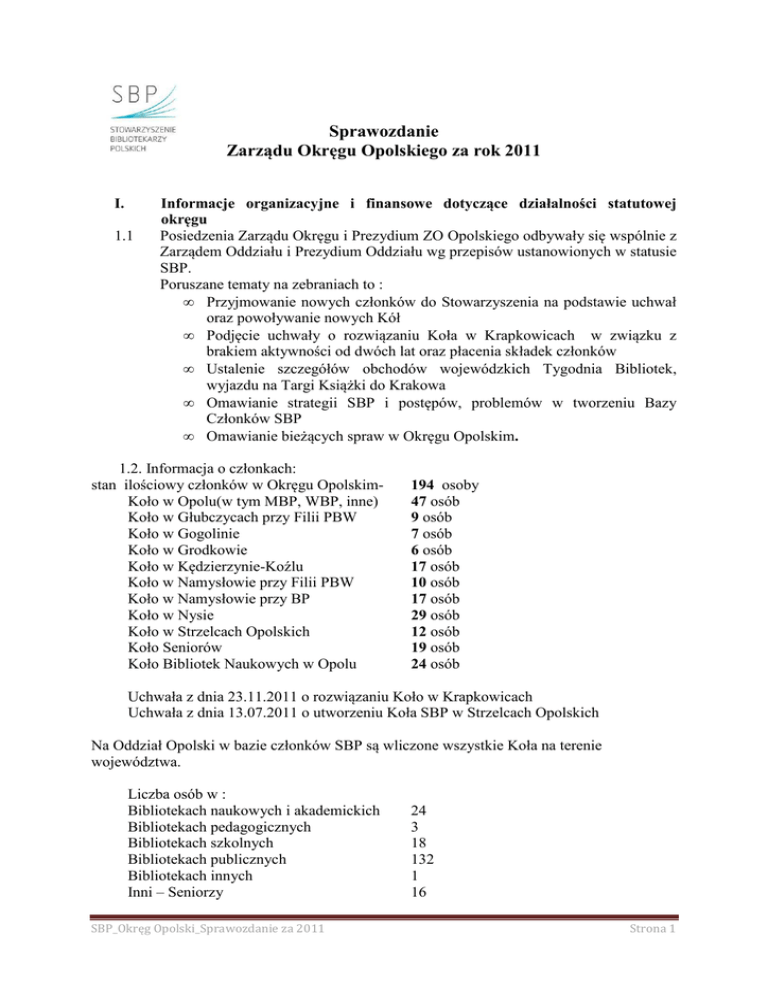 Sprawozdanie Zarządu Okręgu Opolskiego za rok 2011 I. 1.1 Informacje organizacyjne i finansowe dotyczące działalności statutowej okręgu Posiedzenia Zarządu Okręgu i Prezydium ZO Opolskiego odbywały się wspólnie z Zarządem Oddziału i Prezydium Oddziału wg przepisów ustanowionych w statusie SBP. Poruszane tematy na zebraniach to : • Przyjmowanie nowych członków do Stowarzyszenia na podstawie uchwał oraz powoływanie nowych Kół • Podjęcie uchwały o rozwiązaniu Koła w Krapkowicach w związku z brakiem aktywności od dwóch lat oraz płacenia składek członków • Ustalenie szczegółów obchodów wojewódzkich Tygodnia Bibliotek, wyjazdu na Targi Książki do Krakowa • Omawianie strategii SBP i postępów, problemów w tworzeniu Bazy Członków SBP • Omawianie bieżących spraw w Okręgu Opolskim. 1.2. Informacja o członkach: stan ilościowy członków w Okręgu OpolskimKoło w Opolu(w tym MBP, WBP, inne) Koło w Głubczycach przy Filii PBW Koło w Gogolinie Koło w Grodkowie Koło w Kędzierzynie-Koźlu Koło w Namysłowie przy Filii PBW Koło w Namysłowie przy BP Koło w Nysie Koło w Strzelcach Opolskich Koło Seniorów Koło Bibliotek Naukowych w Opolu 194 osoby 47 osób 9 osób 7 osób 6 osób 17 osób 10 osób 17 osób 29 osób 12 osób 19 osób 24 osób Uchwała z dnia 23.11.2011 o rozwiązaniu Koło w Krapkowicach Uchwała z dnia 13.07.2011 o utworzeniu Koła SBP w Strzelcach Opolskich Na Oddział Opolski w bazie członków SBP są wliczone wszystkie Koła na terenie województwa. Liczba osób w : Bibliotekach naukowych i akademickich Bibliotekach pedagogicznych Bibliotekach szkolnych Bibliotekach publicznych Bibliotekach innych Inni – Seniorzy SBP_Okręg Opolski_Sprawozdanie za 2011 24 3 18 132 1 16 Strona 1 Na rok 2010 członków było 225 obecnie w bazie członków widnieje 194 osoby – różnica 31 osób Na tę liczbę składa się: – rozwiązanie Koła w Krapkowicach (17) - pozostałe 13 osób to wynik aktualizacji listy członków w Kołach z chwilą podania do elektronicznej bazy członków, przejścia na emerytury pracowników bibliotek, niektóre z nich złożyły wnioski o rezygnację członkowstwa. Przy tworzeniu bazy członków pojawił się problem z danymi osobowymi, większość z osób nie widziała potrzemy umieszczania tak szczegółowych informacji w części (wykształcenie, zainteresowania, kariera) Brak roku urodzenia w podawanych danych uniemożliwia podanie liczby członków do 35 roku życia 1.3. Informacja o finansach okręgu wg wytycznych skarbnika i głównej księgowej Biura ZG SBP. – załączone dokumenty. II. Działalność merytoryczna Zarządu Okręgu wg pięciu celów strategicznych zawartych w „Strategii SBP na lata 2010-2021”. 1. Uzyskanie przez SBP realnego wpływu na kształtowanie polityki i praktyki bibliotecznej • Zarząd Okręgu Opolskiego w roku 2011 zorganizował dla przedstawicieli Kół spotkanie z Przewodniczącą Zarządu Głównego SBP – Elżbietą Stefańczyk spotkanie w kwietniu, przy okazji otwarcia nowej siedziby Miejskiej Biblioteki Publicznej w Opolu. • Zarząd Okręgu przygotował również w roku 2011, w grudniu dla przedstawicieli Kół szkolenie „Komunikacja wewnętrzna” przeprowadzone przez Agatę Szczotkę-Sarnę. Szkolenie umożliwiło usystematyzowanie nurtujących problemów identyfikacji z Stowarzyszeniem i próby rozwiązania tego zagadnienia. 2. SBP ważnym partnerem w tworzeniu społeczeństwa wiedzy - Zarząd Okręgu współpracował z opolskimi biblioteki przygotowując Opolskie obchody Tygodnia Bibliotek. 3. • Zwiększanie roli SBP w działaniach na rzecz integracji środowiska Zarząd Okręgu jak co roku przygotował wyjazd na Targi Książki do Krakowie, gdzie oprócz zrzeszonych bibliotekarzy w SBP w targach uczestniczyli młodzi pracownicy bibliotek Opolszczyzny. Przedstawiciele Zarządu Okręgu włączyli się (uczestnicząc) w przedsięwzięciach organizowanych przez Koła SBP, m.in. wyjazd integracyjny do Brzegu organizowany przez Koło Bibliotek Naukowych. Uczestnictwo przedstawicieli Zarządu na jubileuszach opolskich bibliotek (Biblioteka Główna, Uniwersytetu Opolskiego, Wojewódzka Biblioteka Publiczna. • • SBP_Okręg Opolski_Sprawozdanie za 2011 Strona 2 4. Zwiększenie dostępu do różnych nowoczesnych form kształcenia i doskonalenia zawodowego Przedstawiciele Zarządu Okręgu mieli możliwość uczestniczyć w VII Forum SBP w Kietrzu k. Poznania (2-3 września 2011), w którym uczestniczył sekretarz Zarządu Opolskiego – Katarzyna Pawluk, Przewodnicząca Komisji Rewizyjnej ZO – Mariola Urbaniak. Przewodnicząca ZO – Elżbieta Kampa brała udział w warsztatach „Komunikacja wewnętrzna w organizacji”, w warsztatach pod koniec roku „Cała naprzód”, brał udział sekretarz ZO – Katarzyna Pawluk. Sekretarz uczestniczył również w warsztatach dla administratorów bazy członków. Katarzyna Pawluk uczestniczyła również w Forum Sekcji Bibliotek Szkół Wyższych przy ZO w Katowicach, „Gdzie jesteś czytelniku? Rola biblioteki w strategii i działalności uczelni wyższej”, we wrześniu w Gliwicach, gdzie omawiano potrzeby i satysfakcję użytkownika bibliotek oraz jak może sprostać nowym technologiom bibliotekarz. 5. Zwiększenie prestiżu społecznego zawodu bibliotekarza Zarząd Okręgu Opolskiego dbał o wizerunek SBP w opolskich mediach informując o Tygodniu Bibliotek, konkursie na Bibliotekarza Roku oraz o kampanii na rzecz pozyskiwania nowych, młodych ludzi do Stowarzyszenia, udzielając wywiadów do radia i lokalnej prasy. Informacje o Tygodniu Bibliotek, konkursie na Bibliotekarza Roku były również zamieszczanie na portalach społecznościowych biblioteki, np. MBP w Opolu oraz na stronach internetowych poświęconych kulturze. Program Tygodnia Bibliotek w opolskich bibliotekach, którego głównym koordynatorem był Zarząd Okręgu Opolskiego oraz Oddział Opolski: Poniżej przedstawiono propozycje o