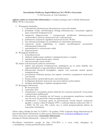 Samodzielny Publiczny Szpital Kliniczny Nr 1 PUM w Szczecinie 71-252 Szczecin, ul. Unii Lubelskiej 1 ogłasza nabór na stanowisko informatyka w wymiarze pełnego etatu w Dziale Informatyki SPSK1 PUM w Szczecinie. I. Wymagania niezbędne: 1. wykształcenie informatyczne lub pokrewne wyŜsze lub średnie 2. posiadanie wiedzy umoŜliwiającej obsługę informatyczną i utrzymanie ciągłości pracy stanowisk komputerowych 3. znajomość diagnozowania i rozwiązywania problemów informatycznych uŜytkowników zarówno sprzętowych jak i softwarowych 4. podstawowa znajomość zagadnień sieciowych (LAN i WAN) 5. stan zdrowia pozwalający na zatrudnienie na stanowisku informatyka 6. znajomość języka angielskiego w stopniu umoŜliwiającym zrozumienie dokumentacji technicznej 7. samodzielność w wykonywaniu zadań 8. dyspozycyjność II. Wymagania dodatkowe: 1. komunikatywność 2. zdolność analitycznego myślenia i umiejętność pracy w zespole 3. umiejętność organizowania pracy własnej 4. chęć poszerzania swojej wiedzy III. Zakres wykonywanych zadań na stanowisku: 1. nadzór nad sprzętem komputerowym znajdującym się na stanie Szpitala oraz odpowiedzialność za jego prawidłowe funkcjonowanie 2. dokonywanie bieŜących przeglądów, napraw oraz usuwanie usterek sprzętu komputerowego 3. prowadzenie ewidencji; sprzętu, kart napraw, systemów i programów uŜytkowych oraz licencji 4. bieŜąca pomoc uŜytkownikom przy stanowisku pracy 5. konfiguracja drukarek sieciowych oraz personalnych uŜytkowników 6. instalacja niezbędnego w Szpitalu oprogramowania IV. Wymagane dokumenty: 1. list motywacyjny 2. curriculum vitae 3. oświadczenie o posiadaniu pełnej zdolności do czynności prawnych i korzystania z pełnych praw publicznych 4. oświadczenie, Ŝe kandydat nie był karany za przestępstwa popełnione umyślnie oraz nie toczy się przeciwko niemu postępowanie karne 5. oświadczenie o wyraŜeniu zgody na przetwarzanie swoich danych osobowych zgodnie z ustawa z dnia 29 sierpnia 1997r. o ochronie danych osobowych (Dz. U. z 2002r. Nr 101, poz. 926, z późn. zm.) w celach przeprowadzenia naboru na stanowisko Informatyk. Oferty naleŜy składać do dnia 31.12.2015 r. do godziny 15:00, wyłącznie drogą elektroniczną do Kierownika Działu Informatyki na adres poczty elektronicznej: [email protected] Oferty winny być zatytułowane: stanowisko Informatyk. Kontakt do Działu Informatyki – telefon 91 425-3051. Weryfikacja kandydatów nastąpi do dnia 12.01.2016 r., o czym osoby ubiegające się o zatrudnienie, zostaną poinformowane mailowo.