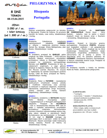 PIELGRZYMKA 8 DNI TERMIN 08-15.04.2015 CENA: 3.050 zł / os. + bilet lotniczy (od 1.300 zł / os.) Hiszpania Portugalia SANTIAGO DE COMPOSTELA DZIEŃ 1 DZIEŃ 6 Zbiórka uczestników pielgrzymki na lotnisku w Warszawie. Przelot do Lizbony. Po przylocie transfer do hotelu, czas wolny, obiadokolacja i nocleg. Śniadanie. Przejazd do SANTIAGO DE COMPOSTELA: Monte Gozo - Góra Radości, katedra. Jest to jedno z trzech świętych miast na świecie wraz z Rzymem i Jerozolimą. Obiadokolacja i nocleg. DZIEŃ 2 Śniadanie. Całodzienne zwiedzanie najciekawszych zakątków LIZBONY tj.: Alfama – najstarsza dzielnica miasta, Zamek Św. Jerzego, Wieża Betlejemska, plac Rossio. Obiadokolacja i nocleg. DZIEŃ 3 Lizbona DZIEŃ 7 Śniadanie. Wyjazd w kierunku granicy portugalskiej. Zwiedzanie PORTO, drugiego pod względem wielkości i roli gospodarczej miasta Portugalii. Miasto znajduje się na liście Światowego Dziedzictwa UNESCO dzięki zachowaniu oryginalnej architektury. Tutaj zatrzymamy się w jednej z piwnic na degustację wina. Po południu jedziemy do COIMBRY. Zwiedzanie klasztoru karmelitanek, w którym mieszkała siostra Łucja. Przejazd na obiadokolację i nocleg. Po śniadaniu przejazd do QUELUZ, gdzie znajduje się Pałac Królewski – XVIII-wieczna budowla będąca wzorcowym przykładem architektury rokoko w Portugalii. Następnie przejazd na zwiedzanie portugalskiego Wersalu czyli SINTRY. Miasteczko to leży na zalesionych wzgórzach, a jego główne DZIEŃ 8 atrakcje to bajkowy Palacio da Pena i Castelo Po śniadaniu transfer z hotelu na lotnisko. dos Mouros (zamek Maurów). Po wizycie Wylot do Polski. Zakończenie pielgrzymki. w najbardziej na zachód wysuniętym punkcie Europy, Cabo da Roca, przejazd do Fatimy. Obiadokolacja i nocleg. DZIEŃ 4 Fatima Śniadanie. Pobyt w FATIMIE - nawiedzenie sanktuarium (możliwość wzięcia udziału w modlitwie różańcowej oraz procesji ze świecami w kapliczce objawień; możliwość odprawienia nabożeństwa Drogi Krzyżowej, znanej również pod nazwą Kalwarii Węgierskiej). Obiadokolacja i nocleg. DZIEŃ 5 1 9 7 8 Sintra R O K OŻ Z A Ł . Po śniadaniu zwiedzimy w BATALHA klasztor Matki Boskiej Zwycięskiej jeden z najpiękniejszych w Portugalii późnogotyckich zabytków. Przejazd do ALCOBACA - XIII w. benedyktyński klasztor NMP. Jest to jeden z najlepiej zachowanych przykładów architektury cystersów. Monumentalne rozmiary klasztoru odzwierciedlają ważną rolę, jaką zakon odegrał w pierwszych latach formatowania się państwowości w Portugalii. 10 km stąd w NAZARE rozciąga się zapierający dech w piersiach widok na Ocean Atlantycki. Nazare pozostaje nadal tradycyjną wioską rybacką. Powrót do Fatimy na obiadokolację i nocleg. ul. Inowrocławska 35 85-153 Bydgoszcz www. eurotim.pl e-mail: [email protected] ZAPEWNIAMY: - 7 noclegów, - wyżywienie: 7 śniadań i 7 obiadokolacji; - przejazd autokarem na podanej trasie; - ubezpieczenie KL i NNW; - opiekę pilota. DODATKOWO PŁATNE: - bilety wstępu, opłaty za miejscowych przewodników oraz inne wydatki programowe (ok. 120 euro / osoba). tel./fax: (+48 52) 340 41 08