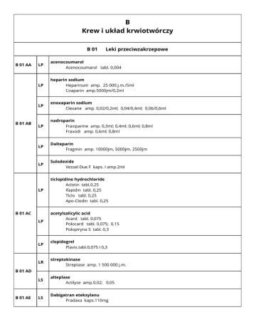 B Krew i układ krwiotwórczy B 01 B 01 AA B 01 AB Leki przeciwzakrzepowe LP acenocoumarol Acenocoumarol tabl. 0,004 LP heparin sodium Heparinum amp. 25 000 j.m./5ml Coaparin amp.5000jm/0,2ml LP enoxaparin sodium Clexane amp. 0,02/0,2ml; 0,04/0,4ml; 0,06/0,6ml LP nadroparin Fraxiparine amp. 0,3ml; 0,4ml; 0,6ml; 0,8ml Fraxodi amp. 0,6ml; 0,8ml LP Dalteparin Fragmin amp. 10000jm, 5000jm. 2500jm LP Sulodexide Vessel Due F kaps. I amp.2ml LP ticlopidine hydrochloride Aclotin tabl.0,25 Ifapidin tabl. 0,25 Ticlo tabl. 0,25 Apo-Clodin tabl. 0,25 LP acetylsalicylic acid Acard tabl. 0,075 Polocard tabl. 0,075; 0,15 Polopiryna S tabl. 0,3 LP clopidogrel Plavix.tabl.0,075 i 0,3 LR streptokinase Streptase amp. 1 500 000 j.m. LS alteplase Actilyse amp.0,02; 0,05 LS Dabigatran eteksylanu Pradaxa kaps.110mg B 01 AC B 01 AD B 01 AE B 01 AX LP Rivaroxaban Xarelto tabl.pow. 10mg, 15mg, 20mg B 02 Leki przeciwkrwotoczne B 02 AA LP tranexamic acid Exacyl amp. 0,5/5ml , tabl.powl.0,5 B 02 BA LR phytomenadione Vitacon tabl. 0,01 i amp.0,01/ml B 02 BD LR czynniki krzepnięcia II, VII, IX i X Octaplex – fiol. B 02 BX LP etamsylate Cyclonamine tabl.0,25 i amp.0,25 B 03 Preparaty stosowane w niedokrwistości LR ferrous sulphate Hemofer prolongatum draż. Sorbifer Durules tabl. LS ferric oxide Ferrum-Lek amp.0,1/2ml LR izomaltozyd 1000 żelaza III Monover amp. 100mg/1ml; 500mg/5ml B 03 BA LR cyancobalamin Vitaminum B12 amp. 100 µg/2ml B 03 BB LR B 03 AA B 03 AC folic acid Acidum folicum tabl. 0,015 , 0,005 Folacid tabl. 0,0015, 0,005 B 05 B 05 AA Substytuty osocza i płyny infuzyjne LR albumina ludzka Albuminy 20% fl. 50ml; 100ml i 5% fl. 250ml Alburex 20% 50ml. 100ml. LP dextran Dekstran 40 000 roztwór do inf. Dekstran 70 000 roztw. do inf. LP hydroksyethy strach HAES Steril 6%; 10% roztwór do inf. 6%, -10% Hydroksyetyloskrobia roztw. do inf. Voluven roztw. do inf. LR aminoacids Aminosteril KE 10% bez węglowodanów 500ml Dipeptiven 100ml LR intralipid (phospholipids) Intralipid 20% fl. 500ml Lipofundin MCT/LCT 10%; 20% LP glucose Glucosum 5% , 10%, 20%, 40% LR preparaty złożone Aminomix 1 fl. 1000ml, 1500ml Clinomel fl.N5-800, N6-900, N7-1000 Compleven fl. NutriFlex worek 3-komorowy LP sodium chloride Natrium chloratum 0,9% inj. 10ml, 100ml, 250ml, 500ml, 1000ml, 5000ml LP płyn wieloelektrolitowy Płyn fizjologiczny wieloelektrolitowy izotoniczny fl. 500ml Płyn nawadniający interwencyjny hipotoniczny fl. 500ml Płyn żołądkowy zapobiegawczy izotoniczny fl. 500ml Solutio Ringeri fl. 500ml Sterofundin B 05 BB LP preparaty złożone Glucosum 5% in Natrio chlorato 0,9% 1:1 B 05 BC LP mannitol Mannitol inj. 20% fl. 250ml, 100ml i 15% fl.250ml, 100ml. LP sodium hydroxycarbamate Natrium bicarbonicum 8,4% amp LR phosphates, potassium Addiphos fl. 20ml Glycophos fiol. LS vitamins Soluvit N fl. 10ml Vitalipid N Adult fl. 10ml Cernevit B 05 BA B 05 BB B 05 XA B 05 XC B 05 XX LR trace elements Addamel N amp. 10ml
