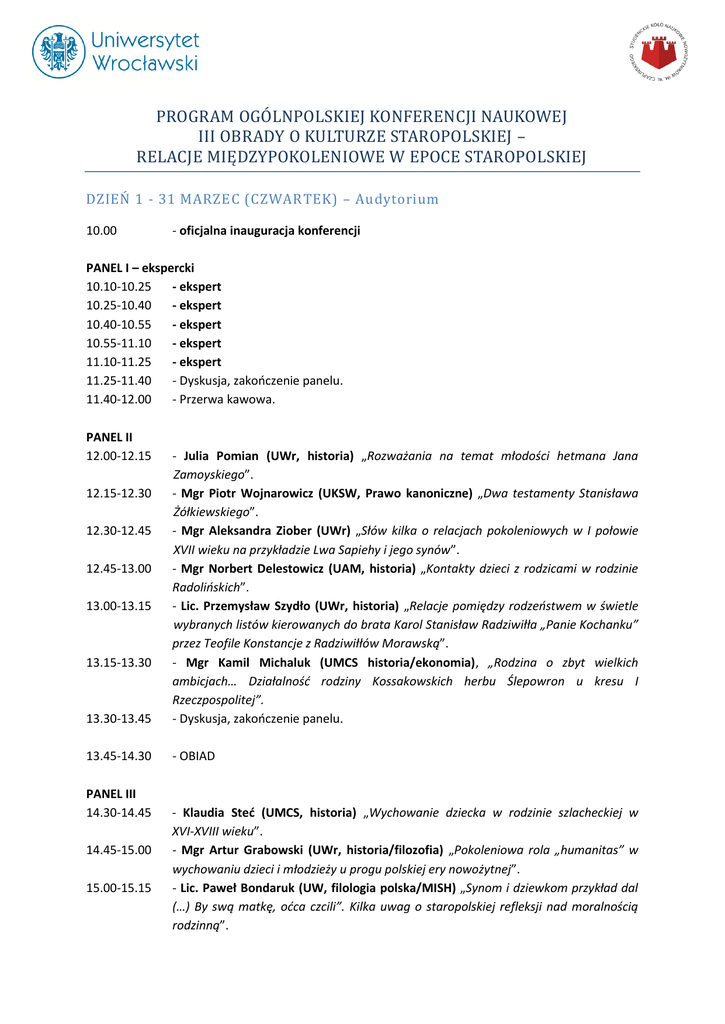 PROGRAM OGÓLNPOLSKIEJ KONFERENCJI NAUKOWEJ III OBRADY O KULTURZE STAROPOLSKIEJ – RELACJE MIĘDZYPOKOLENIOWE W EPOCE STAROPOLSKIEJ DZIEŃ 1 - 31 MARZEC (CZWARTEK) – Audytorium 10.00 - oficjalna inauguracja konferencji PANEL I – ekspercki 10.10-10.25 - ekspert 10.25-10.40 - ekspert 10.40-10.55 - ekspert 10.55-11.10 - ekspert 11.10-11.25 - ekspert 11.25-11.40 - Dyskusja, zakończenie panelu. 11.40-12.00 - Przerwa kawowa. PANEL II 12.00-12.15 13.30-13.45 - Julia Pomian (UWr, historia) „Rozważania na temat młodości hetmana Jana Zamoyskiego”. - Mgr Piotr Wojnarowicz (UKSW, Prawo kanoniczne) „Dwa testamenty Stanisława Żółkiewskiego”. - Mgr Aleksandra Ziober (UWr) „Słów kilka o relacjach pokoleniowych w I połowie XVII wieku na przykładzie Lwa Sapiehy i jego synów”. - Mgr Norbert Delestowicz (UAM, historia) „Kontakty dzieci z rodzicami w rodzinie Radolińskich”. - Lic. Przemysław Szydło (UWr, historia) „Relacje pomiędzy rodzeństwem w świetle wybranych listów kierowanych do brata Karol Stanisław Radziwiłła „Panie Kochanku” przez Teofile Konstancje z Radziwiłłów Morawską”. - Mgr Kamil Michaluk (UMCS historia/ekonomia), „Rodzina o zbyt wielkich ambicjach… Działalność rodziny Kossakowskich herbu Ślepowron u kresu I Rzeczpospolitej”. - Dyskusja, zakończenie panelu. 13.45-14.30 - OBIAD 12.15-12.30 12.30-12.45 12.45-13.00 13.00-13.15 13.15-13.30 PANEL III 14.30-14.45 14.45-15.00 15.00-15.15 - Klaudia Steć (UMCS, historia) „Wychowanie dziecka w rodzinie szlacheckiej w XVI-XVIII wieku”. - Mgr Artur Grabowski (UWr, historia/filozofia) „Pokoleniowa rola „humanitas” w wychowaniu dzieci i młodzieży u progu polskiej ery nowożytnej”. - Lic. Paweł Bondaruk (UW, filologia polska/MISH) „Synom i dziewkom przykład dal (…) By swą matkę, oćca czcili”. Kilka uwag o staropolskiej refleksji nad moralnością rodzinną”. 15.15-15.30 15.30-15.45 15.45-16.00 PANEL IV 16.00-16.15 16.15-16.30 16.30-16.45 16.45-17.01 17.00-17.15 17.15-17.30 - Lic. Michał Podsędek (UWr, historia/psychologia/ekonomia) „Nastąpił syn ojca, nie jako syn na ojca, jako jaki ultaj.”- konflikty między dziećmi a rodzicami na terenie klucza jazowskiego od drugiej połowy XVII wieku do początków wieku wieku XIX”. - Dyskusja, zakończenie panelu. - Przerwa kawowa. - Lic. Bartosz Różanek (UAM, historia) „Krzysztof Hegendorfer i jego rewolucyjny program nauki realizowany w Akademii Lubrańskiego w Poznaniu w XVI wieku”. - Lic. Mateusz Haberek (UMCS, historia, prawo) „Kryzys w armii Rzeczypospolitej jako przejaw degradacji mentalności młodszych żołnierzy i zaniku wewnętrznego szkolenia kadr przez weteranów w połowie XVII wieku”. - Lic. Bartłomiej Matura (UWr, historia) „Różnice pokoleń wśród elit w XVIII wiecznej Rzeczpospolitej, na przykładzie parlamentarzystów z sejmu 1746 r.”. - Mgr Marta Wojas (UW, filologia polska) „Ach, kochana matko, Brzuch mię jakoś boli” Reakcje rodziców na ciąże niezamężnych córek- reprezentacja w pieśni popularnej i ludowej”. - Mateusz Kucab (URz, filologia polska, filozofia) „Ledwie com w te przestrone świata weszła wrota”- o dziecku w poezji barokowej. - Dyskusja, zakończenie panelu i pierwszego dnia, obrad. DZIEŃ 2 – 1 KWIETNIA (PIĄTEK) - Audytorium 10.30-11.00 PANEL I 11.00-11.15 11.15-11.30 11.30-11.45 11.45-12.01 12.00-12.15 12.15-12.30 PANEL II 12.30-12.45 12.45-13.01 13.00-13.15 - Koncert muzyki dawnej Oak Brothers – Radosław i Szczepan Dembińscy. - Lic. Marcin Czapliński (UWr., historia) „Relacje między Zygmuntem II Augustem a jego matką”. - Magdalena Butra (UW., historia) „Relacje rodzinne po koronacji Zygmunta III na króla Polski- Zygmunta, Anna i Jan”. - Lic. Paweł Borowy (UWr., historia) „Wychowanie dzieci Zygmunta III i i ich późniejsze życie”. - Mgr Robert Tomczak (UAM., historia) „Wychowanie księcia Michała Korybuta Wiśniowieckiego”. - Dyskusja, zakończenie panelu. - Przerwa kawowa. - Mgr Milena Mierzejewska (UKSW, historia) „Życie za murami klauzury- wybór rodziców czy dzieci? Czyli rzecz o wstąpieniach panien do klasztoru”. - Mgr Justyna Bąk (UWr, historia) „Strata i trauma widziana oczami kaznodziejówpostawa człowieka w obliczu śmierci najbliższych”. - Mgr Bożena Ronowska (UG, historia, historia sztuki/archeologia) „Więzy krwi. Powołani w procesach czarownic na podstawie akt procesowych z okresu staropolskiego”. 13.15-13.30 13.45-14.00 - Mgr Stanisław Witecki (UJ, historia) „Relacje rodzinne w nauczaniu Kościoła Katolickiego na wsi mazowieckiej pod koniec XVIII wieku”. - Lic. Paweł Szafrański (UWr, historia) „Relacje Mikołaja Radziwiłła „Czarnego” z synami na tle religijnym.” -Dyskusja, zakończenie panelu. 14.00-14.45 -OBIAD 13.30-13.45 PANEL III 14.45-15.01 15.00-15.15 15.15-15.30 15.30-15.45 15.45-16.01 16.00-16.15 - Jakub Zagórny (UWr, historia) „Relacje międzypokoleniowe w rodzie Wiśniowieckich na przykładzie Jaremy i Michała Korybuta Wiśniowieckiego”. - Lic. Paweł Kożuchowski (UWr, historia) „Relacje ojciec-syn na przykładzie Jeremiego i Michała Wiśniowieckiego oraz Jakuba i Jana Sobieskich”. - Lic Przemysław Kalwara (UWr, historia) „Jaki ojciec taki syn? Konflikty na linii matka-syn w rodzinie Sobieskich, czyli problemy rodzinne Jana i Jakuba”. - Mgr Dorota Wiśniewska (UWr, historia) „Jeszcze o przyjaźni (?) Stanisława August Poniatowskiego z panią Goeffrin”. - Mgr Katarzyna Kaczmarek (UO, historia) „Ojcostwo w świetle prawa staropolskiego w kontekście potomstwa ślubnego”. - Dyskusja, zakończenie panelu i drugiego dnia obrad.