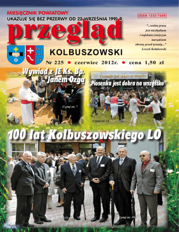 MiesiĘcznik Powiatowy przegląd ukazuje siĘ bez przerwy od 22 września 1991 r. kolbuszowski ISSN 1232-7646 "...wolna prasa jest niezbędnym i najskuteczniejszym narzędziem obrony przed tyranią..." Leszek Kołakowski Nr 225 q czerwiec 2012r. q cena 1,50 zł Wywiad z JE Ks. Bp. Janem Ozgą „Piosenka jest dobra na wszystko” Czytaj str. 7 Czytaj str. 14 100 lat Kolbuszowskiego LO Czytaj str. 19 przegląd KOLBUSZOWSKI 2 P. H. U. Nr 225 S.J. 36-100 Kolbuszowa, ul. Piłsudskiego 125c, tel. 17 22 72 396 Oferuje: r materiały dociepleniowe r materiały budowlane r nawozy sztuczne r węgiel r piaski, żwiry r stal r usługi transportowe r rozładunek towarów HDS-em SIEDZIBA FIRMY: 36-100 Kolbuszowa, ul. Piłsudskiego 125c, tel. 17 22 72 396 CEMENT OŻARÓW Kolbuszowa, ul. Obrońców Pokoju 9 tel. 17 22 73 500 Nowa Dęba, ul. Kościuszki 1B/2 tel. 15 846 53 44 ODDZIAŁY: w Cmolasie tel. 607 333 471 w Hyżnem tel. 17 2295 835 zapraszamy codziennie od 700 - 1700 sobota 700 - 1300 przegląd KOLBUSZOWSKI Nr 225 3 100 lat minęło... Szanowna Pani Dyrektor, Wielce Szanowne Panie Profesor, Panowie Profesorowie, Drogie Koleżanki i Koledzy – wychowankowie naszej Alma Mater Colbuszoviensis. Szanowne władze miasta i powiatu, Szanowni Goście. Bardzo jestem rad, że dane jest mi wystąpić na tym jubileuszowym zjeździe. Jako historyk z wykształcenia chcę się z Państwem podzielić krótką historią naszej Jubilatki. Do utworzenia tego „zakładu naukowego” zainspirowało społeczność kolbuszowską u genezy XX w pragnienie stworzenia dla młodzieży z miasteczka i okolic możliwości kształcenia się, poszerzania horyzontów myślowych, zdobywania wiedzy i poznawania świata. Nim szkoła rozpoczęła swoją działalność w roku szkolnym 1911/1912 z inicjatywy kolbuszowskiego proboszcza i dziekana Jana Markiewicza oraz kilku innych mieszkańców Kolbuszowej i hr. Jerzego Tyszkiewicza powstało w 1910 Towarzystwo Gimnazjalne, które wzięło na swoje barki sprawę pozyskiwania funduszów na założenie i prowadzenie szkoły średniej. W sprawie jej założenia swoje interpelacje poselskie składali w imieniu społeczności powiatu kolbuszowskiego posłowie do Sejmu Galicyjskiego we Lwowie dr Ernest Bandrowski (20.01.1912) i ks. Eugeniusz Okoń. Pierwszy domagał się założenia szkoły, drugi już w dniu 1.03.1914 wystąpił z wnioskiem o jej upaństwowienie. Nauka w rządowej szkole austriackiej była o wiele tańsza a szkoła łatwiejsza w prowadzeniu niż gimnazjum prywatne. Nim szkoła uzyskała oficjalne pozwolenie na jej zaistnienie, we wrześniu 1910 rozpoczęło w niej naukę (20 uczniów i 10 uczennic). Tak więc od pierwszych dni istnienia naszej szkoły placówka ta była szkołą prywatną i koedukacyjną. Towarzystwo Gimnazjalne uzyskało oficjalną zgodę na jej prowadzenie, gdy na jej czele – jako dyrektor stanął emerytowany nauczyciel I Gimnazjum w Rzeszowie Franciszek Sołtysik. W protokołach Rady gminy i miasta Kolbuszowej o gimnazjum naszym znajdujemy pierwszą wzmiankę pod datą 14 XII 1912r, kiedy to miejscowi rajcy w preliminarzu budżetowym miasta przeznaczyli 500 koron na potrzeby Towarzystwa Gimnazjalnego. Kwota ta była wstawiona do wydatków miasta. Odtąd Rada gminy i miasta w swoim budżecie zawsze pamiętała o dotacji dla Towarzystwa. Tego samego dnia ks. Jan Markiewicz postawił wniosek, aby w sprawie przyspieszenia wizytacji szkoły ze strony Krajowej Rady Szkolnej we Lwowie wysłać do tego miasta delegację. Wizytacja taka była niezbędna, aby szkoła uzyskała zatwierdzenie i prawa szkoły publicznej (prawa publiczności). Delegacja (burmistrz Kolbuszowej Władysław Skowroński, ks. Jan Markiewicz i dr Kazimierz Czerny) spotkała się we Lwowie z władzami CK Krajowej Rady dnia 12 lutego 1913, a już15 lutego składała Radzie gminy i miasta sprawozdanie z tych rozmów. Zachowała się opinia wizytującego kolbuszowskie gimnazjum dyrektora I Gimnazjum w Rzeszowie Dezyderego Ostrowskiego z 25 IV 1914 r. Oto jej fragment: „szkoła mieści się w wynajętym parterowym domu (…) suchym, jasnym i dobrze utrzymanym (…), ma dobre położenie, ale budynek jest za mały. Zarząd (Towarzystwa) to rozumie i czyni zabiegi na dom własny na 4 klasowe gimnazjum, na zakup upatrzonej realności, sprzęty dobre, wystarczające na potrzeby”. W konkluzji wizytator ów dodawał „Wnioski ogólne: stan nauki dobry, uczniowie pochodzą z warstw ubogich. W tej wielkiej wsi, jaką jest miasteczko Kolbuszowa jedynie szkoła pracuje nad rozwojem umysłowym ucznia, różnice między klasą I a III przypisywać można jedynie szkole. (…) Stąd poparcie wniosku ( o nadanie praw publiczności) na ten rok szkolny 1913/1914 dla klas I-III i na rok 1914/1915 dla klas I – IV”. Szkoła wtedy mieściła się w prywatnym domu państwa Osiniaków. Marian Osiniak był jednym ze znaczących dobrodziejów Gimnazjum. Borykając się z różnorakimi trudnościami gimnazjalna szkoła nad Nilem pracowała (za wyjątkiem pierwszych dwóch lat I wojny 1914-1915) nieprzerwanie aż do zakończenia działań wojennych a następnie przez całe Dwudziestolecie aż do września 1939 roku. Jakie były to trudności? Sięgnijmy choćby do „Wiadomości Kolbuszowskich” nr 9 z 1934r. „Gimnazjum prywatne z prawami publiczności przechodzi obecnie ciężkie chwile (…). Utrzymanie tego zakładu znalazło się pod znakiem zapytania. Jeżeli w najbliższym czasie nie zostaną dokonane radykalne postanowienia sanacji finansów, likwidacja tego od 25 lat istniejącego zakładu stanie się nieuniknioną”. Likwidacja ta nie nastąpiła, a szkoła pracowała nadal. Ostania wizytacja Gimnazjum i Liceum Kolbuszowskiego z ramienia Lwowskiego Kuratorium Szkolnego miała miejsce w 1938r., a jej wynik był pozytywny. Szkoła otrzymała prawa publiczności na rok 1939/1940. Kiedy nastała długa noc okupacji hitlerowskiej zostało zlikwidowane polskie szkolnictwo wyższe i średnie. Nauczycie