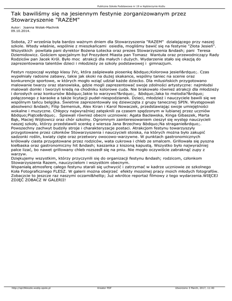 Publiczna Szkoła Podstawowa nr 19 w Kędzierzynie-Koźlu Tak bawiliśmy się na jesiennym festynie zorganizowanym przez Stowarzyszenie "RAZEM" Autor: Joanna Wolak-Machnik 09.10.2014. Sobota, 27 września była bardzo ważnym dniem dla Stowarzyszenia "RAZEM" działającego przy naszej szkole. Wtedy właśnie, wspólnie z mieszkańcami osiedla, mogliśmy bawić się na festynie "Złota Jesień". Wszystkich powitała pani dyrektor Bożena Łotecka oraz prezes Stowarzyszenia – pani Teresa Dziemidowicz. Gościem specjalnym był Prezydent Miasta pan Tomasz Wantuła oraz przewodniczący Rady Rodziców pan Jacek Król. Było moc atrakcji dla małych i dużych. Wydarzenie stało się okazją do zaprezentowania talentów dzieci i młodzieży ze szkoły podstawowej i gimnazjum. Festyn rozpoczął występ klasy IVc, która zaśpiewała piosenkę „Kolorowa jesień”. Czas wypełniały radosne zabawy, takie jak skoki na dużej skakance, wspólny taniec na scenie oraz konkurencje sportowe, w których mogło wziąć udział każde dziecko. Dla milusińskich przygotowano malowanie twarzy oraz stanowiska, gdzie mogli zaprezentować swoje zdolności artystyczne: najmłodsi malowali domki i tworzyli kredą na chodniku kolorowe cuda. Nie brakowało również atrakcji dla młodzieży i dorosłych oraz konkursów „Jakie to warzywo?”, „Jaka to melodia?” połączonego z karaoke a także licytacji pudeł-niespodzianek. Dzieci, młodzież i nauczyciele bawili się we wspólnym tańcu belgijka. Świetnie zaprezentowały się dziewczęta z grupy tanecznej SPIN. Występowali absolwenci – Filip Semeniuk, Alex Kiran i Karol Nowaczek, przedstawiając swoje umiejętności wokalne i muzyczne. Chłopcy najwyraźniej zatęsknili za czasem spędzonym w lubianej przez uczniów „Piątce”. Śpiewali również obecni uczniowie: Agata Bacławska, Kinga Gibaszek, Marta Bąk, Maciej Wójtowicz oraz chór szkolny. Ogromnym zainteresowaniem cieszył się występ nauczycieli naszej szkoły, którzy przedstawili scenkę z wiersza Jana Brzechwy „Na straganie”. Powszechny zachwyt budziły stroje i charakteryzacje postaci. Atrakcjom festynu towarzyszyły przygotowane przez członków Stowarzyszenia i nauczycieli stoiska, na których można było zakupić sadzonki roślin, kwiaty cięte oraz przetwory owocowo-warzywne. W punktach gastronomicznych królowały ciasta przygotowane przez rodziców, wata cukrowa i chleb ze smalcem. Grillowała się pyszna kiełbaska oraz gastronomiczny hit – kaszanka z kiszoną kapustą. Wszystko było najwyraźniej palce lizać, bo nawet grillowany chleb rozszedł się na pniu. Nie mogło oczywiście zabraknąć zupy z warzyw. Dziękujemy wszystkim, którzy przyczynili się do organizacji festynu – rodzicom, członkom Stowarzyszenia Razem, nauczycielom i wszystkim obecnym. Wspaniałą atmosferę całego festynu starali się uchwycić i zatrzymać w kadrze uczniowie ze szkolnego Koła Fotograficznego FLESZ. W galerii można obejrzeć efekty mozolnej pracy moich młodych fotografów. Zobaczcie to jeszcze raz naszymi oczami… Już wkrótce reportaż filmowy z tego wydarzenia.WIĘCEJ ZDJĘĆ ZOBACZ W GALERII! http://sp19kkozle.wodip.opole.pl Kreator PDF Utworzono 3 March, 2017, 11:40