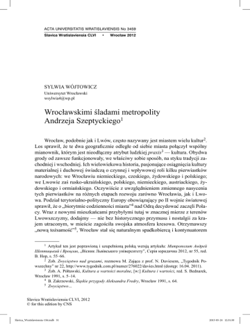 ACTA UNIVERSITATIS WRATISLAVIENSIS No 3459 Slavica Wratislaviensia CLVI • Wroc³aw 2012 SYLWIA WÓJTOWICZ Uniwersytet Wrocławski [email protected] Wrocławskimi śladami metropolity Andrzeja Szeptyckiego1 Wrocław, podobnie jak i Lwów, często nazywany jest miastem wielu kultur2. Los sprawił, że te dwa geograficznie odległe od siebie miasta połączył wspólny mianownik, którym jest nieodłączny atrybut ludzkiej praxis3 — kultura. Obydwa grody od zawsze funkcjonowały, we właściwy sobie sposób, na styku tradycji zachodniej i wschodniej. Ich wielowiekowa historia, pasjonujące osiągnięcia kultury materialnej i duchowej świadczą o czynnej i wpływowej roli kilku pierwiastków narodowych: we Wrocławiu niemieckiego, czeskiego, żydowskiego i polskiego; we Lwowie zaś rusko-ukraińskiego, polskiego, niemieckiego, austriackiego, żydowskiego i ormiańskiego. Oczywiście z uwzględnieniem zmiennego nasycenia tych pierwiastków na różnych etapach rozwoju zarówno Wrocławia, jak i Lwowa. Podział terytorialno-polityczny Europy obowiązujący po II wojnie światowej sprawił, że o „biorytmie codzienności miasta”4 nad Odrą decydować zaczęli Polacy. Wraz z nowymi mieszkańcami przybyłymi tutaj w znacznej mierze z terenów Lwowszczyzny, dodajmy — nie bez historycznego przymusu i nostalgii za krajem utraconym, w mieście zagościła swojska atmosfera kresowa. Otrzymawszy „nową tożsamość”5, Wrocław stał się naturalnym spadkobiercą i kontynuatorem 1 Artykuł ten jest poprawioną i uzupełnioną polską wersją artykułu: Митрополит Андрей Шептицький і Вроцлав, „Вісник Львівського університету”, Серія юридична 2012, nr 55, red. В. Нор, s. 55–66. 2 Zob. Zwycięstwo nad gruzami, rozmowa M. Zająca z prof. N. Daviesem, „Tygodnik Powszechny” nr 22, http://www.tygodnik.com.pl/numer/276022/davies.html (dostęp: 16.04. 2011). 3 Zob. A. Półtawski, Kultura a wartości moralne, [w:] Kultura i wartości, red. S. Bednarek, Wrocław 1991, s. 5–14. 4 B. Zakrzewski, Śląskie przygody Aleksandra Fredry, Wrocław 1991, s. 64. 5 Zwycięstwo… Slavica Wratislaviensia CLVI, 2012 © for this edition by CNS Slavica_Wratislawiensia-156.indb 51 2013-05-24 12:31:50 52 • Sylwia Wójtowicz polskich tradycji Lwowa, w tym również tradycji uniwersyteckich6. Na tutejszym uniwersytecie swe pasje naukowe kontynuowali wychowankowie Uniwersytetu Jana Kazimierza. Lwowscy uczeni zostali nowymi gospodarzami okaleczonych i opuszczonych po wojnie budynków uczelni. Jak pisze Wojciech Wrzesiński, „we Wrocławiu ukształtowała się grupa uczonych, których można określić mianem »ojców Uniwersytetu«, na czele z pierwszym rektorem […] Stanisławem Kulczyńskim, dawnym rektorem lwowskim. To oni sformowali program struktury Uniwersytetu Wrocławskiego, wypracowali zasady wychowania, kształcenia i badań naukowych”7. Z czasem też Wrocławiowi przypadła ekspozycja Panoramy Racławickiej, w murach miasta swoje miejsce odnalazło część zbiorów lwowskiej Biblioteki Ossolineum. Wreszcie w przestrzeń Rynku, po wielu bataliach mieszkańców z upolitycznioną machiną urzędniczą lat pięćdziesiątych XX wieku, na stałe wpisany został „repatriowany” ze Lwowa pomnik Aleksandra Fredry, który cierpliwie czekał na wybór swojego locum do roku 19568. Fredrowskie wrocławsko-lwowskie koneksje nie ograniczają się jednak do zmonumentalizowanej obecności polskiego pisarza w centrum dzisiejszego Wrocławia. Sięgają bowiem połowy XIX wieku, kiedy to sam Fredro przybywał do miasta, kiedy to raz po raz twórczy duch autora Zemsty uobecniał się tutaj za sprawą wystawianych w teatrach sztuk scenicznych oraz kiedy w połowie lat osiemdziesiątych XIX stulecia studentami prusko-niemieckiego Uniwersytetu Fryderyka Wilhelma we Wrocławiu zostali jego wnukowie, w tym hrabia Roman Maria Aleksander Szeptycki (1865– 1944), późniejszy metropolita Kościoła greckokatolickiego w Galicji — Andrzej Szeptycki. W historię rodziny Andrzeja Szeptyckiego wpisuje się ta sama wielokulturowość, która konstytuuje mikrokosmos miast związanych z jego biografią, wciąż chyba mało znaną zarówno czytelnikowi polskiemu, jak i ukraińskiemu. Urodzony 29 lipca 1865 roku w majątku rodzinnym w Przyłbicach, we wsi należącej do województwa lwowskiego, Szeptycki był trzecim synem Zofii z Fredrów Szeptyckiej i Jana Kantego Szeptyckiego. Zofia Szeptycka to córka wspomnianego już „wrocławskiego hrabiego”9 — Aleksandra Fredry. Gorliwa katoliczka i patriotka polska była utalentowaną malarką, uprawiającą malarstwo portretowe oraz religijne. Obrazy Szeptyckiej zdobiły m.in świątynie Lwowa, Krakowa i Żółkwi. Wykazywała także zdolności pisarskie, dając pamiętnikarskie świadectwo swojej rodziny10. W poprzednich pokoleniach rodzina Szeptyckich wydała trzech biskupów unickich (greckokatolickich). Do religijnych i narodowych korzeni z czasem 6 Z. Antkowiak, Pomniki Wrocławia, Wrocław 1985, s. 56. W. Wrzesiński, Tożsamość i uniwersalizm polskiego Uniwersytetu Wrocławskiego, [w:] Studia i materiały z dziejów Uniwersytetu Wrocławskiego, red. T. Kulak, W. Wrzesiński, t. 5, Wrocław 2004, s. 56. 8 Zob. B. Zakrzewski, op. cit. 9 Ibidem, s. 64. 10 B. Zakrzewski, Wstęp, [w:] Z. Szeptycka, Młodość i powołanie ojca Romana Andrzeja Szeptyckiego zakonu św. Bazylego Wielkiego, opr. B. Zakrzewski, Wrocław 1993, s. 5–6. 7 Slavica Wratislaviensia CLVI, 2012 © for this edition by CNS Slavica_Wratislawiensia-156.indb 52 2013-05-24 12:31:50 Wrocławskimi śladami metropolity Andrzeja Szeptyckiego • 53 odwoła się też Roman jako ojciec Andrzej, przyszły metropolita ukraiński oraz jego młodszy brat Kazimierz jako ojciec Klemens — ihumen zakonu studytów, męczennik łagrów sowieckich, w 2001 roku beatyfikowany przez papieża Jana Pawła II. Starsi bracia metropolity Jerzy 