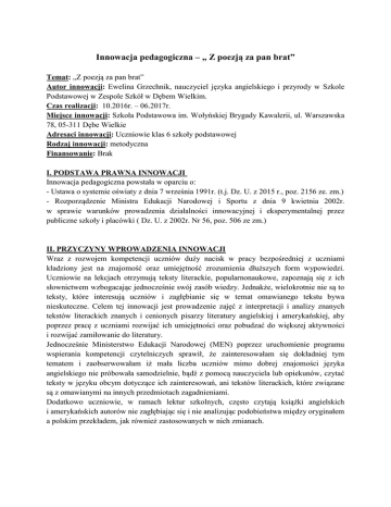 Innowacja pedagogiczna – „ Z poezją za pan brat” Temat: „Z poezją za pan brat” Autor innowacji: Ewelina Grzechnik, nauczyciel języka angielskiego i przyrody w Szkole Podstawowej w Zespole Szkół w Dębem Wielkim. Czas realizacji: 10.2016r. – 06.2017r. Miejsce innowacji: Szkoła Podstawowa im. Wołyńskiej Brygady Kawalerii, ul. Warszawska 78, 05-311 Dębe Wielkie Adresaci innowacji: Uczniowie klas 6 szkoły podstawowej Rodzaj innowacji: metodyczna Finansowanie: Brak I. PODSTAWA PRAWNA INNOWACJI Innowacja pedagogiczna powstała w oparciu o: - Ustawa o systemie oświaty z dnia 7 września 1991r. (t.j. Dz. U. z 2015 r., poz. 2156 ze. zm.) - Rozporządzenie Ministra Edukacji Narodowej i Sportu z dnia 9 kwietnia 2002r. w sprawie warunków prowadzenia działalności innowacyjnej i eksperymentalnej przez publiczne szkoły i placówki ( Dz. U. z 2002r. Nr 56, poz. 506 ze zm.) II. PRZYCZYNY WPROWADZENIA INNOWACJI Wraz z rozwojem kompetencji uczniów duży nacisk w pracy bezpośredniej z uczniami kładziony jest na znajomość oraz umiejętność zrozumienia dłuższych form wypowiedzi. Uczniowie na lekcjach otrzymują teksty literackie, popularnonaukowe, zapoznają się z ich słownictwem wzbogacając jednocześnie swój zasób wiedzy. Jednakże, wielokrotnie nie są to teksty, które interesują uczniów i zagłębianie się w temat omawianego tekstu bywa nieskuteczne. Celem tej innowacji jest prowadzenie zajęć z interpretacji i analizy znanych tekstów literackich znanych i cenionych pisarzy literatury angielskiej i amerykańskiej, aby poprzez pracę z uczniami rozwijać ich umiejętności oraz pobudzać do większej aktywności i rozwijać zamiłowanie do literatury. Jednocześnie Ministerstwo Edukacji Narodowej (MEN) poprzez uruchomienie programu wspierania kompetencji czytelniczych sprawił, że zainteresowałam się dokładniej tym tematem i zaobserwowałam iż mała liczba uczniów mimo dobrej znajomości języka angielskiego nie próbowała samodzielnie, bądź z pomocą nauczyciela lub opiekunów, czytać teksty w języku obcym dotyczące ich zainteresowań, ani tekstów literackich, które związane są z omawianymi na innych przedmiotach zagadnieniami. Dodatkowo uczniowie, w ramach lektur szkolnych, często czytają książki angielskich i amerykańskich autorów nie zagłębiając się i nie analizując podobieństwa między oryginałem a polskim przekładem, jak również zastosowanych w nich zmianach. III. ZASADY INNOWACJI Innowacja będzie realizowana na zajęciach języka angielskiego oraz na zajęciach koła języka angielskiego w klasach 6 szkoły podstawowej. Będzie to kolejna forma pracy oparta na zadaniach z tłumaczenia tekstów indywidualnie oraz w grupach, poszukiwania informacji oraz tłumaczeń i przekładów literackich przy pomocy słowników oraz Internetu oraz wykorzystując i rozwijając umiejętności z zakresu technologii informatycznej. Stosowane metody pracy będą podnosić kompetencje uczniów, rozwijać ich zainteresowania oraz umożliwiać dzielenie się swoimi spostrzeżeniami z rówieśnikami podczas wspólnie organizowanych wieczorków poetyckich.. Uczniowie wraz z nauczycielem będą mieli wpływ na tematykę i wybór tekstów literackich, które będą omawiane na zajęciach. Po szeregu zajęć, na których uczniowie będą kształtowali swoje umiejętności z zakresu translatoryki i analizy i interpretacji tekstów, efekty ich pracy będą podsumowywane i prezentowane społeczności lokalnej. Uczniowie, będą mieli również możliwość samodzielnego tłumaczenia również innych tekstów, które będą wynikały z ich zainteresowań. Chętni będą mogli zabierać swoje teksty do domu i za pomocą poczty elektronicznej przesyłać je do nauczyciela w czasie wolnym od zajęć. Teksty do tłumaczenia będą przygotowywane w różnych formach, np. jako puzzle, które dopiero po całkowitym przetłumaczeniu będą stanowiły logiczny i pełny tekst, w formie ukrytych rebusów oraz form graficznych, tak by tłumaczenie nie było czynnością monotonną. IV. ZAKRES NOWATORSTWA INNOWACJI Tłumaczenie tekstów literackich w celu podnoszenia umiejętności językowych w procesie wspomagania wszechstronnego kształcenia uczniów. Organizacja procesu kształcenia z wykorzystaniem słowników elektronicznych oraz tekstów na nośnikach multimedialnych. V. CELE OGÓLNE INNOWACJI Celem innowacji jest zachęcenie uczniów do efektywnej i twórczej pracy z tekstem anglojęzycznym poprzez analizę i interpretację popularnych tekstów. Popularyzację zajęć z tłumaczenia tekstów oraz wyszukiwania informacji i tekstów popularnonaukowych i literackich za pomocą Internetu. Wykorzystanie technologii multimedialnej na zajęciach lekcyjnych oraz w pracy indywidualnej z uczniem. VI. CELE SZCZEGÓŁOWE - rozwijanie wiadomości i umiejętności szkolnych i poza szkolnych; - pobudzanie zainteresowania uczniów i wzmacnianie motywacji do nauki; - stwarzanie możliwości osiągania sukcesu; - wprowadzanie atrakcyjnych form, metod i zasad pracy; - popularyzowanie technologii informacyjnych wśród uczniów; - zachęcanie uczniów do rozwijania swoich kompetencji językowych; - zachęcanie uczniów do podejmowania samodzielnej pracy; - kształtowanie umiejętności korzystania z programów multimedialnych oraz słowników internetowych w celu zdobywania wiadomości. VII. OCZEKIWANE EFEKTY - zwiększenie zaangażowania uczniów w proces uczenia się; - pobudzanie zainteresowania poszerzając zakres poznawanego słownictwa; - rozwijanie umiejętności analizy i interpretacji teksów napisanych w języku obcym. VIII. METODY REALIZACJI dyskusja, praca z tekstem, praca z Internetem, pokaz, gry edukacyjne, IX. FORMY PRACY: - zbiorowa - grupowa - indywidualna. X. EWALUACJA INNOWACJI: Zajęcia są przeznaczone do realizacji w ramach lekcji języka angielskiego. Efekty pracy będą na bieżąco oceniane, jako prace dodatkowe, oraz prezentowane na forum klasy i inny