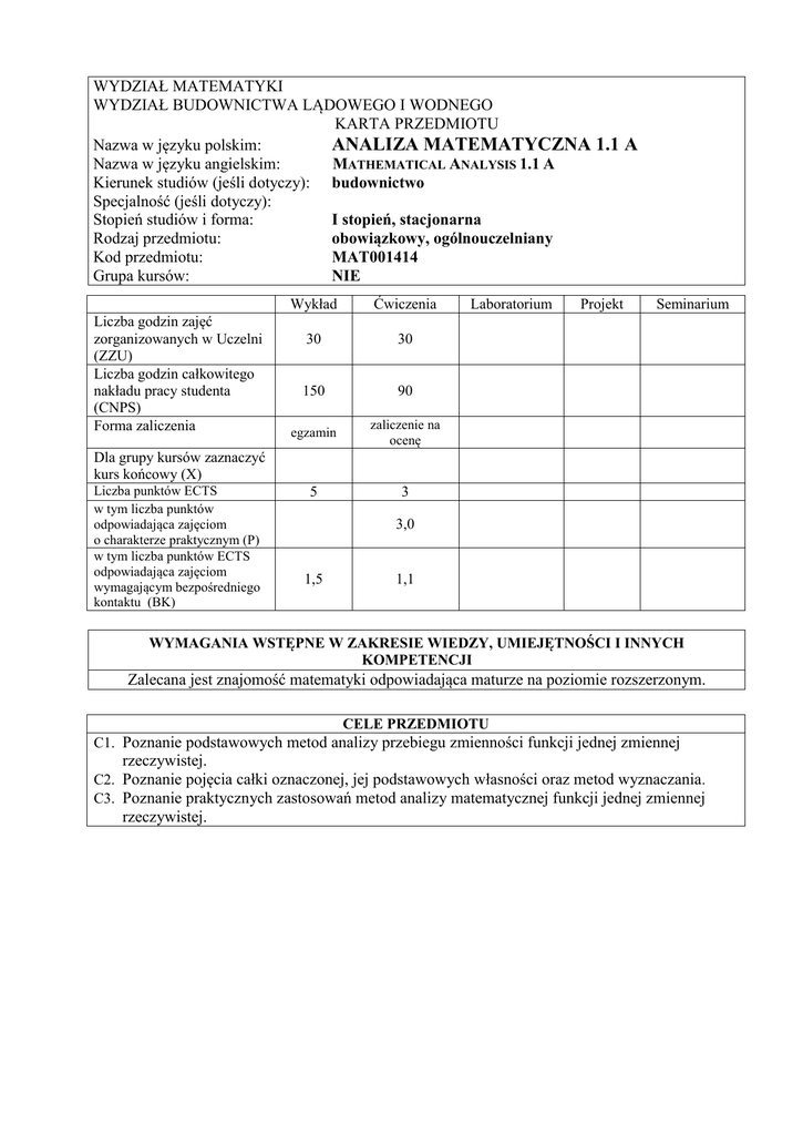 WYDZIAŁ MATEMATYKI WYDZIAŁ BUDOWNICTWA LĄDOWEGO I WODNEGO KARTA PRZEDMIOTU Nazwa w języku polskim: ANALIZA MATEMATYCZNA 1.1 A Nazwa w języku angielskim: MATHEMATICAL ANALYSIS 1.1 A Kierunek studiów (jeśli dotyczy): budownictwo Specjalność (jeśli dotyczy): Stopień studiów i forma: I stopień, stacjonarna Rodzaj przedmiotu: obowiązkowy, ogólnouczelniany Kod przedmiotu: MAT001414 Grupa kursów: NIE Liczba godzin zajęć zorganizowanych w Uczelni (ZZU) Liczba godzin całkowitego nakładu pracy studenta (CNPS) Forma zaliczenia Wykład Ćwiczenia 30 30 150 90 egzamin zaliczenie na ocenę 5 3 Laboratorium Projekt Seminarium Dla grupy kursów zaznaczyć kurs końcowy (X) Liczba punktów ECTS w tym liczba punktów odpowiadająca zajęciom o charakterze praktycznym (P) w tym liczba punktów ECTS odpowiadająca zajęciom wymagającym bezpośredniego kontaktu (BK) 3,0 1,5 1,1 WYMAGANIA WSTĘPNE W ZAKRESIE WIEDZY, UMIEJĘTNOŚCI I INNYCH KOMPETENCJI Zalecana jest znajomość matematyki odpowiadająca maturze na poziomie rozszerzonym. CELE PRZEDMIOTU C1. Poznanie podstawowych metod analizy przebiegu zmienności funkcji jednej zmiennej rzeczywistej. C2. Poznanie pojęcia całki oznaczonej, jej podstawowych własności oraz metod wyznaczania. C3. Poznanie praktycznych zastosowań metod analizy matematycznej funkcji jednej zmiennej rzeczywistej. PRZEDMIOTOWE EFEKTY KSZTAŁCENIA Z zakresu wiedzy student: PEK_W01 Zna podstawowe pojęcia i twierdzenia analizy matematycznej służące do badania przebiegu zmienności funkcji jednej zmiennej rzeczywistej. PEK_W02 Zna pojęcie całki oznaczonej oraz jej podstawowe zastosowania. Z zakresu umiejętności student: PEK_U01 Potrafi badać przebieg zmienności prostych funkcji. PEK_U02 Potrafi obliczać całki oznaczone z prostych funkcji. Z zakresu kompetencji społecznych student: PEK_K01 Rozumie wpływ rachunku różniczkowego i całkowego na rozwój cywilizacji technicznej. TREŚCI PROGRAMOWE Wy1 Wy2 Wy3 Wy4 Wy5 Wy6 Wy7 Wy8 Wy9 Wy10 Wy11 Wy12 Wy13 Wy14 Wy15 Forma zajęć – wykłady Wstęp (cel wykładu). Notacja matematyczna. elementy teorii mnogości, liczby rzeczywiste, podzbiory zbioru liczb rzeczywistych. Rachunek zdań, rachunek zbiorów. Twierdzenie o indukcji matematycznej. Podstawowe własności funkcji. Składanie funkcji. Funkcja odwrotna. Funkcje potęgowe, wykładnicze, trygonometryczne, odwrotne do nich – własności i ich wykresy. Ciągi i granice ciągów. Podstawowe wzory i twierdzenia. Liczba e. Granice właściwe. Granice niewłaściwe. Granica funkcji w punkcie (Heine’go i Cauchy’ego). Granice jednostronne i granice w nieskończoności Asymptoty funkcji. Ciągłość funkcji w punkcie i na przedziale. Podstawowe własności funkcji ciągłych. Ciągłość jednostronna. Rodzaje punktów nieciągłości. Jednostajna ciągłość funkcji. Pochodna funkcji. Podstawowe wzory i twierdzenia. Interpretacja geometryczna i fizyczna pochodnej. Twierdzenia o wartości średniej. Reguła de L’Hospitala. Ekstrema funkcji, monotoniczność na przedziałach. Pochodne wyższych rzędów. Wypukłość funkcji. Badanie przebiegu zmienności funkcji. Różniczka funkcji. Zastosowania. Wzór Taylora (Maclaurina). Aproksymacja funkcji. Zastosowania. Całka nieoznaczona. Podstawowe wzory. Metody obliczania całek (I) całkowanie przez części i przez podstawienie. Metody obliczania całek (II) - proste funkcje wymierne, podstawienia trygonometryczne. Całka oznaczona. Podstawowe twierdzenia. Twierdzenie Newtona-Leibniza. Zastosowania: obliczanie pól figur, bryły obrotowe, momenty statyczne i momenty bezwładności dla obszarów jednorodnych. Przybliżone metody obliczania całek oznaczonych. Zastosowanie metod Analizy Matematycznej funkcji jednej zmiennej. Całki niewłaściwe I i II rodzaju. Kryteria zbieżności. Zbieżność bezwzględna i warunkowa. Całki niewłaściwe – zastosowanie. Suma godzin Liczba godzin 2 2 2 2 2 2 2 2 2 2 2 2 2 2 2 30 Forma zajęć - ćwiczenia Ćw1 Ćw2 Ćw3 Ćw4 Ćw5 Ćw6 Ćw7 Ćw8 Ćw9 Ćw10 Ćw11 Ćw12 Ćw13 Ćw14 Ćw15 Liczba godzin Suma, przekrój, dopełnienie zbiorów. Liczby naturalne, całkowite, wymierne, rzeczywiste. Zastosowanie indukcji matematycznej. Potęgowanie i logarytm. Funkcja odwrotna. Funkcje cyklometryczne. Składanie funkcji. Wykresy funkcji. Granice ciągów. Granica funkcji w punkcie i w nieskończoności. Asymptoty funkcji. Funkcje ciągłe. Punkty nieciągłości. Jednostajna ciągłość funkcji. Pochodne. Obliczanie stycznych do wykresu funkcji. Reguła de L’Hospitala. Zastosowanie różniczki. Badanie przebiegu zmienności funkcji. Kolokwium I. Wzór Taylora. Całka nieoznaczona – I. Całka nieoznaczona – II. Całka oznaczona. Przybliżone metody obliczania całek (metoda prostokątów, metoda trapezów, wzór Simpsona). Zastosowanie metod Analizy Matematycznej funkcji jednej zmiennej. Kolokwium II. Całki niewłaściwe. Całka niewłaściwa. Zaliczenia. Suma godzin 2 2 2 2 2 2 2 2 2 2 2 2 2 2 2 30 STOSOWANE NARZĘDZIA DYDAKTYCZNE 1. Wykład – metoda tradycyjna. 2. Ćwiczenia problemowe i rachunkowe – metoda tradycyjna. 3. Praca własna studenta z wykorzystaniem pakietów matematycznych. 4. Konsultacje. OCENA OSIĄGNIĘCIA PRZEDMIOTOWYCH EFEKTÓW KSZTAŁCENIA Oceny (F – formująca (w Numer efektu Sposób oceny osiągnięcia efektu kształcenia trakcie semestru), kształcenia P – podsumowująca (na koniec semestru) P - Ćw PEK_U01,PEK_U dwa kolokwia na ćwiczeniach, odpowiedzi ustne 02, PEK_K01 P - Wy PEK_W01, egzamin PEK_W02 LITERATURA PODSTAWOWA I UZUPEŁNIAJĄCA LITERATURA PODSTAWOWA: [1] F. Leja, Rachunek Różniczkowy i Całkowy, Wydawnictwo Naukowe PWN, 2012 [2] W. Krysicki, L. Włodarski, Analiza matematyczna w zadaniach, Cz. I, PWN, Warszawa 2006. LITERATURA UZUPEŁNIAJĄCA: [1] K. Kuratowski, Rachunek Różniczkowy i Całkowy. Funkcje Jednej Zmiennej, Wydawnictwo Naukowe PWN, 2012. [2] G. M. Fichtenholz, Rachunek Różniczkowy i Całkowy, T. I - II, PWN,