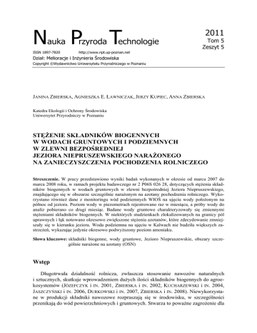 Nauka Przyroda Technologie ISSN 1897-7820 http://www.npt.up-poznan.net 2011 Tom 5 Zeszyt 5 Dział: Melioracje i Inżynieria Środowiska Copyright ©Wydawnictwo Uniwersytetu Przyrodniczego w Poznaniu JANINA ZBIERSKA, AGNIESZKA E. ŁAWNICZAK, JERZY KUPIEC, ANNA ZBIERSKA Katedra Ekologii i Ochrony Środowiska Uniwersytet Przyrodniczy w Poznaniu STĘŻENIE SKŁADNIKÓW BIOGENNYCH W WODACH GRUNTOWYCH I PODZIEMNYCH W ZLEWNI BEZPOŚREDNIEJ JEZIORA NIEPRUSZEWSKIEGO NARAŻONEGO NA ZANIECZYSZCZENIA POCHODZENIA ROLNICZEGO Streszczenie. W pracy przedstawiono wyniki badań wykonanych w okresie od marca 2007 do marca 2008 roku, w ramach projektu badawczego nr 2 P06S 026 28, dotyczących stężenia składników biogennych w wodach gruntowych w zlewni bezpośredniej Jeziora Niepruszewskiego, znajdującego się w obszarze szczególnie narażonym na azotany pochodzenia rolniczego. Wykorzystano również dane z monitoringu wód podziemnych WIOŚ na ujęciu wody położonym na północ od jeziora. Poziom wody w piezometrach rejestrowano raz w miesiącu, a próby wody do analiz pobierano co drugi miesiąc. Badane wody gruntowe charakteryzowały się zmiennymi stężeniami składników biogennych. W niektórych studzienkach zlokalizowanych na granicy pól uprawnych i łąk notowano okresowo zwiększone stężenia azotanów, które zdecydowanie zmniejszały się w kierunku jeziora. Woda podziemna na ujęciu w Kalwach nie budziła większych zastrzeżeń, wykazując jedynie okresowo podwyższony poziom amoniaku. Słowa kluczowe: składniki biogenne, wody gruntowe, Jezioro Niepruszewskie, obszary szczególnie narażone na azotany (OSN) Wstęp Długotrwała działalność rolnicza, zwłaszcza stosowanie nawozów naturalnych i sztucznych, skutkuje wprowadzeniem dużych ilości składników biogennych do agroekosystemów (JÓZEFCZYK i IN. 2001, ZBIERSKA i IN. 2002, KUCHARZEWSKI i IN. 2004, JASZCZYŃSKI i IN. 2006, DURKOWSKI i IN. 2007, ZBIERSKA i IN. 2008). Niewykorzystane w produkcji składniki nawozowe rozpraszają się w środowisku, w szczególności przenikają do wód powierzchniowych i gruntowych. Stwarza to poważne zagrożenie dla 2 Zbierska J., Ławniczak A.E., Kupiec J., Zbierska A., 2011. Stężenie składników biogennych w wodach gruntowych i podziemnych w zlewni bezpośredniej Jeziora Niepruszewskiego narażonego na zanieczyszczenia pochodzenia rolniczego. Nauka Przyr. Technol. 5, 5, #103. wód w postaci nasilenia eutrofizacji i towarzyszącej temu degradacji wód (CHERRY i IN. 2008). Zjawisko to jest szczególnie niekorzystne w odniesieniu do jezior, które retencjonują znaczne ilości składników biogennych dopływających z obszaru zlewni (BECHMANN 2005, ZBIERSKA i ŁAWNICZAK 2006). Przenikanie zanieczyszczeń do wód gruntowych stwarza również ryzyko zanieczyszczenia wód podziemnych stanowiących źródło wody pitnej. Liczne badania naukowe oraz monitoring środowiska dostarczają wielu danych o migracji zanieczyszczeń do wód powierzchniowych, natomiast słabiej rozpoznane jest zanieczyszczenie wód gruntowych pierwszego poziomu. Celem pracy jest ocena zanieczyszczenia wód gruntowych na obszarze zlewni bezpośredniej Jeziora Niepruszewskiego i ryzyka migracji składników biogennych z tymi wodami do jeziora oraz jakości wód podziemnych na ujęciu wody. Materiał i metody Badania wód gruntowych pierwszego poziomu przeprowadzono w okresie od marca 2007 do marca 2008 roku. Ze względu na ukształtowanie terenu i sposób jego użytkowania studzienki kontrolne (piezometry) zostały zlokalizowane w rynnie Jeziora Niepruszewskiego, od strony występowania pól uprawnych. Punkty badawcze znajdowały się w sześciu transektach: jeden (T1) po stronie zachodniej w części północnej Jeziora Niepruszewskiego (przy dopływie rzeki Samicy Stęszewskiej), a pięć (T2-T6) po stronie wschodniej równomiernie wzdłuż linii brzegowej od Więckowic do Zborowa (rys. 1). W każdym transekcie usytuowano po dwa lub trzy piezometry, w zależności od szerokości pasa łąk: pierwszy (1 – brzeg) w linii brzegowej jeziora (na granicy łąk i szuwarów), drugi (2 – łąka) w środkowej części pasa łąk, trzeci (3 – miedza) na granicy pól uprawnych i łąk. Odległość między studzienkami wynosiła od 35 do 60 m. Poziom wody gruntowej w piezometrach rejestrowano raz w miesiącu, natomiast w jeziorze codziennie. Próby wody do analiz pobierano co drugi miesiąc. W wodach gruntowych standardowymi metodami oznaczano stężenie jonu amonowego, azotanów, azotynów, fosforanów rozpuszczonych, fosforu całkowitego, potasu oraz przewodność elektrolityczną właściwą i odczyn wody. Próby wody analizowano w laboratorium Katedry Ekologii i Ochrony Środowiska Uniwersytetu Przyrodniczego w Poznaniu. W pracy wykorzystano również dane z monitoringu wód podziemnych WIOŚ na ujęciu wody położonym na północ od jeziora. Ocenę jakości wód podziemnych wykonano na podstawie Rozporządzenia Ministra Środowiska z dnia 11.02.2004 r. w sprawie klasyfikacji wód, sposobu prowadzenia monitoringu oraz sposobu interpretacji wyników i prezentacji wód powierzchniowych i podziemnych (ROZPORZĄDZENIE... 2004 b). 3 Zbierska J., Ławniczak A.E., Kupiec J., Zbierska A., 2011. Stężenie składników biogennych w wodach gruntowych i podziemnych w zlewni bezpośredniej Jeziora Niepruszewskiego narażonego na zanieczyszczenia pochodzenia rolniczego. Nauka Przyr. Technol. 5, 5, #103. Rys. 1. Rozmieszczenie punktów badania wody gruntowej w zlewni Jeziora Niepruszewskiego Fig. 1. Location of research points of ground water in the Niepruszewskie Lake catchment Wyniki Poziom wód gruntowych i wody w jeziorze Pomiary stanów wody gruntowej w studzienkach kontrolnych oraz wody w jeziorze Niepruszewskim wykazały regularne zmiany położenia lustra wody w ciągu roku (rys. 2). Poziom wody uzależniony był od warunków meteorologicznych i przebiegu wegetacji. Opady zimowe i wiosenne przyczyniały się do podniesienia poz